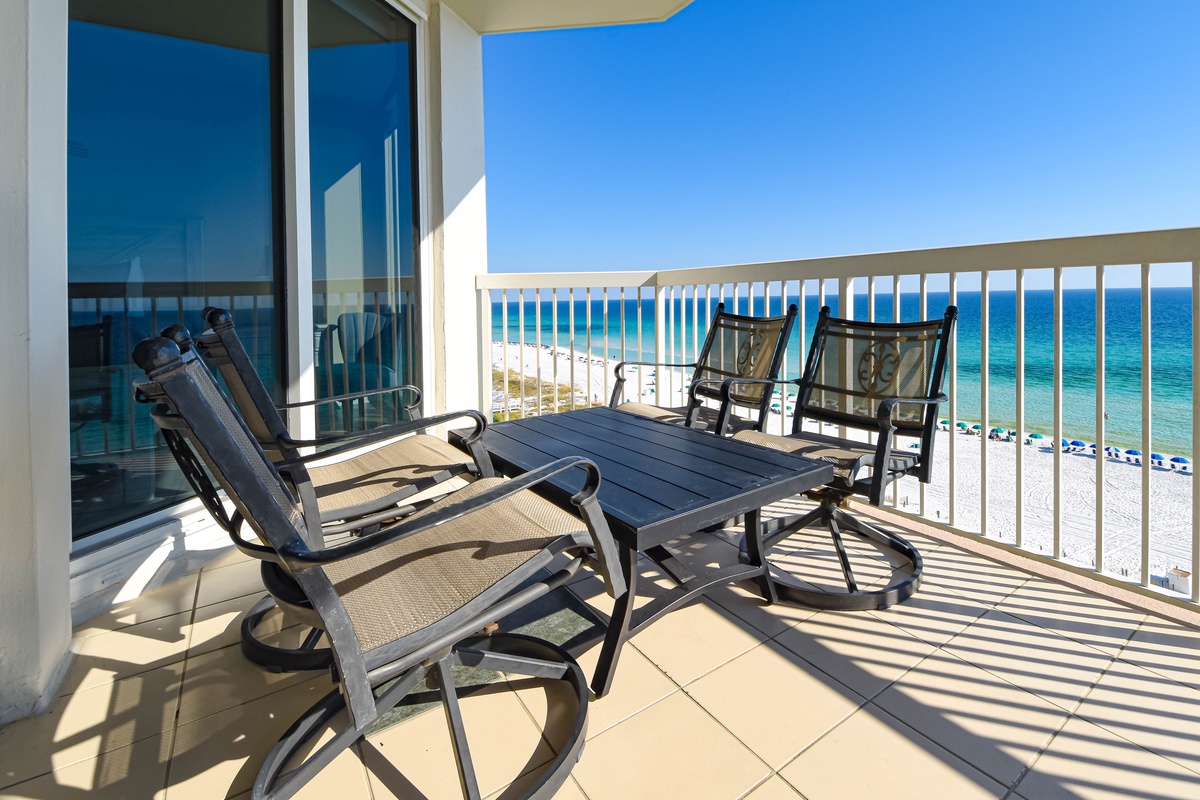 East 802 offers an elegant, seaside feel with tile flooring and an inviting open-concept living area. You’ll find the perfect space for family and friends to relax together around the large flat-screen TV. The south wall has floor-to-ceiling windows that open directly onto the furnished beachfront balcony. The dining area offers seating for four with two additional seats at the breakfast bar. The fully equipped kitchen features full-size appliances and includes all the cookware and dishware needed to create memorable meals together. Just off the kitchen is the laundry area equipped with a full-size washer and dryer so you can keep your clothing and beach towels clean and dry throughout your stay. To accommodate larger parties, the living area is equipped with a full sleeper sofa. For added convenience this condo offers secure WIFI.
