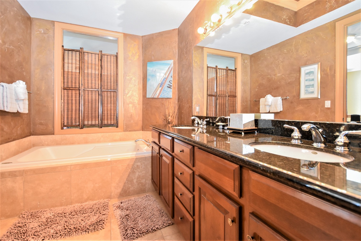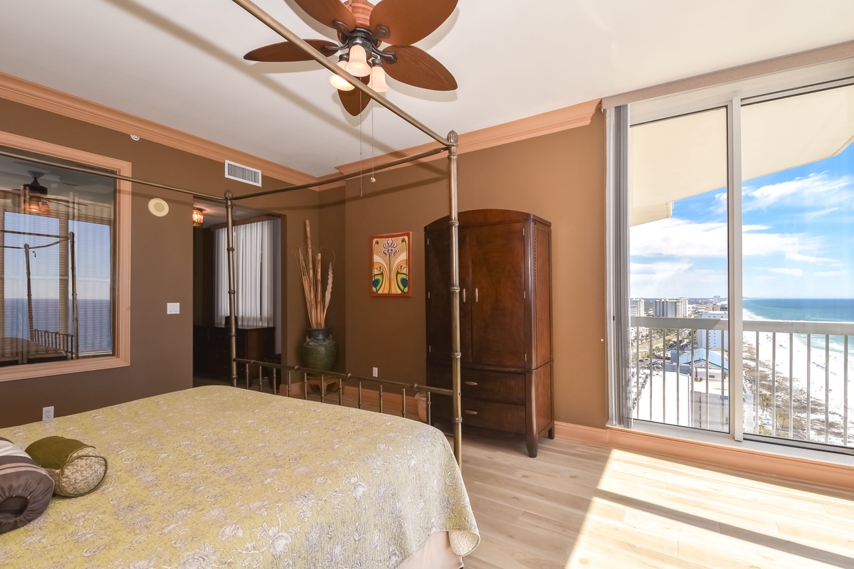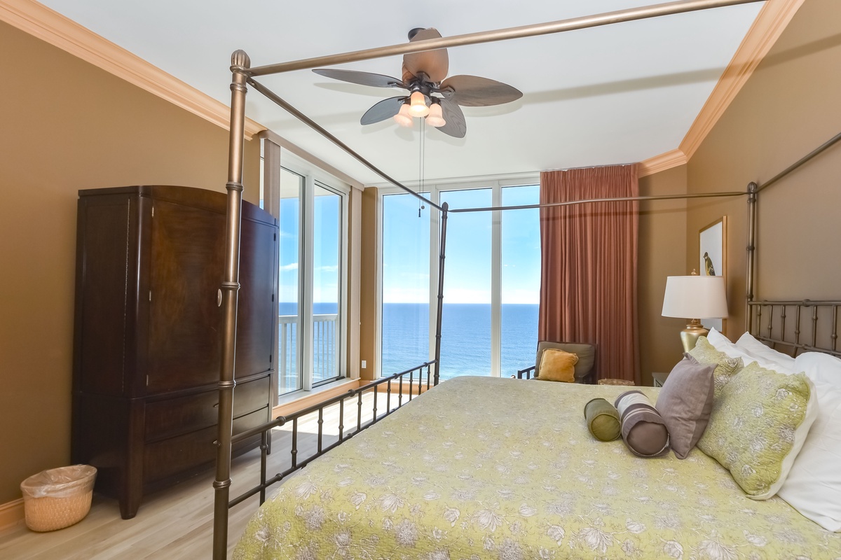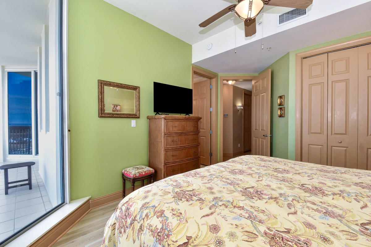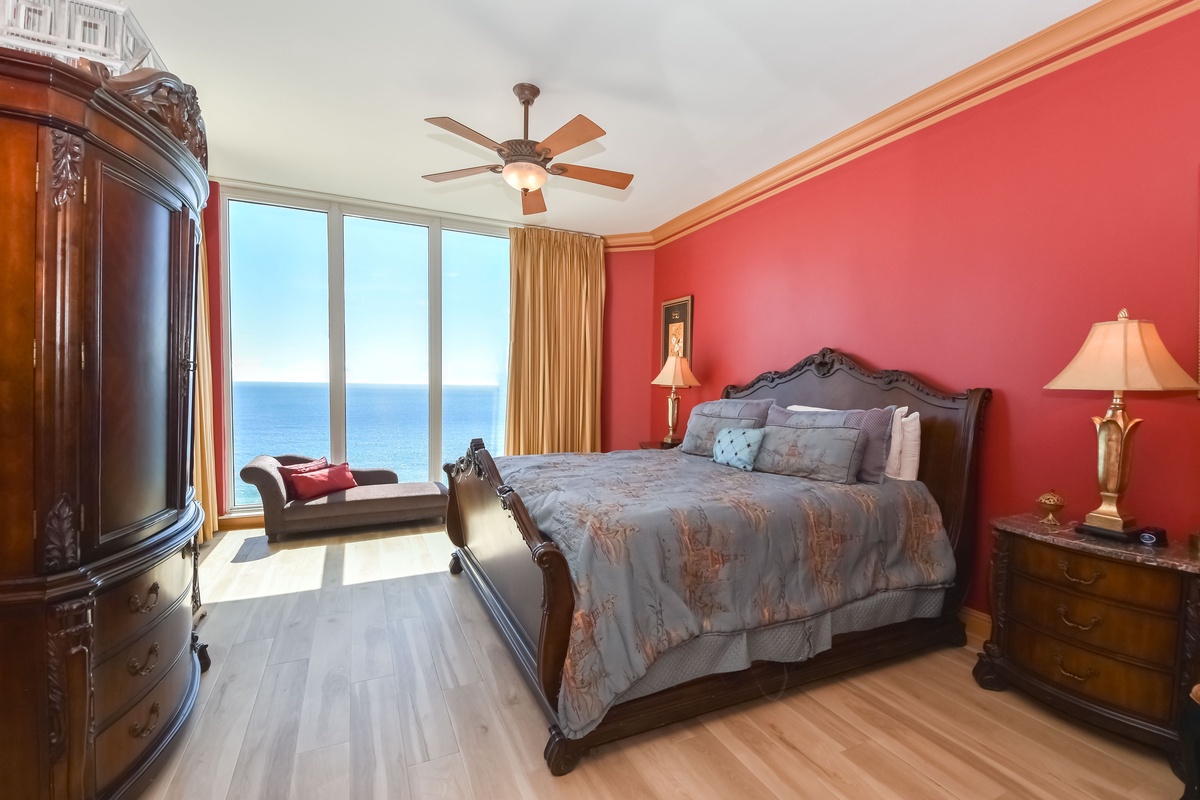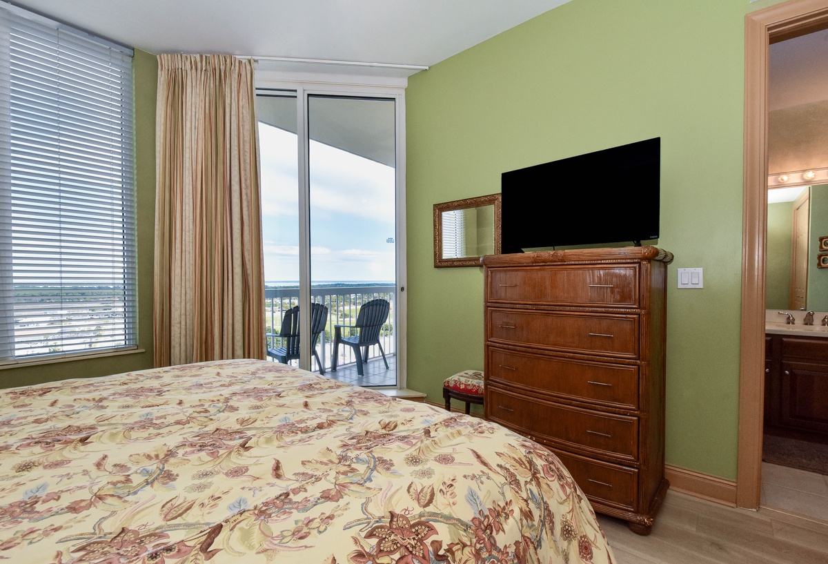 The first-floor primary bedroom has a king bed, walk-in closet, flat-screen TV, and private access to the seventeenth-floor beachfront balcony. The primary bathroom features a whirlpool bathtub, walk-in shower, and double vanity. The first-floor guest bedroom has a king bed and access to the seventeenth-floor north balcony overlooking the greater Destin area. This guest bedroom has a private bathroom with a tub/shower combination.