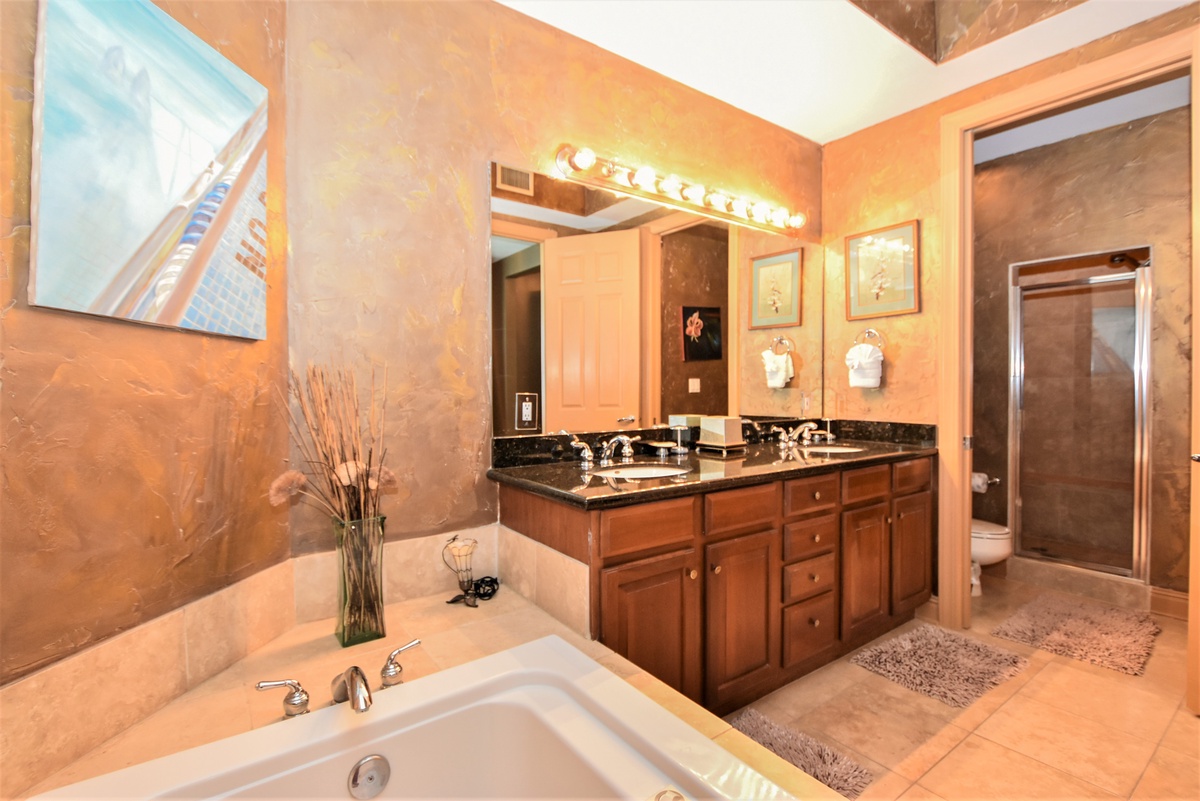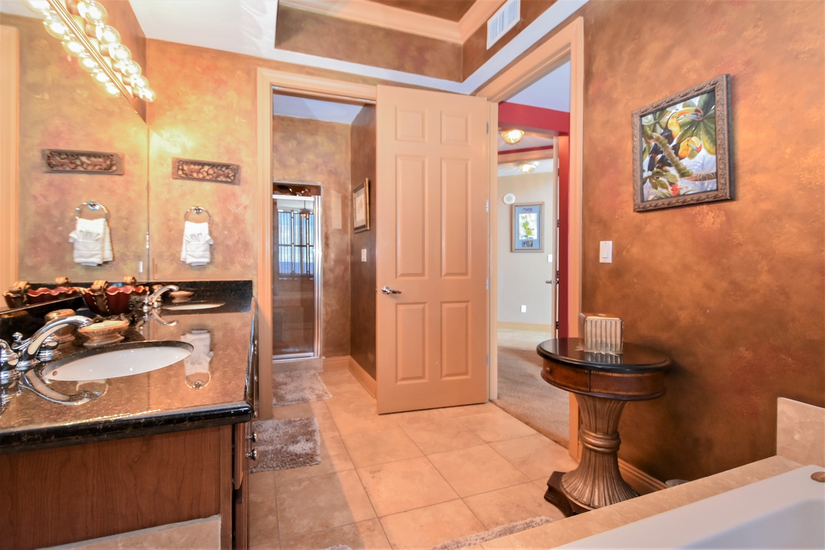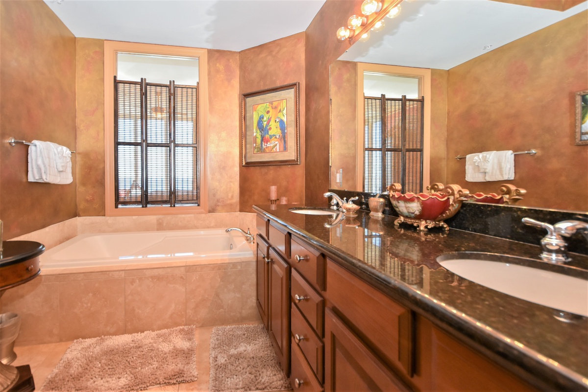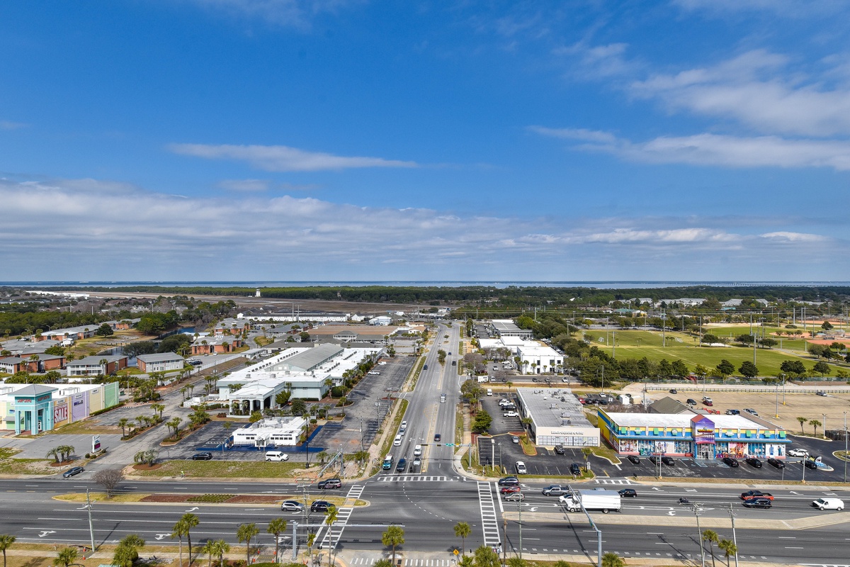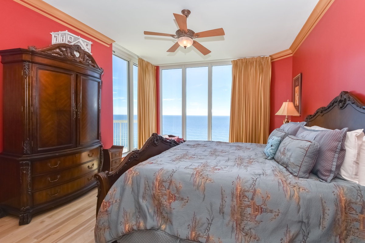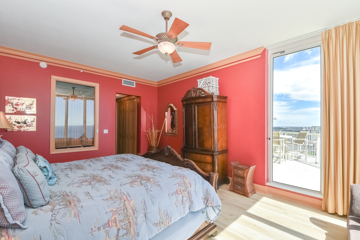 The first-floor primary bedroom has a king bed, walk-in closet, flat-screen TV, and private access to the seventeenth-floor beachfront balcony. The primary bathroom features a whirlpool bathtub, walk-in shower, and double vanity. The first-floor guest bedroom has a king bed and access to the seventeenth-floor north balcony overlooking the greater Destin area. This guest bedroom has a private bathroom with a tub/shower combination.