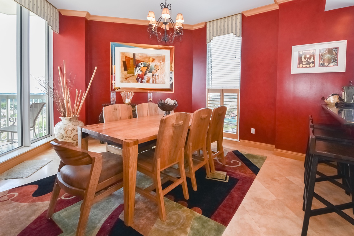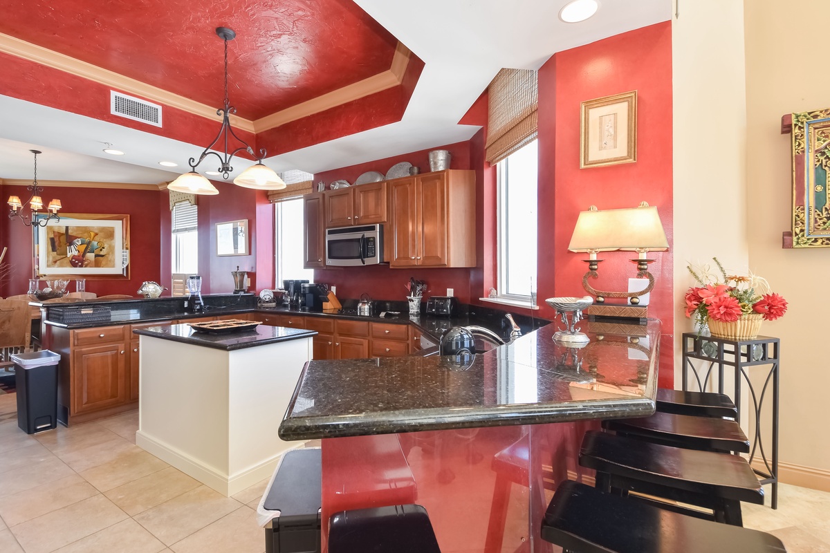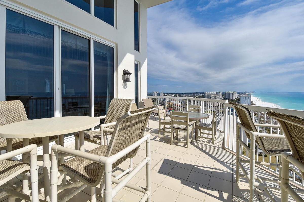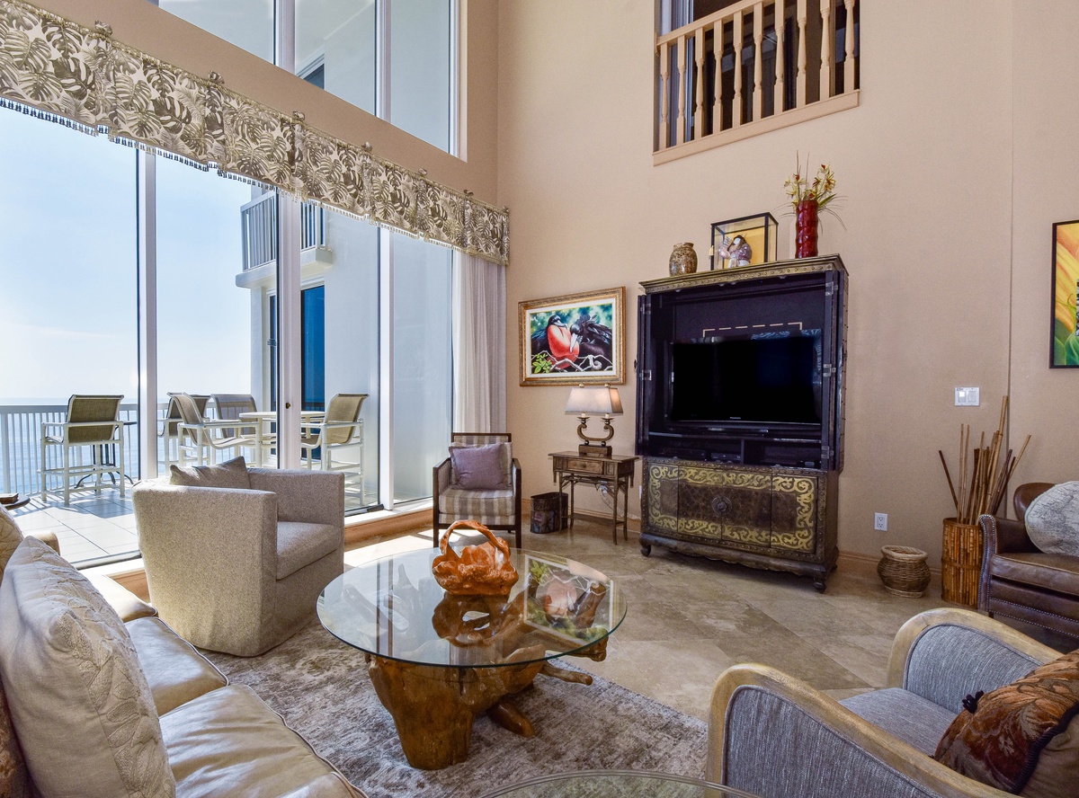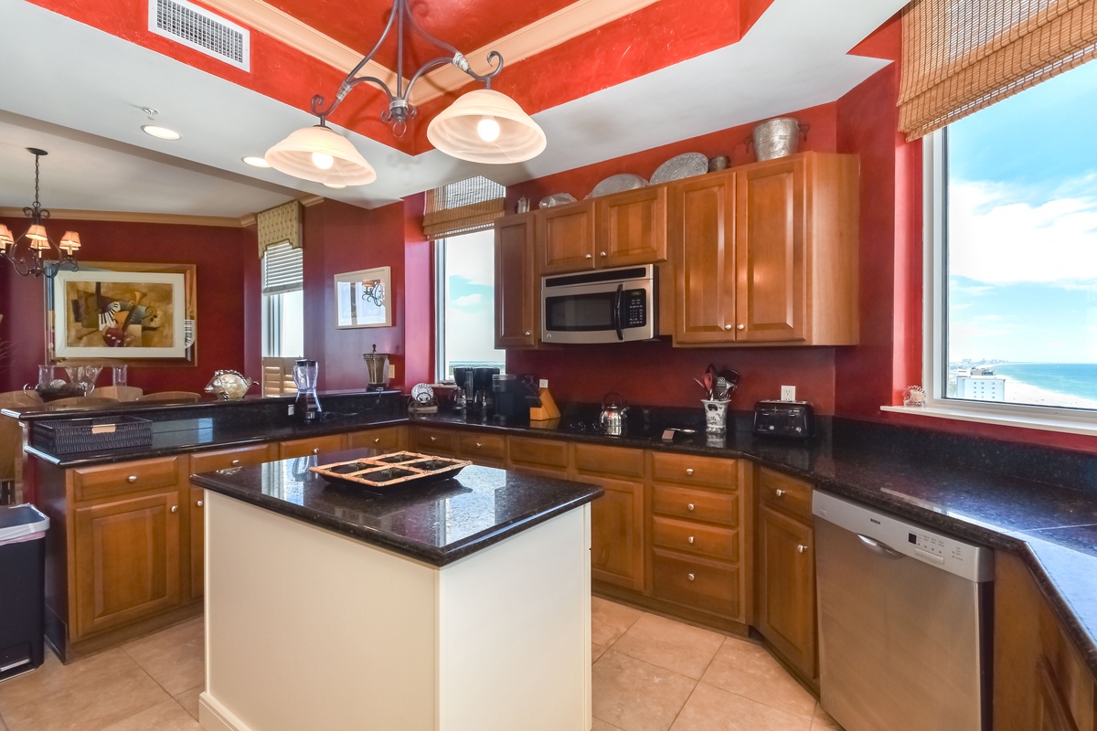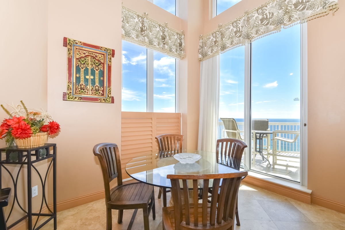 East Penthouse 1701 offers a warm, tropical feel with an inviting open-concept living area and decor fit for a beach vacation. You’ll find the perfect space for family and friends to relax together around the large flat-screen TV. The south wall has floor-to-ceiling windows that open directly onto the expansive, furnished, seventeenth-floor beachfront balcony. There are three expansive balconies with plenty of room for entertaining featuring panoramic views of boats and dolphins as they pass. The dining area offers seating for four. The formal dining room offers seating for six. There is even additional seating for seven at the Breakfast Bar! The nearby fully equipped gourmet kitchen features full-size stainless-steel appliances, granite countertops, and includes all the cookware and dishware needed to create memorable meals together.