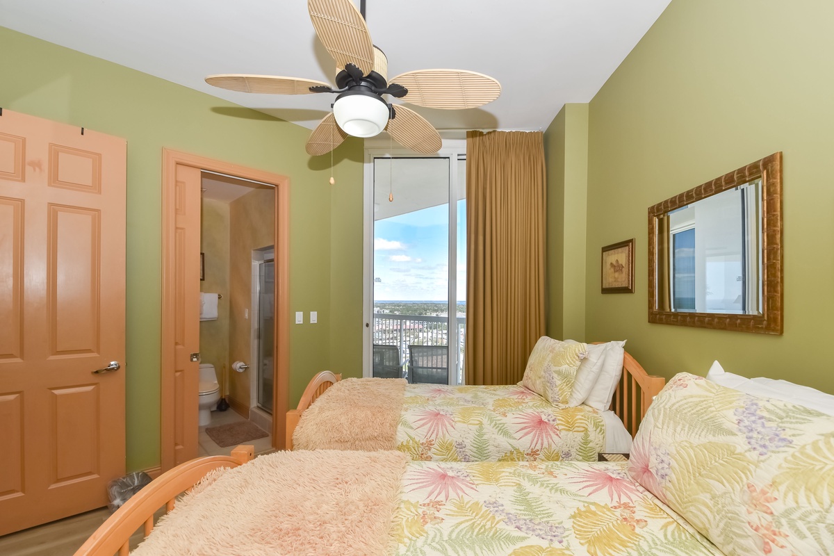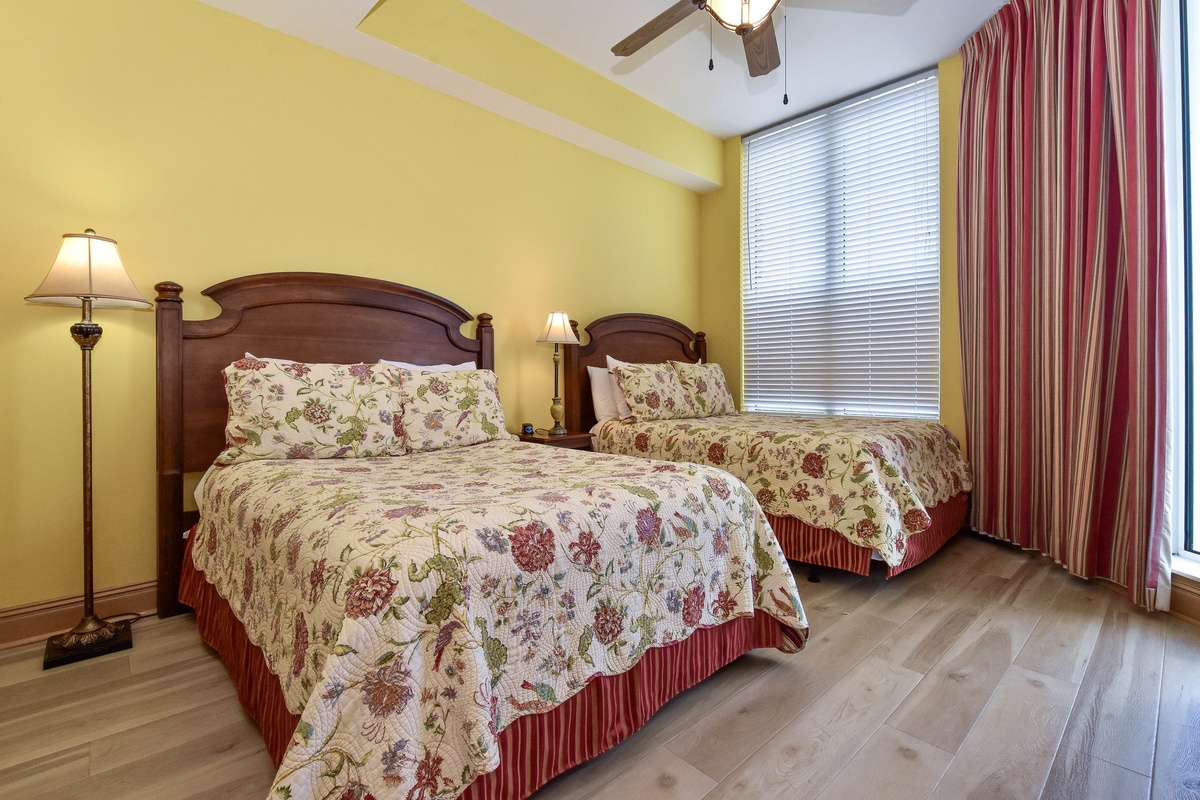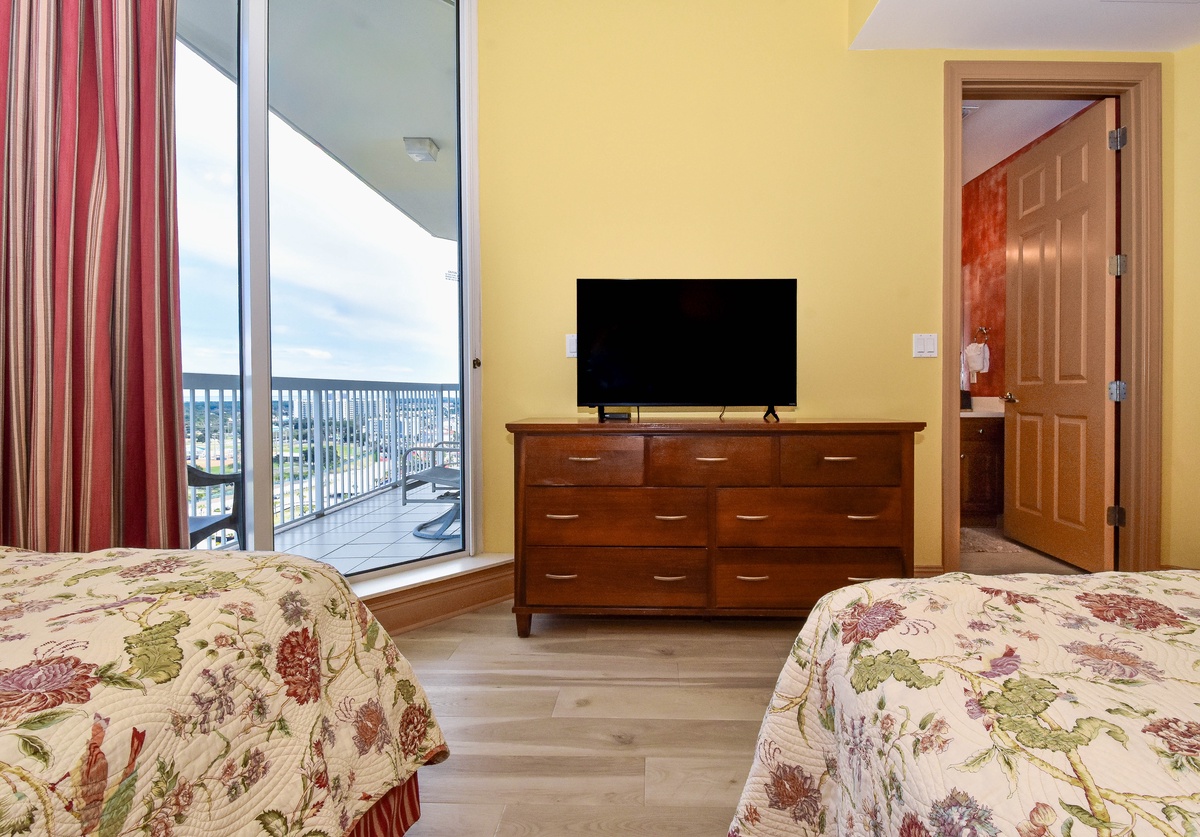 Two primary suites offer a perfect getaway for large family gatherings. The second master suite is located on the second floor of this beachfront penthouse. The second-floor primary bedroom features a king bed, flat-screen TV, and private access to the eighteenth-floor beachfront balcony. The primary bathroom has a whirlpool bathtub, walk-in shower, and dual vanity. The second guest bedroom has two double beds, private access to the eighteenth-floor north balcony, and a private bathroom with a tub/shower combination. The third guest bedroom has two twin beds and private access to the eighteenth-floor north balcony. Just steps from this guest bedroom and the second-floor media room is a bathroom with a walk-in shower. The upstairs media room is perfect for the whole family and features a queen sleeper sofa, large TV with DVD player, and nearby laundry room.