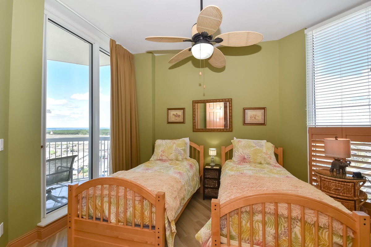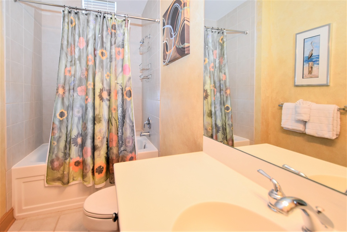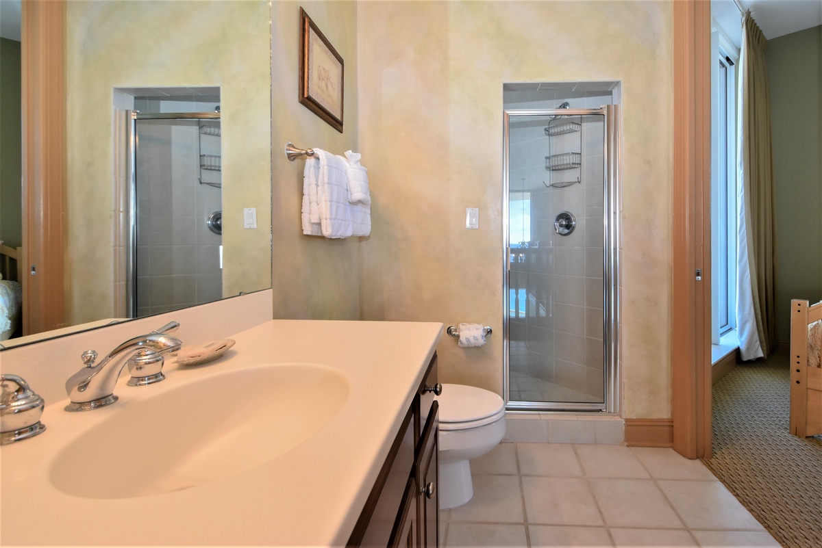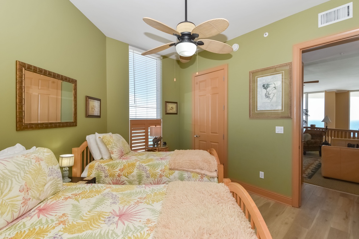 Two primary suites offer a perfect getaway for large family gatherings. The second master suite is located on the second floor of this beachfront penthouse. The second-floor primary bedroom features a king bed, flat-screen TV, and private access to the eighteenth-floor beachfront balcony. The primary bathroom has a whirlpool bathtub, walk-in shower, and dual vanity. The second guest bedroom has two double beds, private access to the eighteenth-floor north balcony, and a private bathroom with a tub/shower combination. The third guest bedroom has two twin beds and private access to the eighteenth-floor north balcony. Just steps from this guest bedroom and the second-floor media room is a bathroom with a walk-in shower. The upstairs media room is perfect for the whole family and features a queen sleeper sofa, large TV with DVD player, and nearby laundry room.