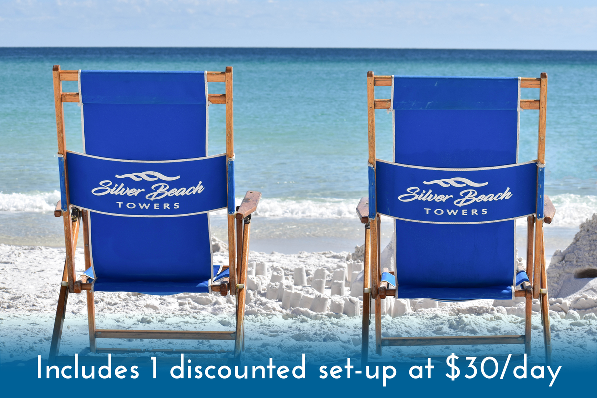 Silver Beach Towers provides beach service set-ups (2 chairs, 1 umbrella) for a fee through a third party from March 1 - October 31 that can be reserved at $65 per day each. Reservations for the beach service can be made once your Compass Resorts reservation is confirmed, and detailed instructions will be sent to you.