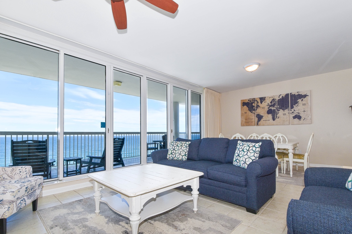 Welcome to Silver Beach Towers West 1603, a comfortable three-bedroom, three-bathroom beachfront condo located on the 16th floor, offering stunning views of the Gulf. This vacation rental features a spacious open-concept living area with floor-to-ceiling windows, a large flat-screen TV, and a fully equipped kitchen with full-size appliances, cookware, and dishware. Step out onto the furnished beachfront balcony to relax and take in the sea breeze. The primary suite includes a king bed, walk-in closet, private balcony access, and an en-suite bathroom with a soaking tub, tiled walk-in shower, and double vanity. One guest bedroom offers a queen bed, flat-screen TV, and a private bathroom with a tub and shower combination. The second guest bedroom also has a queen bed and flat-screen TV, with a full bathroom and walk-in shower just steps away. For added convenience, the condo includes complimentary Wi-Fi, an in-unit washer and dryer, and additional sleeping accommodations with a queen sleeper sofa in the living area. While staying in this unit, you'll also enjoy access to resort amenities including two beachfront pools, hot tubs, tennis courts, and direct beach access, with seasonal beach service available at a discounted daily rate. Silver Beach Towers West 1603 provides everything you need for a wonderful beach getaway!