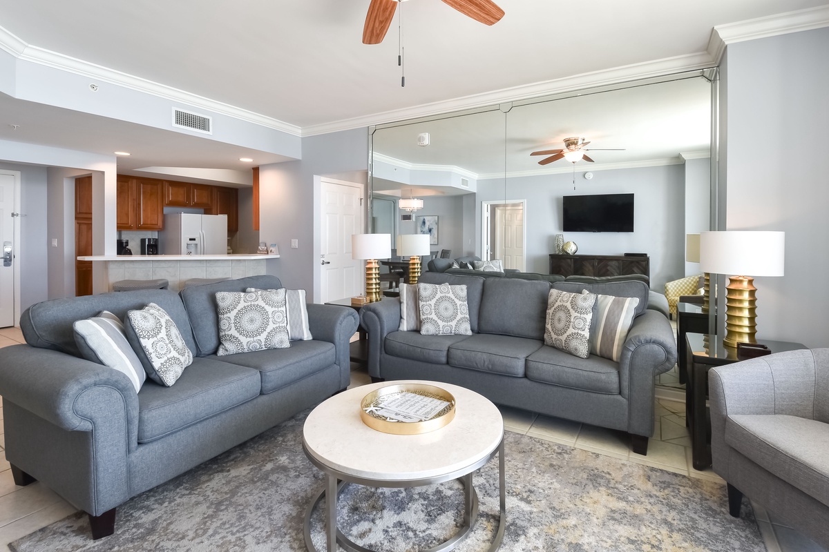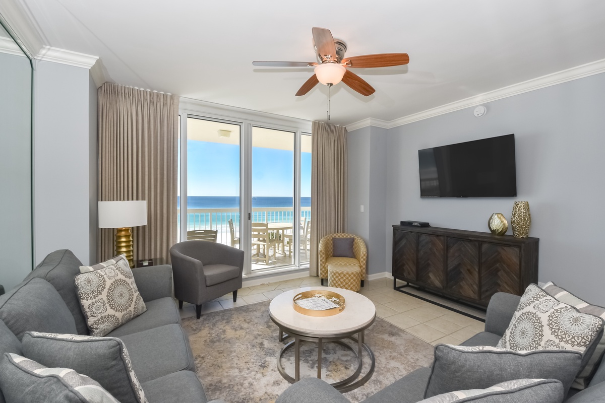 Welcome to Silver Beach Towers West 402, a beautifully upgraded two-bedroom, two-bathroom beachfront retreat located on the fourth floor. Perfectly positioned in the heart of Destin, this condo offers breathtaking Gulf views along with easy access to the area’s top dining, shopping, and sightseeing. Step inside to an inviting open-concept living area with a modern feel and thoughtful design touches. The spacious living area is ideal for gathering with family and friends to enjoy movie nights on the large flat-screen TV, and the couch converts to a queen sleeper sofa to accommodate additional guests. Floor-to-ceiling windows along the south wall open directly onto the furnished beachfront balcony, creating a seamless indoor-outdoor experience while filling the space with natural light and stunning Gulf views. The fully equipped kitchen features full-size appliances, custom cabinetry, Corian countertops, and all the cookware and dishware needed to prepare meals with ease. Enjoy meals together at the dining table with seating for four, plus two additional chairs at the breakfast bar, perfect for both casual breakfasts and relaxed dinners. The primary suite offers a peaceful retreat with a king bed, flat-screen TV, walk-in closet, and access to the beachfront balcony. The en-suite bathroom features a soaking tub, a walk-in shower with a built-in bench, and a double vanity. The guest bedroom includes a king bed, a TV, and private access to the beachfront balcony. A full guest bathroom with a walk-in shower is conveniently located just steps from both the guest bedroom and the living area. For added convenience, this condo includes complimentary Wi-Fi, a queen sleeper sofa, and an in-unit washer and dryer, making longer stays effortless. From morning coffee overlooking the Gulf to peaceful evenings on the balcony, Silver Beach Towers West 402 is the perfect place to unwind and create lasting beach memories.
