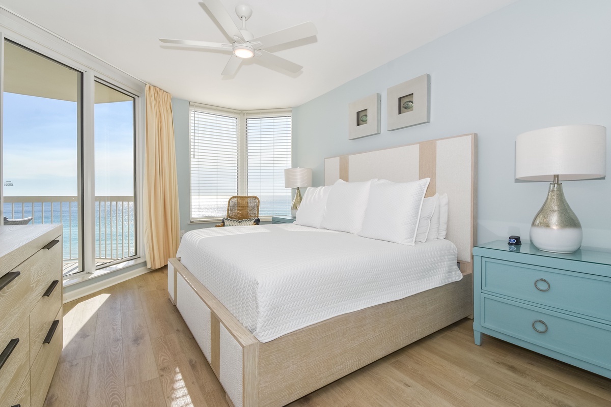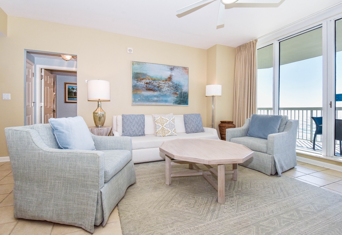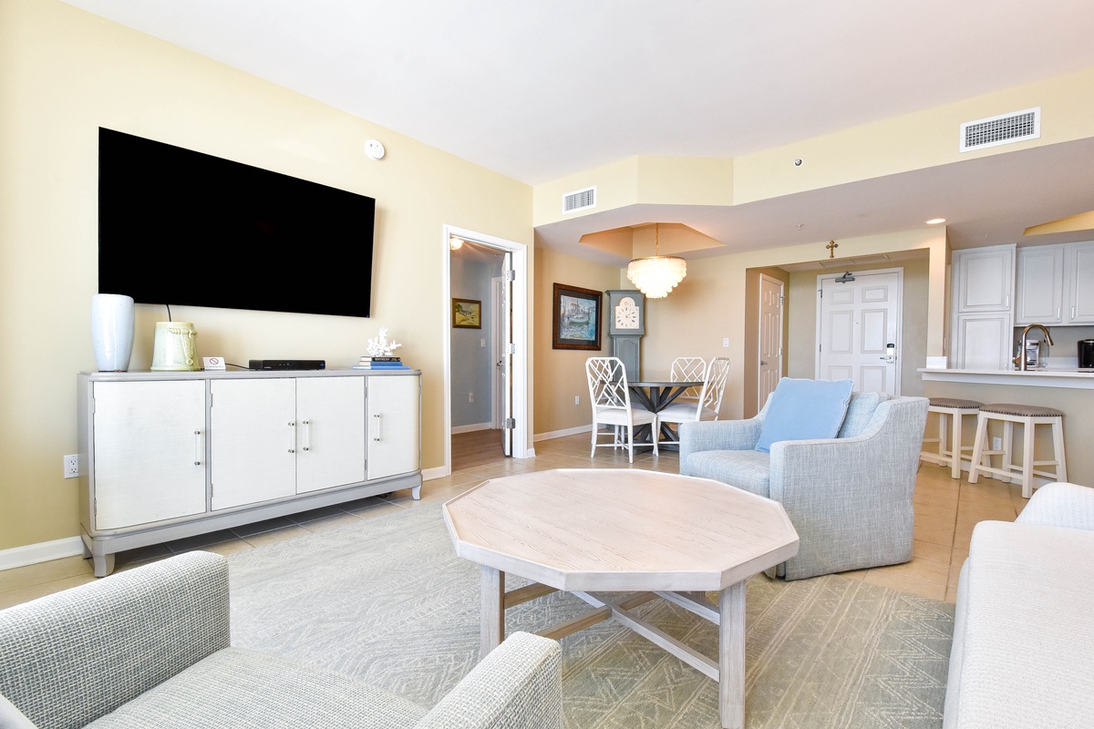 Relax in Silver Beach Towers West 702, a beautifully appointed two-bedroom, two-bathroom Destin beachfront vacation rental located on the seventh floor. Designed with contemporary coastal furniture and soft hues of blue throughout, this Gulf-front condo creates a calming, beach-inspired atmosphere while showcasing stunning Gulf views from the living area, bedrooms, and private beachfront balcony. Floor-to-ceiling windows along the south wall open directly onto the furnished balcony, filling the space with natural light and creating a seamless indoor-outdoor living experience. The bright, open living area features clean-lined contemporary coastal furnishings, soothing blue accents, and a large flat-screen TV, perfect for unwinding after a day on the beach or gathering with family and friends. The fully equipped kitchen offers full-size stainless-steel appliances, along with all the cookware and dishware needed to prepare meals with ease. Adjacent to the kitchen, the dining area comfortably seats four, with two additional seats at the breakfast bar. Unwind in the primary bedroom, a peaceful coastal retreat features a plush king bed, flat-screen TV, walk-in closet, and direct access to the beachfront balcony. The primary bathroom includes a bathtub, tiled walk-in shower with bench, and a double vanity. The guest bedroom also offers a plush king bed, flat-screen TV, and balcony access, continuing the home’s relaxed coastal feel. Additional sleeping accommodations include a sleeper sofa in the living area, allowing the condo to comfortably sleep up to six guests. A guest bathroom with a walk-in shower is conveniently located near the guest bedroom and living area. Enjoy complimentary Wi-Fi, an in-unit washer and dryer, and all the comforts needed for an extended stay. Whether you’re planning a family getaway or a relaxing escape, Silver Beach Towers West 702 offers the ideal blend of style, comfort, and location among Destin beachfront vacation rentals.