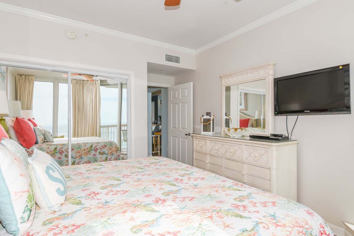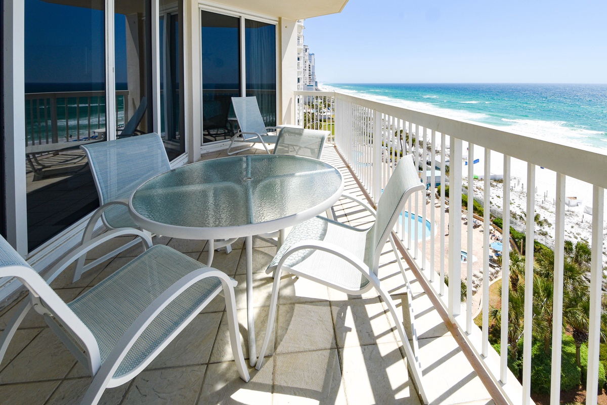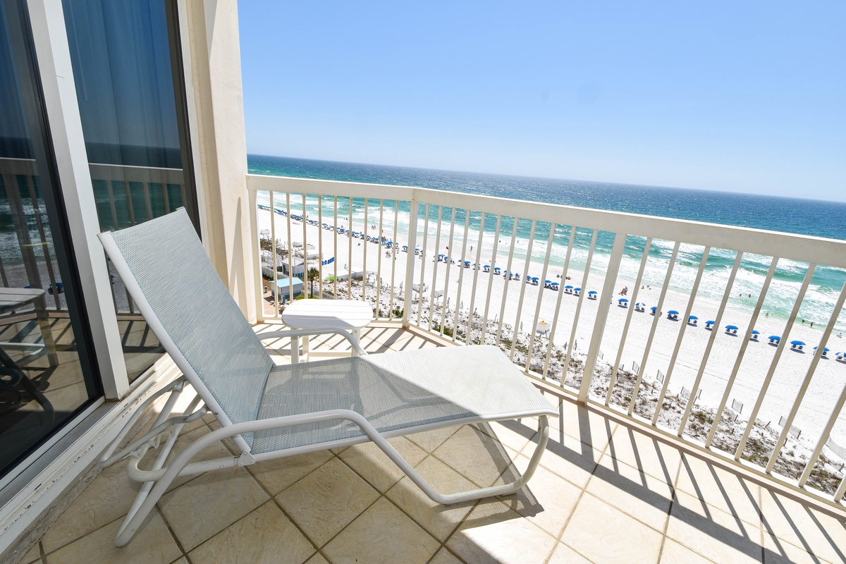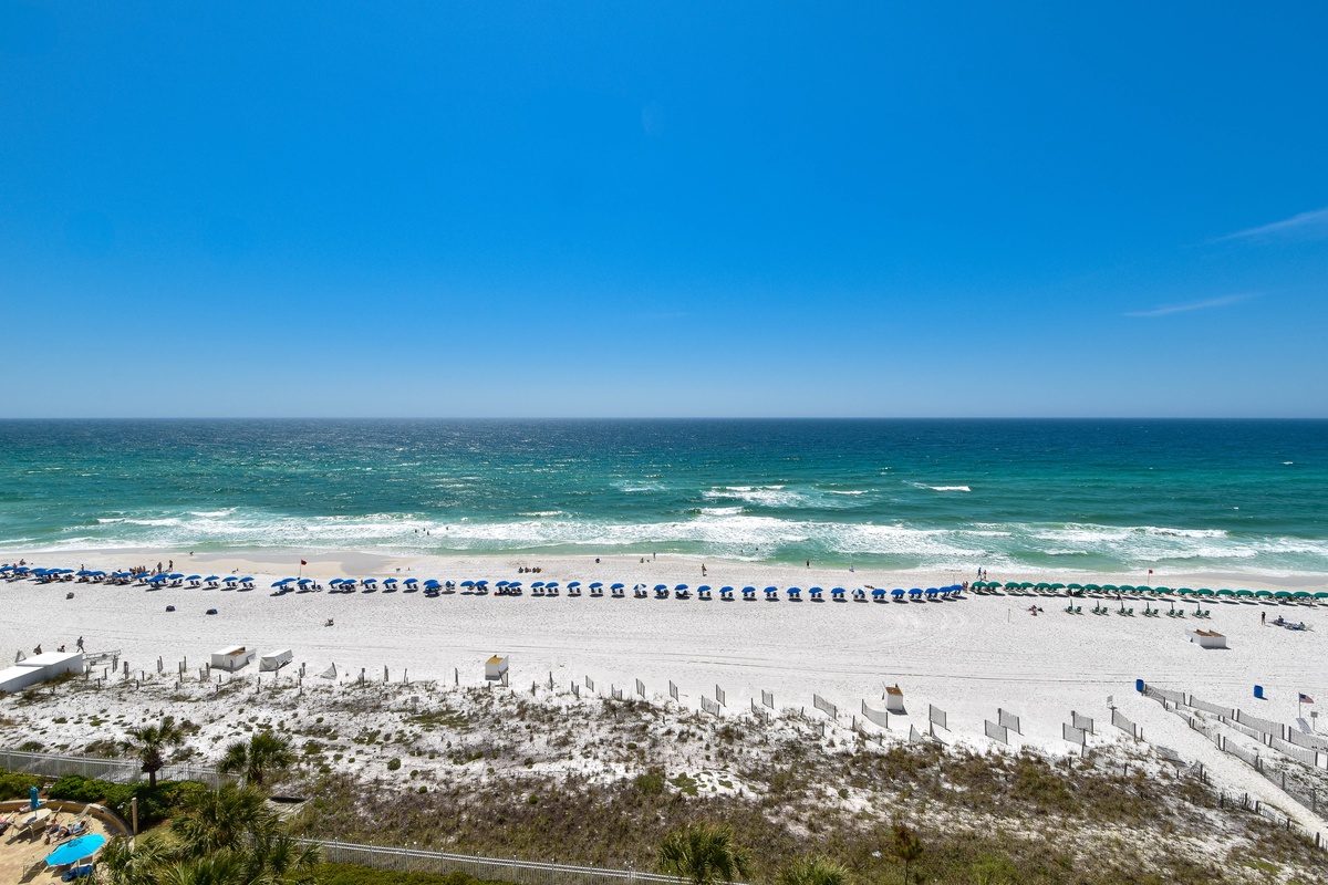 Escape to Silver Beach Towers West 805, a beautiful two-bedroom, two-bathroom beachfront retreat located on the eighth floor. This condo offers breathtaking Gulf views and easy access to Destin’s finest dining, shopping, and entertainment. Step inside to a bright, open-concept living area designed for comfort and connection. The living space features a 60-inch wall-mounted flat-screen TV and cozy seating. Floor-to-ceiling windows along the south wall open directly onto the furnished beachfront balcony, creating a seamless indoor-outdoor experience. The dining area offers seating for four, with two additional seats at the breakfast bar. The fully equipped kitchen features full-size stainless-steel appliances, granite countertops, all necessary cookware and dishware, a Keurig, and a programmable coffee maker. The primary bedroom provides a peaceful retreat with a king bed, wall-mounted flat-screen TV, walk-in closet, and access to the beachfront balcony. The en-suite primary bathroom includes a large soaker tub, tiled walk-in shower with built-in bench, and double vanity. The guest bedroom also features a king bed, wall-mounted flat-screen TV, and balcony access. A full guest bathroom with a walk-in shower is located just steps from the guest bedroom and living area. For added convenience, the condo includes a full-size washer and dryer, complimentary Wi-Fi, and a queen sleeper sofa to accommodate additional guests. From morning coffee on the balcony to relaxing evenings watching the Gulf waves, Silver Beach Towers West 805 is the perfect destination for your next Destin getaway.