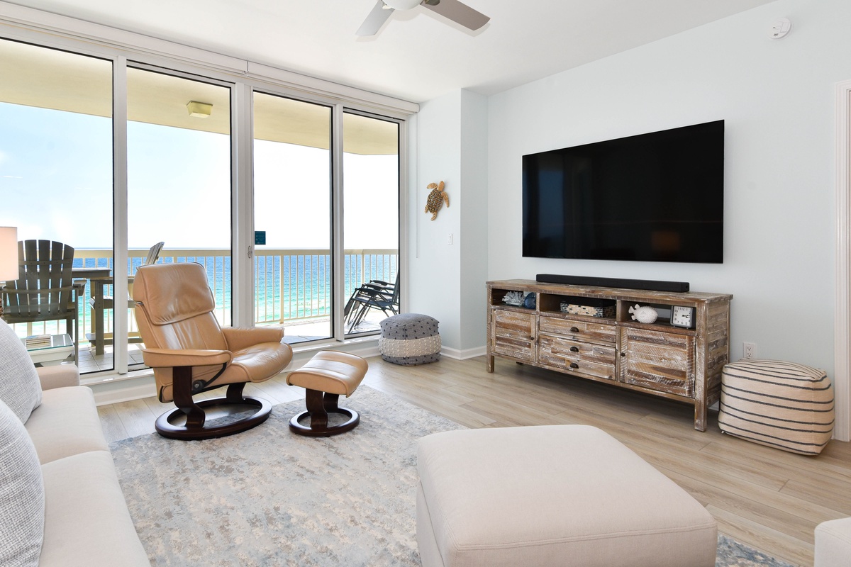 Escape to Silver Beach Towers West 902, a beautiful modern coastal two-bedroom, two-bathroom beachfront retreat located on the ninth floor. This condo offers breathtaking Gulf views and easy access to Destin’s finest dining, shopping, and entertainment. Step inside to a bright, open-concept living area designed for comfort and connection. The living space features a 75-inch wall-mounted flat-screen TV with sound bar and cozy seating including a recliner. Floor-to-ceiling windows along the south wall open directly onto the furnished beachfront balcony, creating a seamless indoor-outdoor experience. The dining area offers seating for four, with two additional seats at the breakfast bar. The fully equipped kitchen features full-size stainless-steel appliances, granite countertops, and all necessary cookware and dishware to whip up a delicious meal. The primary bedroom provides a peaceful retreat with a king bed, wall-mounted flat-screen TV, walk-in closet, and access to the beachfront balcony. The spa-like en-suite includes a large soaker tub, tiled walk-in shower with built-in bench, and double vanity. The guest bedroom also features a king bed, TV, and balcony access. A full guest bathroom with a walk-in shower is located just steps from the guest bedroom and living area. For added convenience, the condo includes a full-size washer and dryer, complimentary Wi-Fi, and a queen sleeper sofa to accommodate up to six guests comfortably. From morning coffee on the balcony to relaxing evenings watching the Gulf waves, Silver Beach Towers West 902 is the perfect destination for your next Destin getaway.