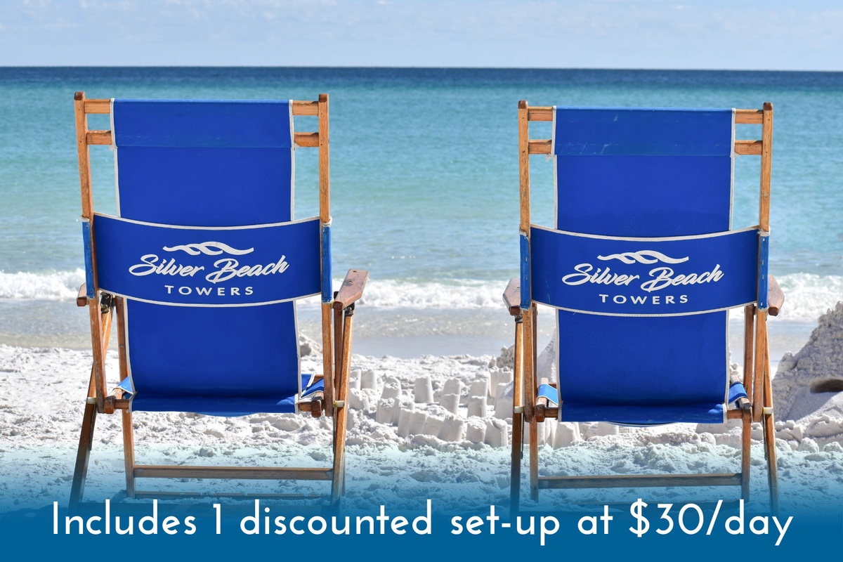 Silver Beach Towers provides beach service set-ups (2 chairs and 1 umbrella) for a fee through a third party from March 1 to October 31. The first set-up for guests of this condo is available at a discounted rate of $30 per day, with additional set-ups available for $65 per day. Beach service reservations can be made once your Compass Resorts reservation is confirmed, and detailed instructions will be sent to you.