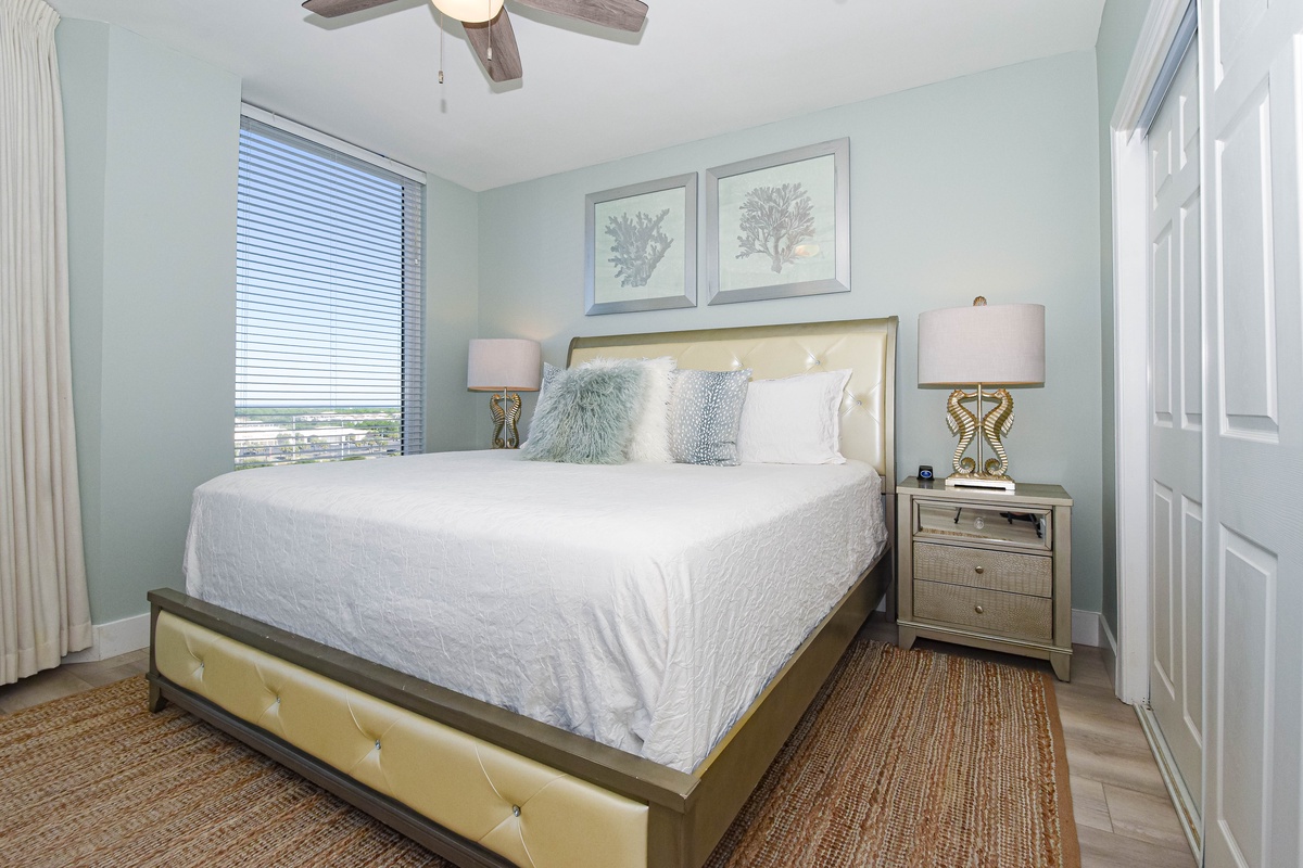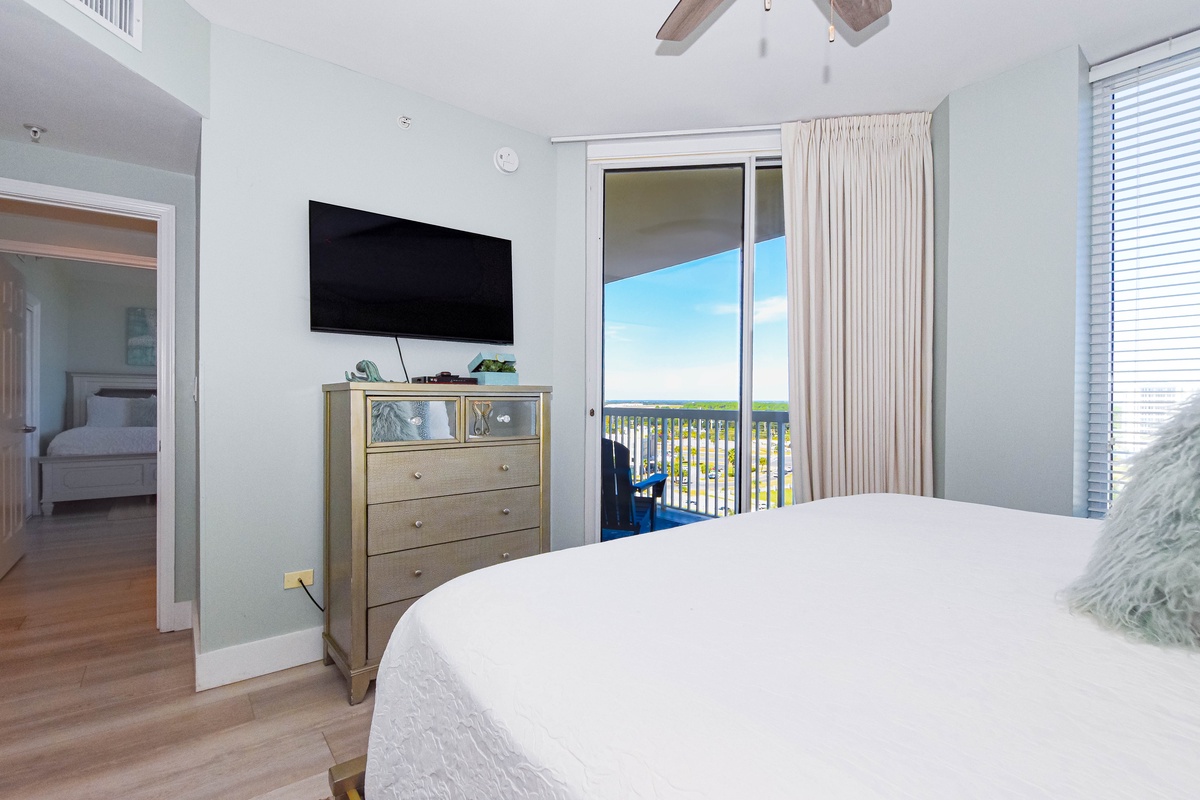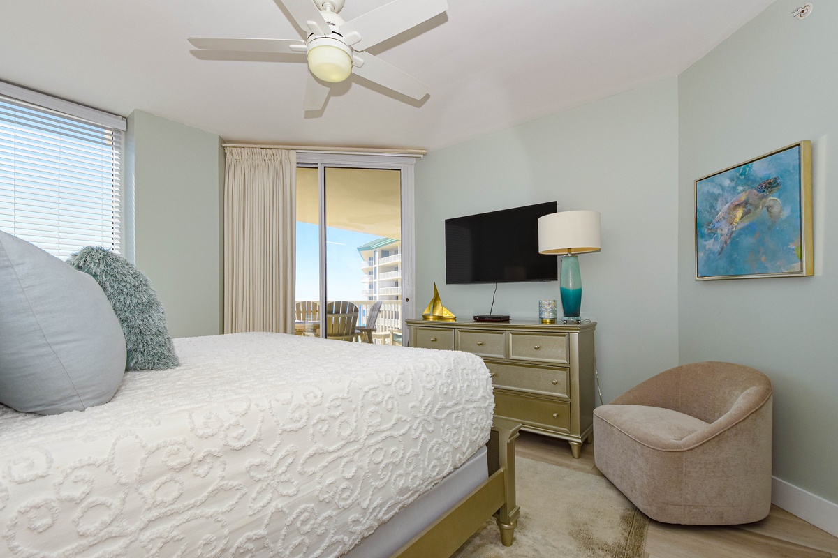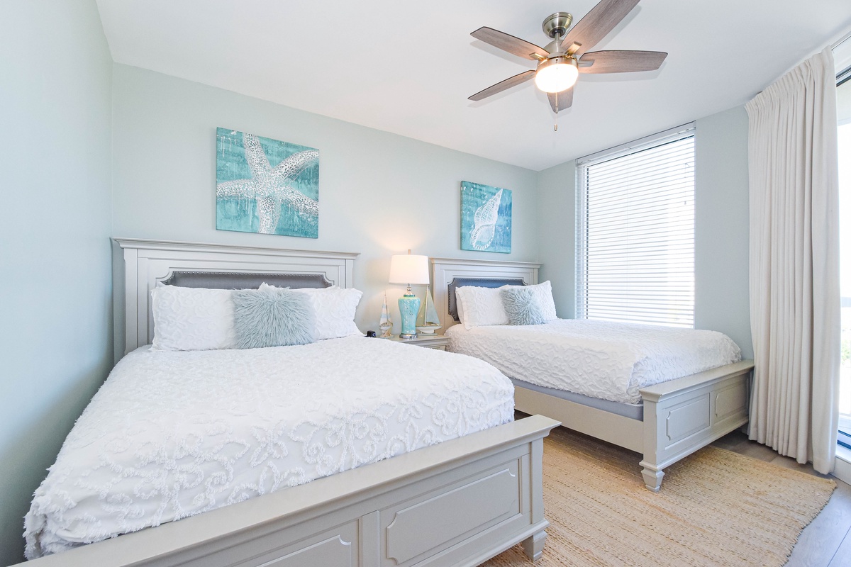 The master bedroom has incredible beach views and private access to the beachfront balcony. Complete with a king bed, flat-screen TV, walk-in closet, and private ensuite bathroom, the master bedroom was designed with relaxation in mind. The master bathroom features a jetted tub, tiled walk-in shower, and plenty of vanity space. Both guest bedrooms face the north side of the resort and offer unbeatable views of the resort grounds. The first guest bedroom has a king bed, flat-screen TV, and private access to the north balcony. The second guest bedroom has two queen beds, a flat-screen TV, and private access to the north balcony. Just a few steps from the two guest bedrooms and the living area is a full bathroom with a walk-in shower.