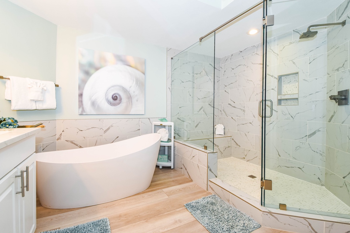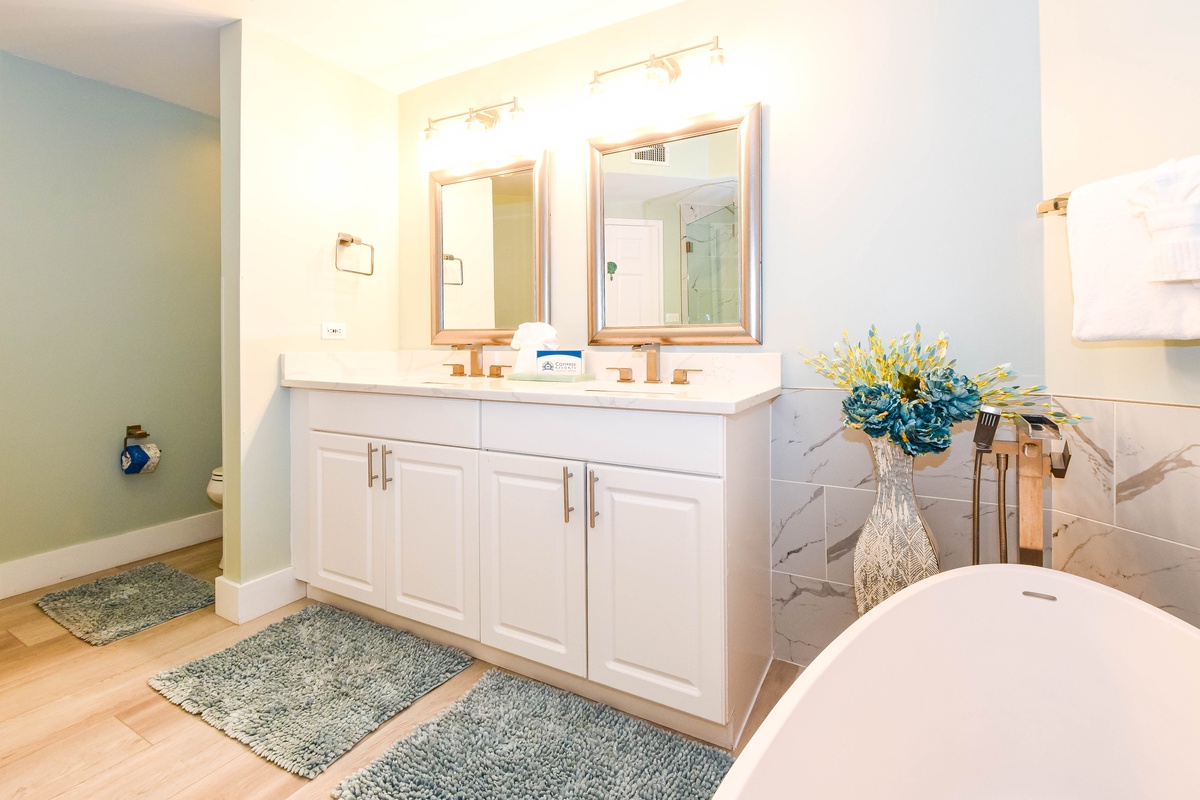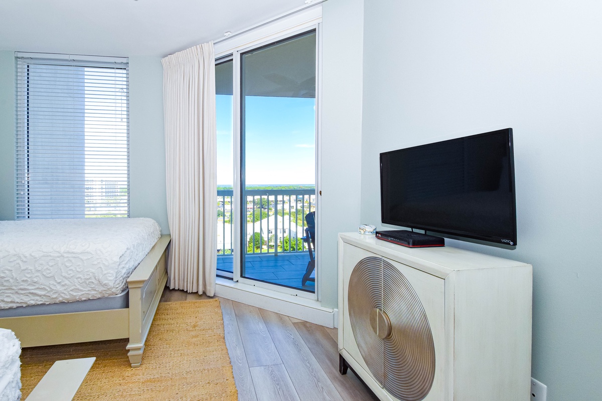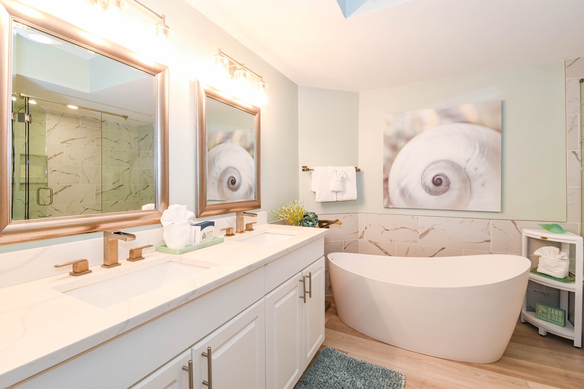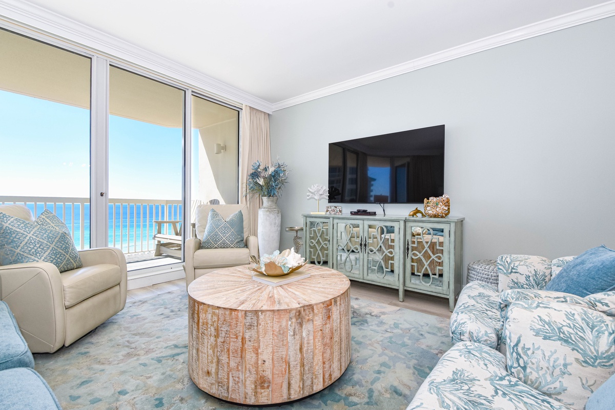 The master bedroom has incredible beach views and private access to the beachfront balcony. Complete with a king bed, flat-screen TV, walk-in closet, and private ensuite bathroom, the master bedroom was designed with relaxation in mind. The master bathroom features a jetted tub, tiled walk-in shower, and plenty of vanity space. Both guest bedrooms face the north side of the resort and offer unbeatable views of the resort grounds. The first guest bedroom has a king bed, flat-screen TV, and private access to the north balcony. The second guest bedroom has two queen beds, a flat-screen TV, and private access to the north balcony. Just a few steps from the two guest bedrooms and the living area is a full bathroom with a walk-in shower.
