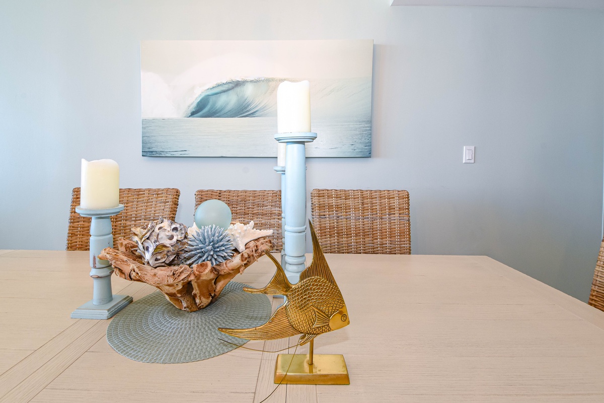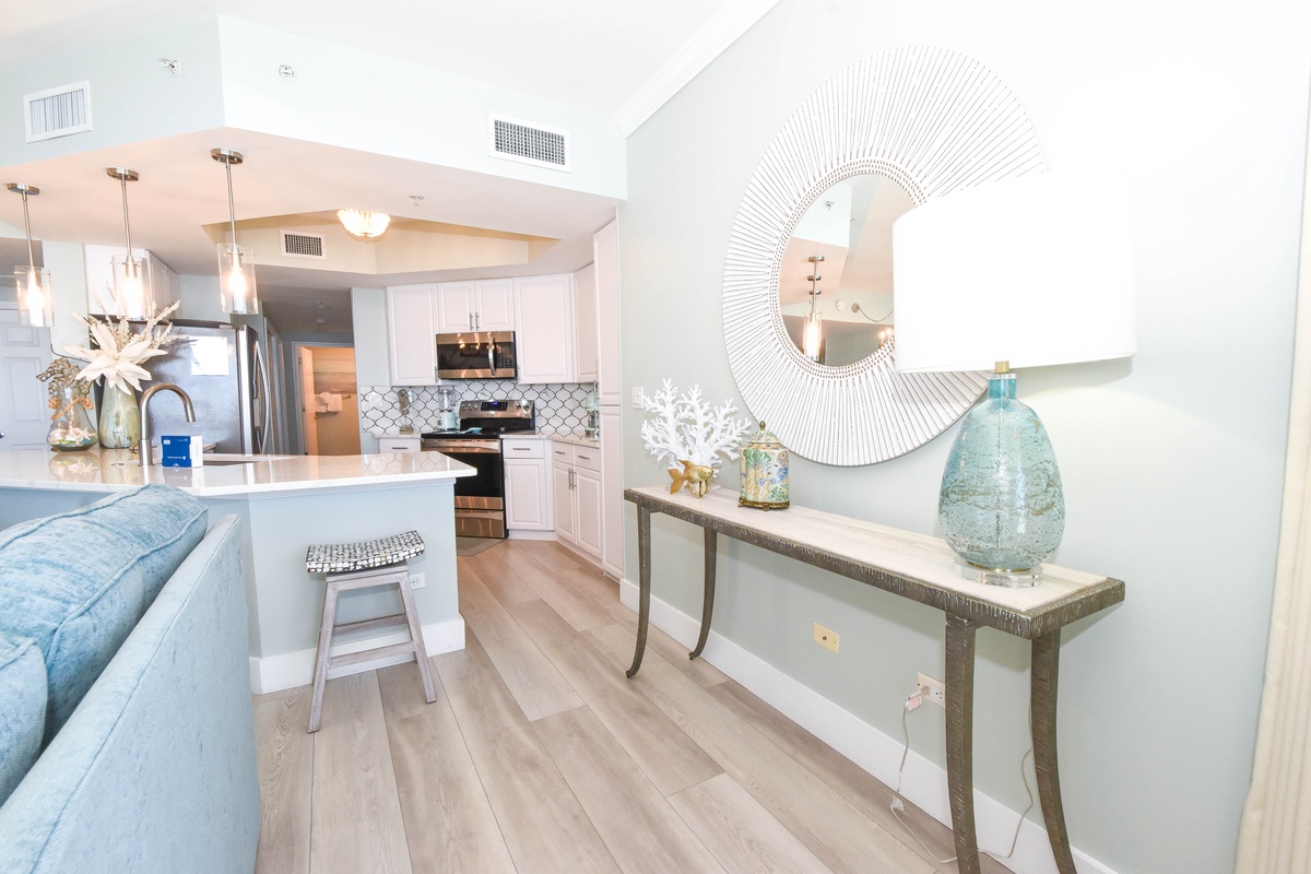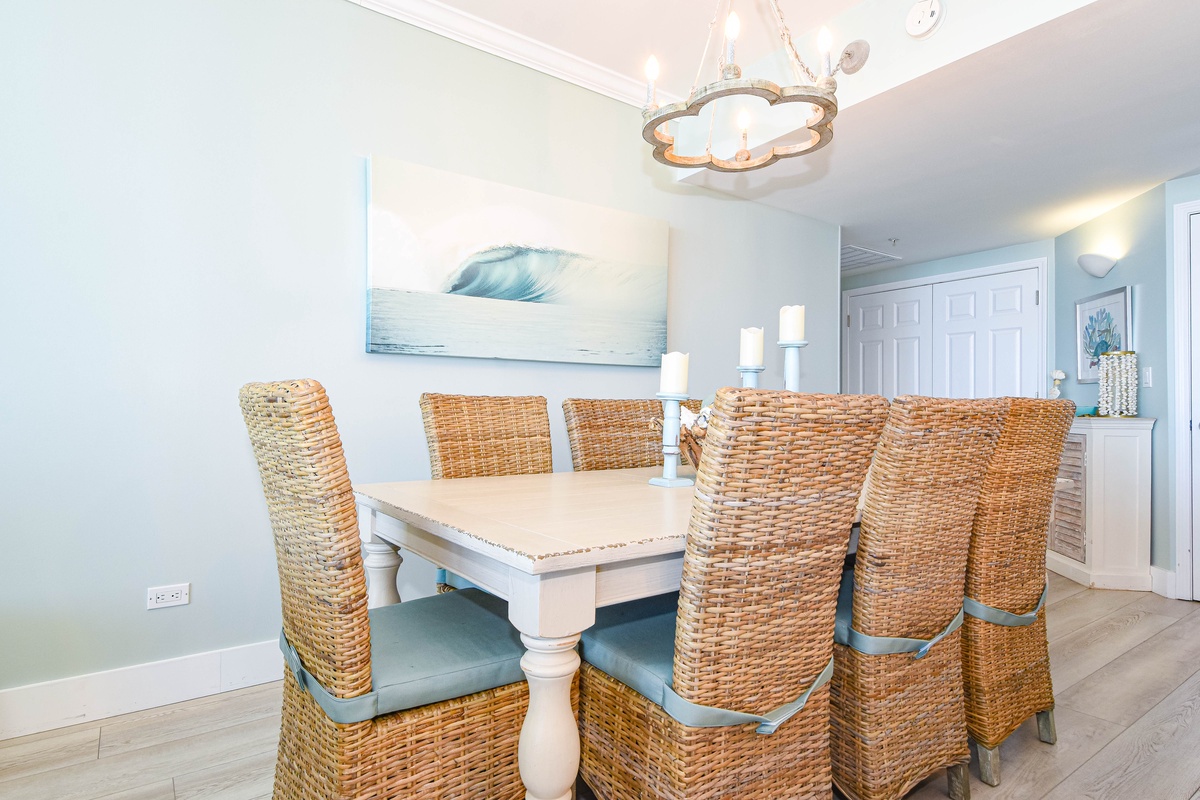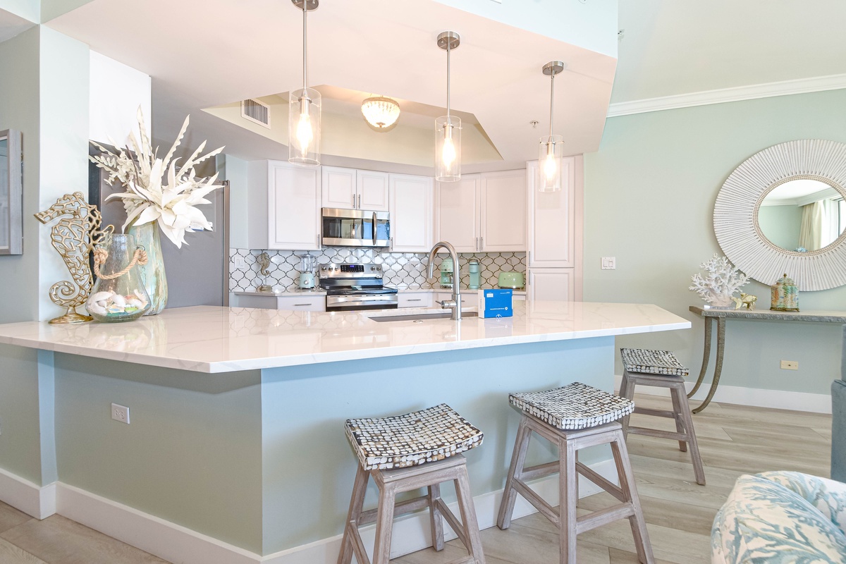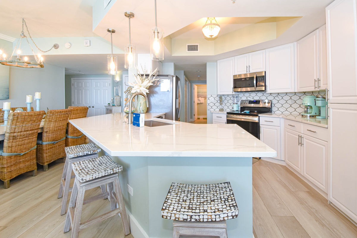The interior spaces of Silver Shells St. Croix 1104 have been tastefully decorated with a trendy coastal theme. An open floor plan with luxury vinyl plank flooring gives the whole family or group space to relax together. The living area is beach-facing, features floor-to-ceiling windows and sliding glass doors, and has plenty of seating for everyone to gather around the flat-screen TV. The spacious beachfront balcony is perfectly furnished to allow for entertaining or dining while taking in spectacular views of the white sand beach and emerald waters. The dining area has seating for eight with additional seating at the breakfast bar. The fully equipped kitchen includes full-size stainless steel appliances and all the cookware and dishware you could need for creating memorable meals. In the main hallway is the laundry room complete with a full-size washer and dryer.