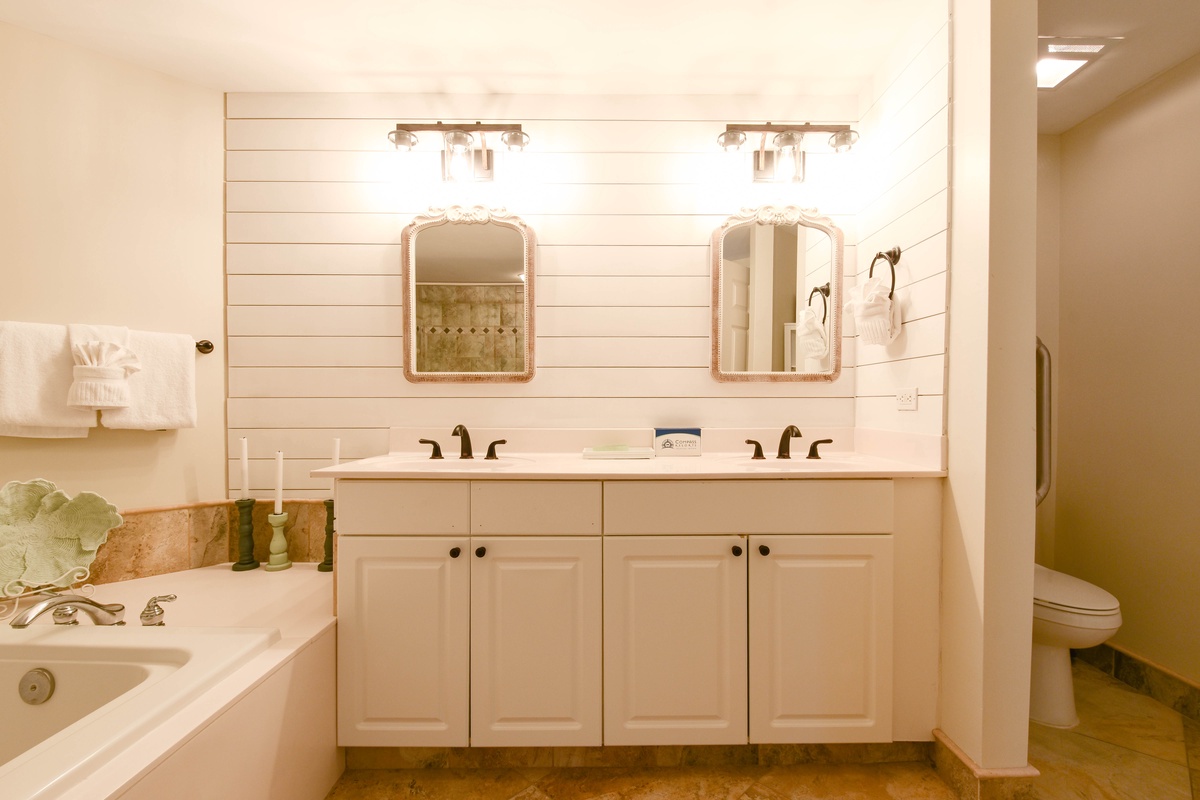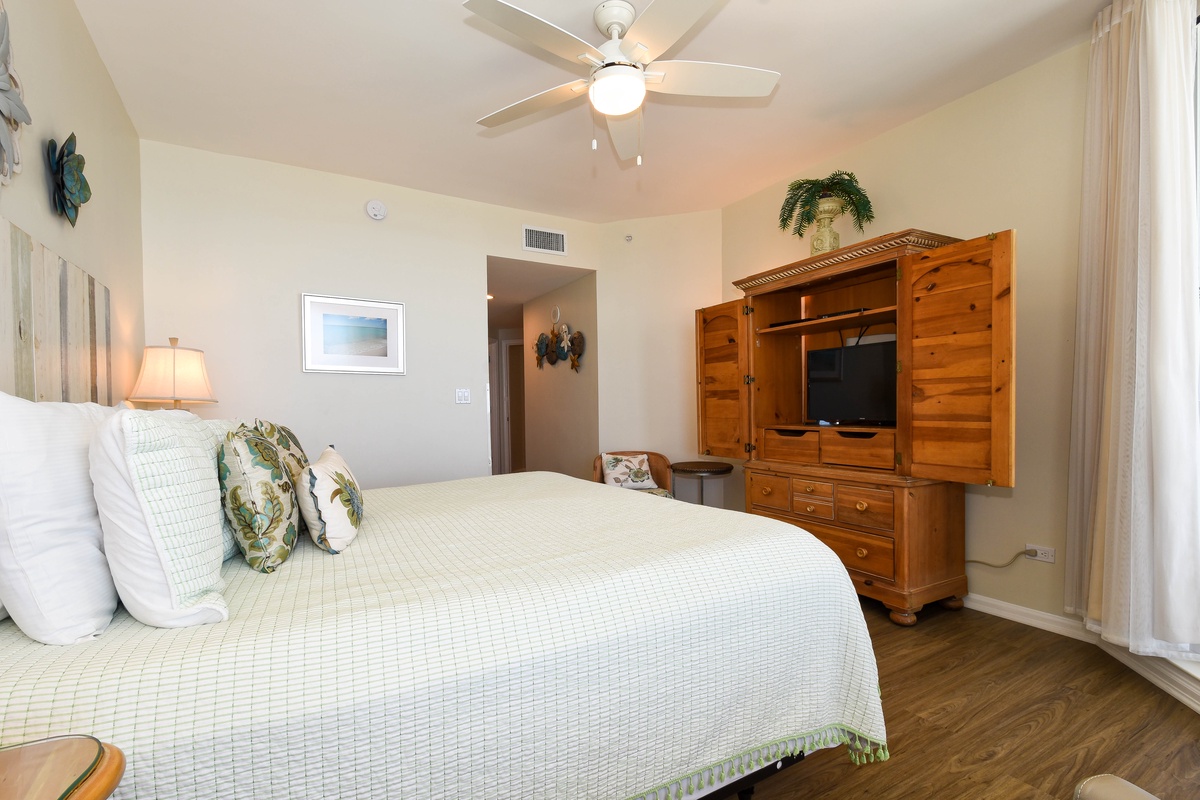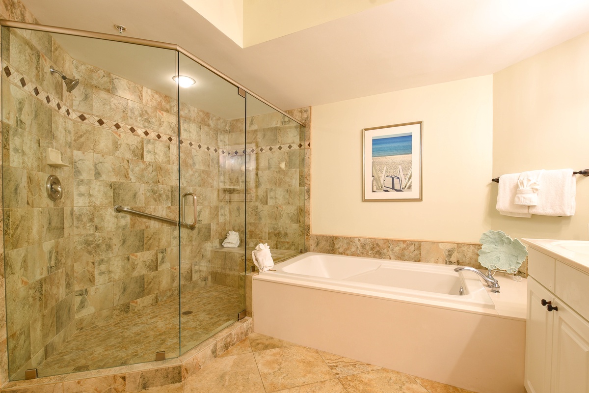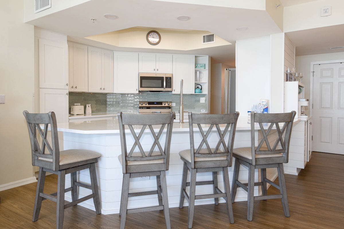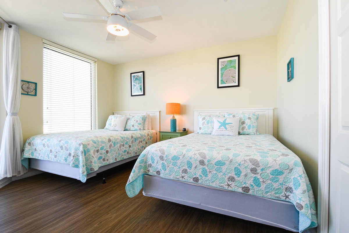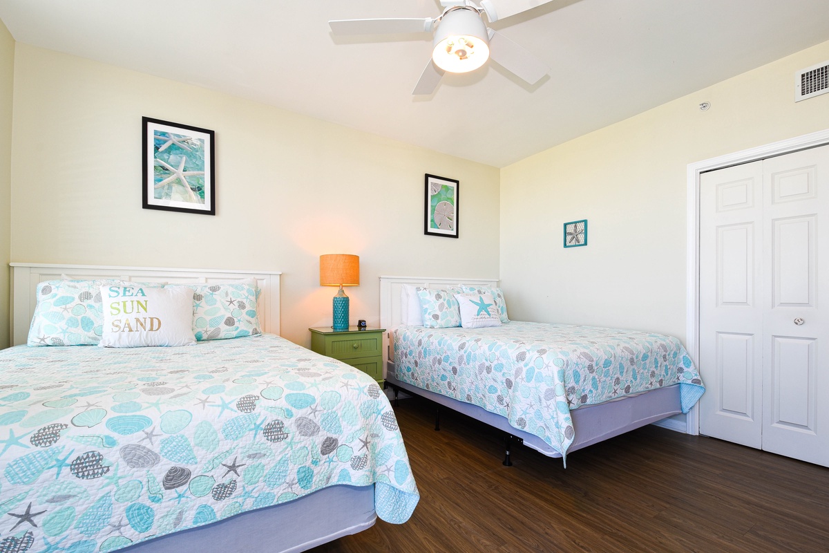 The master bedroom has incredible beach views and private access to the beachfront balcony. Complete with a king bed, flat-screen TV, and private ensuite bathroom, the master bedroom was designed with relaxation in mind. The master bathroom features a jetted tub, walk-in shower, and plenty of vanity space. Both guest bedrooms face the north side of the resort and offer unbeatable views of the resort grounds. The first guest bedroom has a king bed, flat-screen TV, and private access to the north balcony. The second guest bedroom has two queen beds, a TV, and private access to the north balcony. Just a few steps from the first guest bedroom, the second guest bedroom, and the living area is a full bathroom with a walk-in shower.