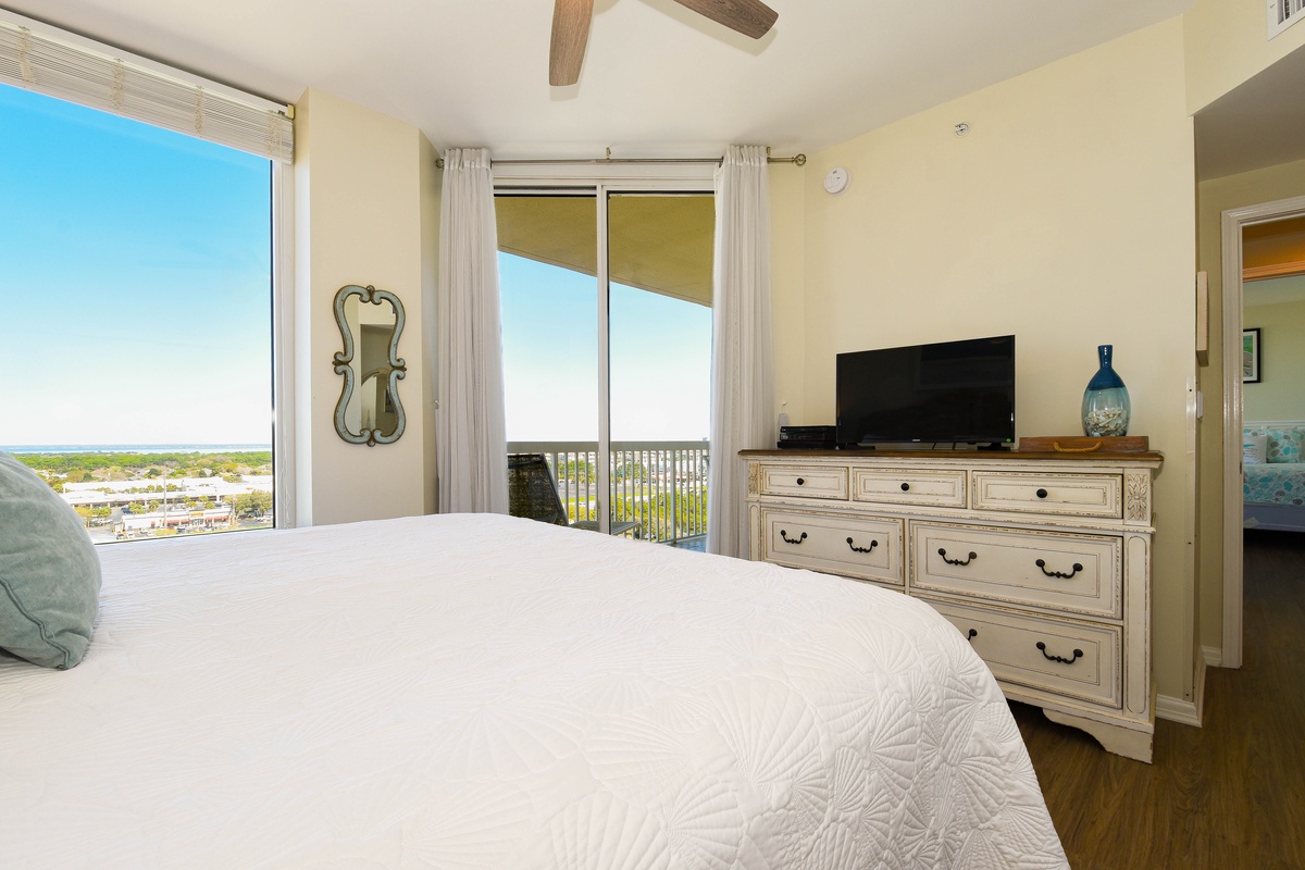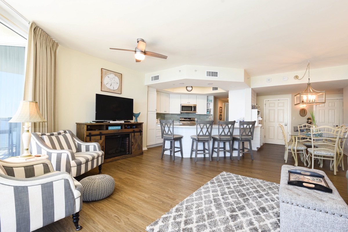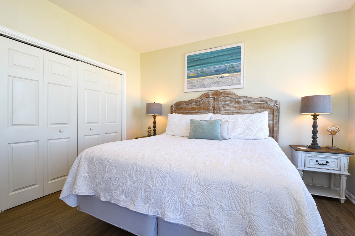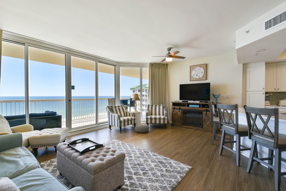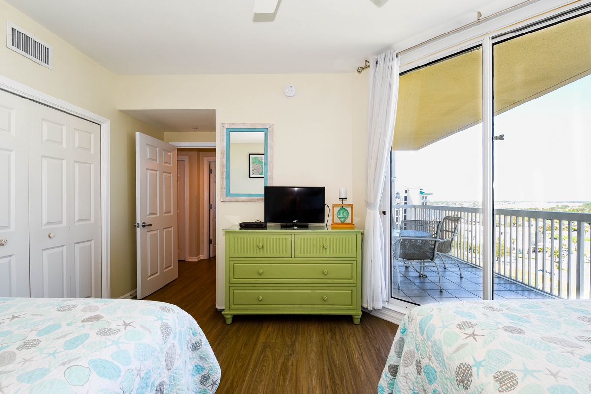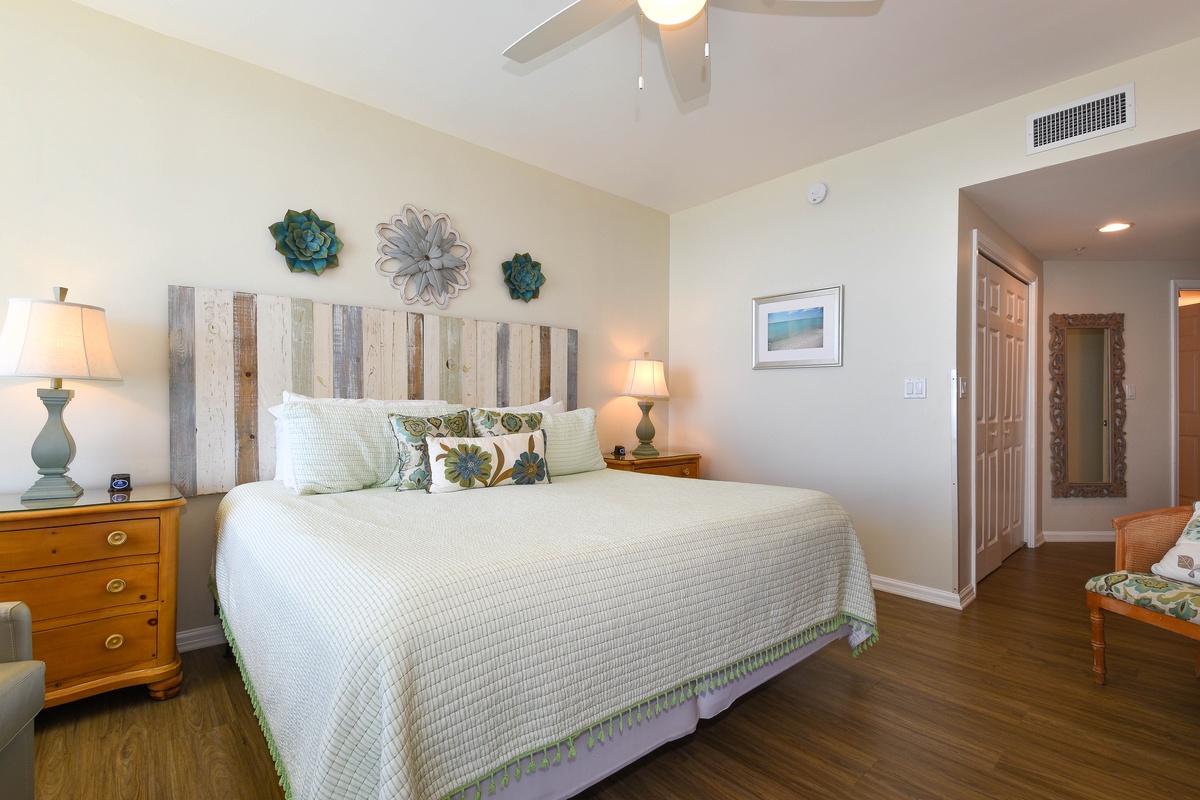 The master bedroom has incredible beach views and private access to the beachfront balcony. Complete with a king bed, flat-screen TV, and private ensuite bathroom, the master bedroom was designed with relaxation in mind. The master bathroom features a jetted tub, walk-in shower, and plenty of vanity space. Both guest bedrooms face the north side of the resort and offer unbeatable views of the resort grounds. The first guest bedroom has a king bed, flat-screen TV, and private access to the north balcony. The second guest bedroom has two queen beds, a TV, and private access to the north balcony. Just a few steps from the first guest bedroom, the second guest bedroom, and the living area is a full bathroom with a walk-in shower.