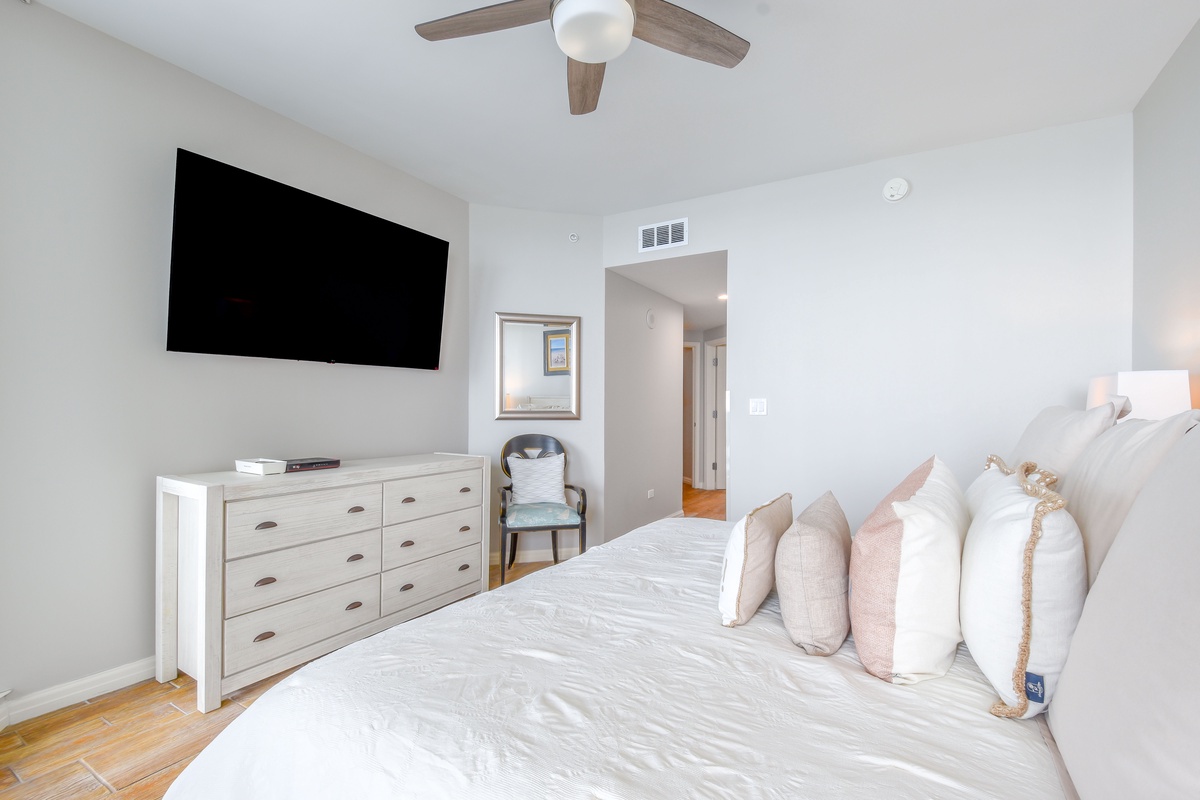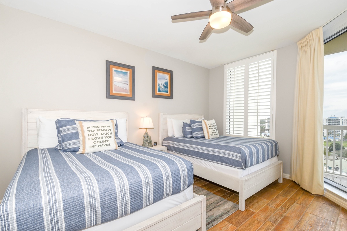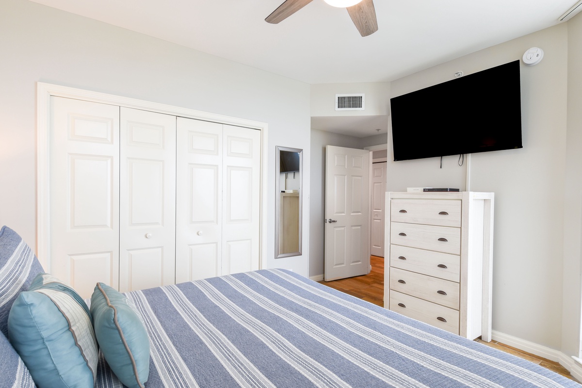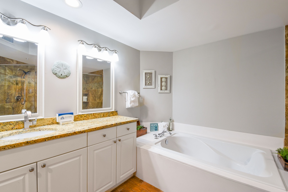 The master bedroom has incredible beach views and private access to the beachfront balcony. Complete with a king bed, walk-in closet, flat-screen TV, and private ensuite bathroom, the master bedroom was designed with relaxation in mind. The master bathroom features a soaker tub, a tiled walk-in shower, and double vanity. Both guest bedrooms face the north side of the resort and offer unbeatable views of the resort grounds. The first guest bedroom has a king bed, a TV, and private access to the north balcony. The second guest bedroom has two full beds, a TV, and private access to the north balcony. Just steps from the first guest bedroom, second guest bedroom, and living area is a full bathroom with a walk-in shower.