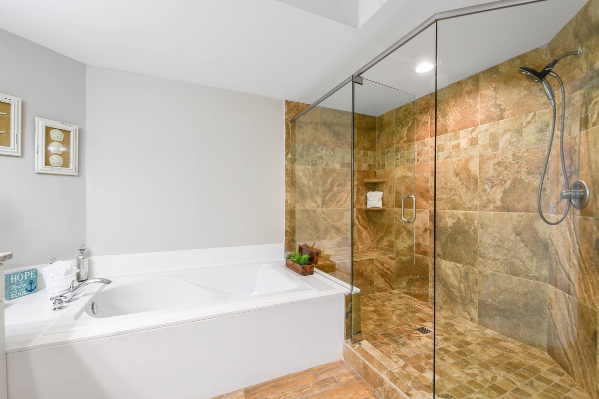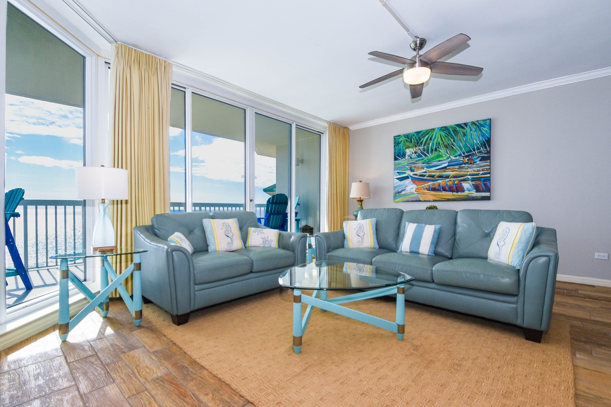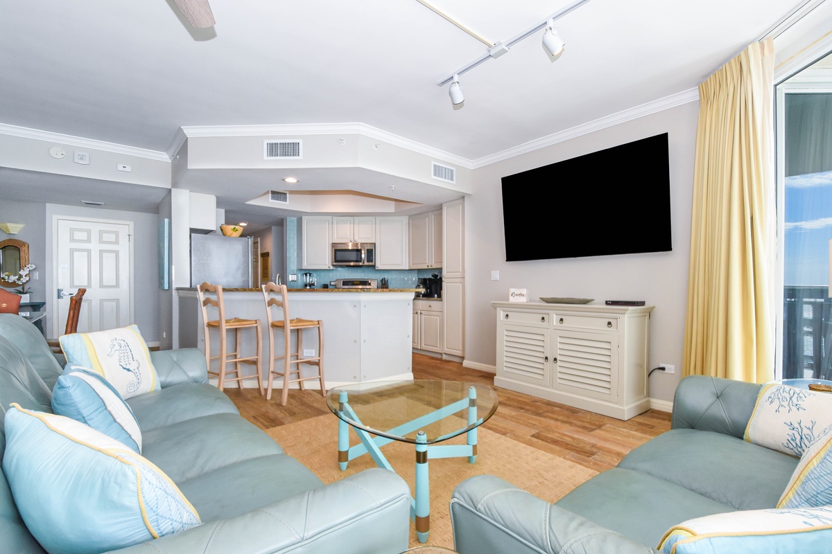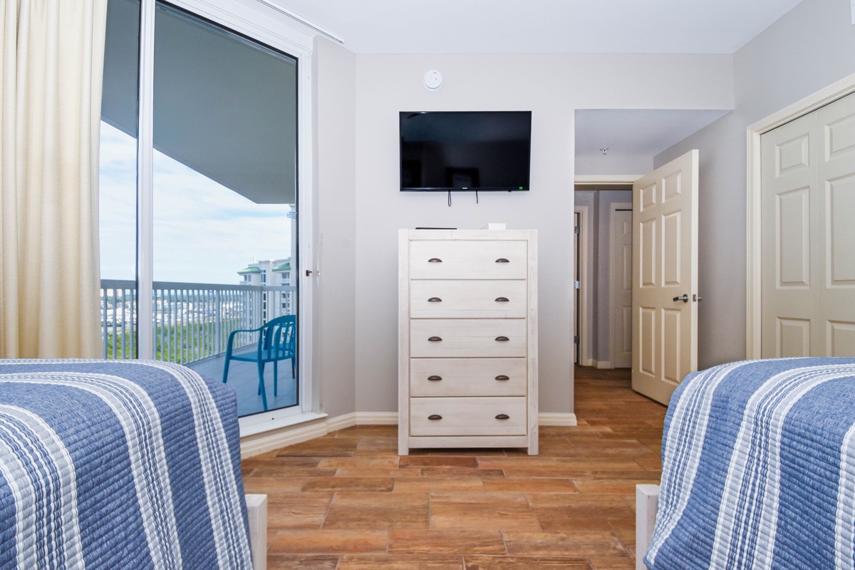 The master bedroom has incredible beach views and private access to the beachfront balcony. Complete with a king bed, walk-in closet, flat-screen TV, and private ensuite bathroom, the master bedroom was designed with relaxation in mind. The master bathroom features a soaker tub, a tiled walk-in shower, and double vanity. Both guest bedrooms face the north side of the resort and offer unbeatable views of the resort grounds. The first guest bedroom has a king bed, a TV, and private access to the north balcony. The second guest bedroom has two full beds, a TV, and private access to the north balcony. Just steps from the first guest bedroom, second guest bedroom, and living area is a full bathroom with a walk-in shower.