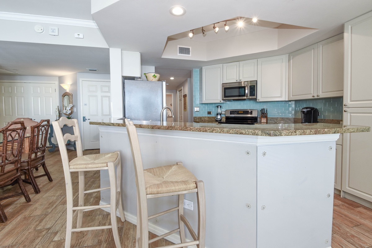 The interior spaces of Silver Shells St. Croix 1404 have been tastefully decorated with a trendy beach theme. An open floor plan gives the whole family or group space to relax together. The living area is beach-facing, features floor-to-ceiling windows and sliding glass doors, and has plenty of seating for everyone to gather around the flat-screen TV. The couch doubles as a queen sleeper sofa for larger parties. The spacious beachfront balcony is perfectly furnished to allow for entertaining or dining while taking in spectacular views of the white sand beach and emerald waters. The dining area has seating for six with two additional seats at the breakfast bar. The fully equipped kitchen includes full-size stainless steel appliances all the cookware and dishware you could need for creating memorable meals.