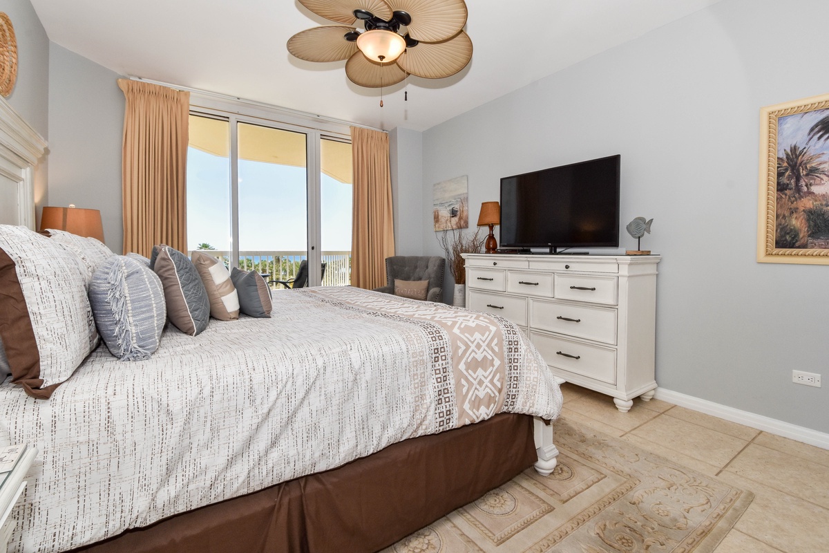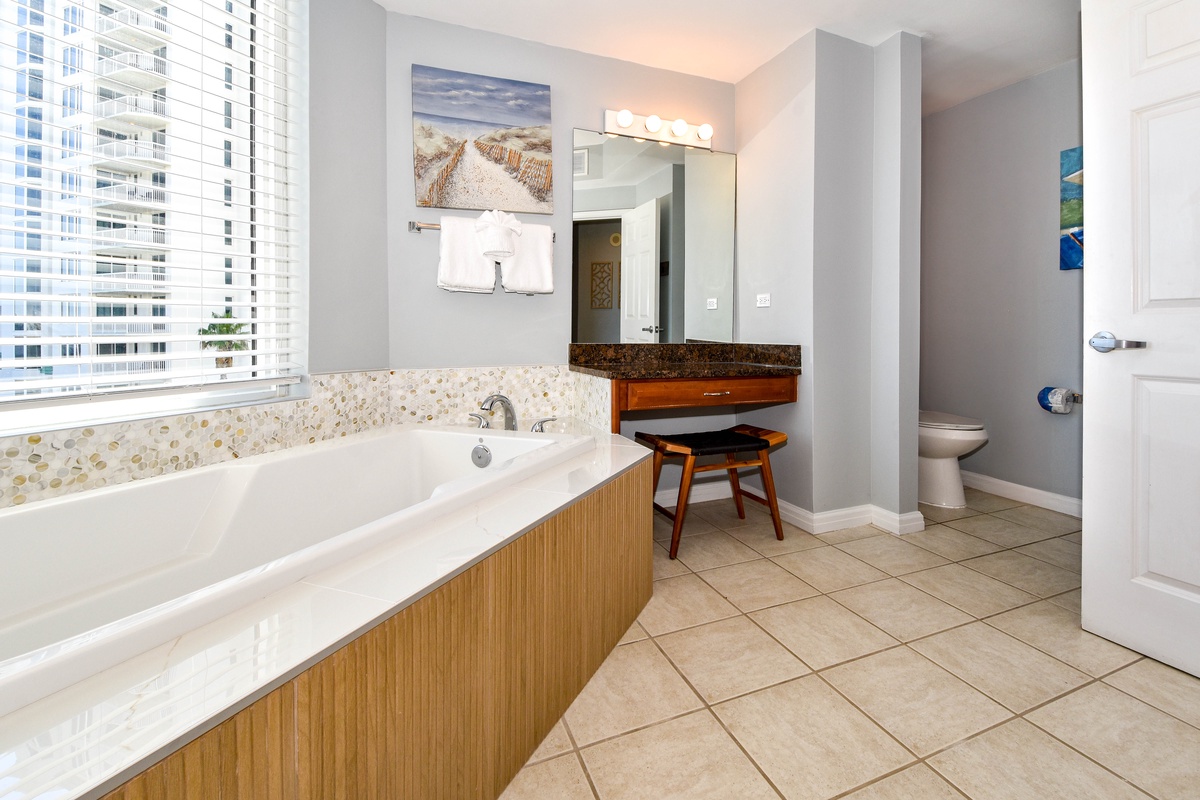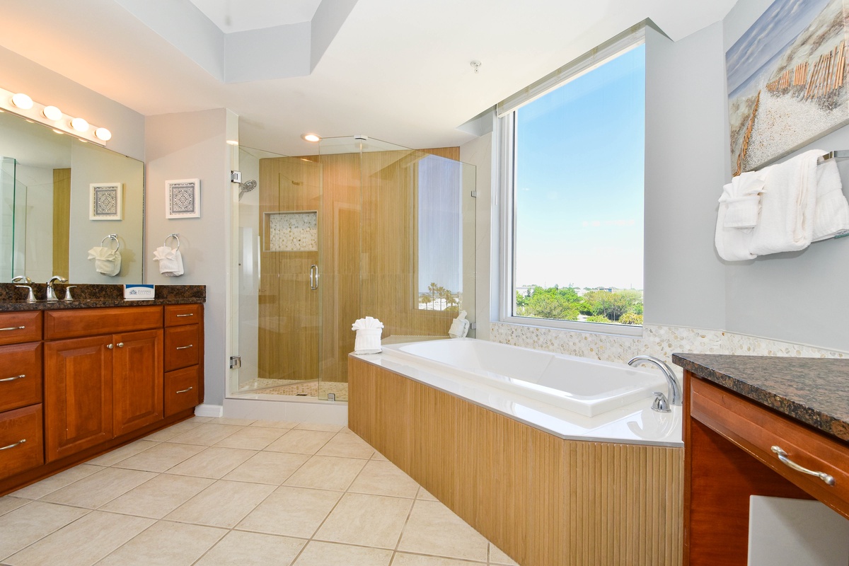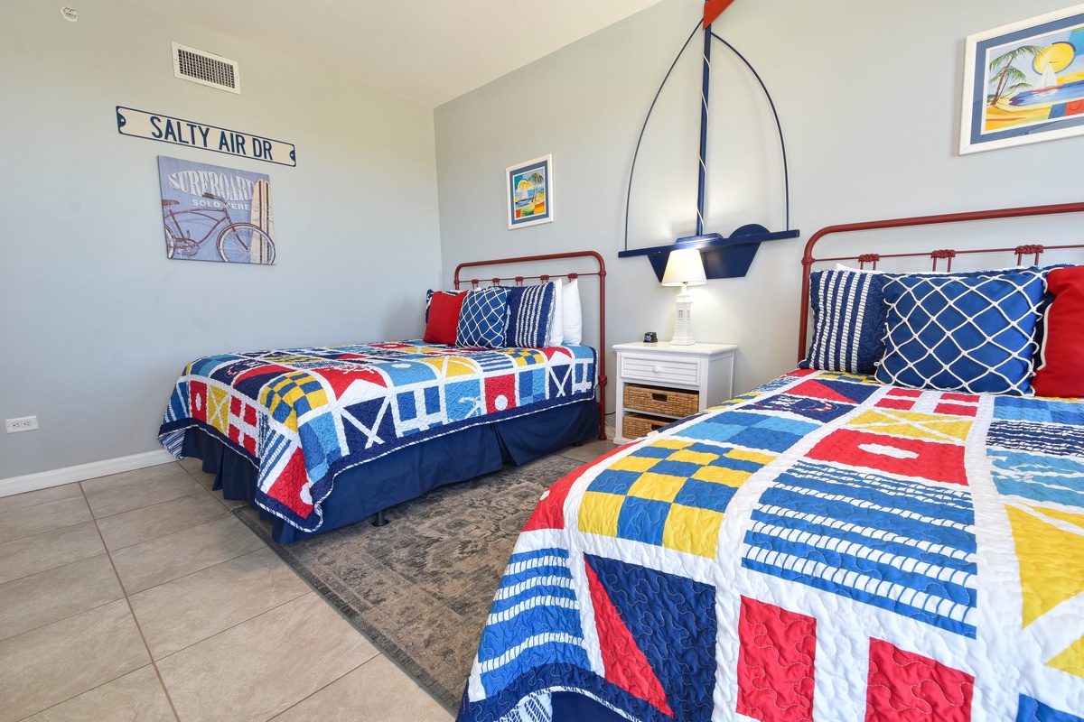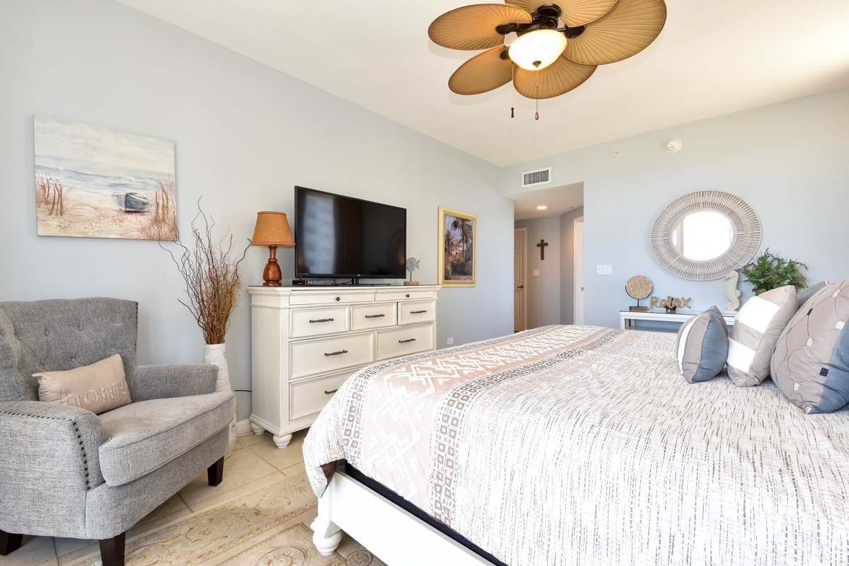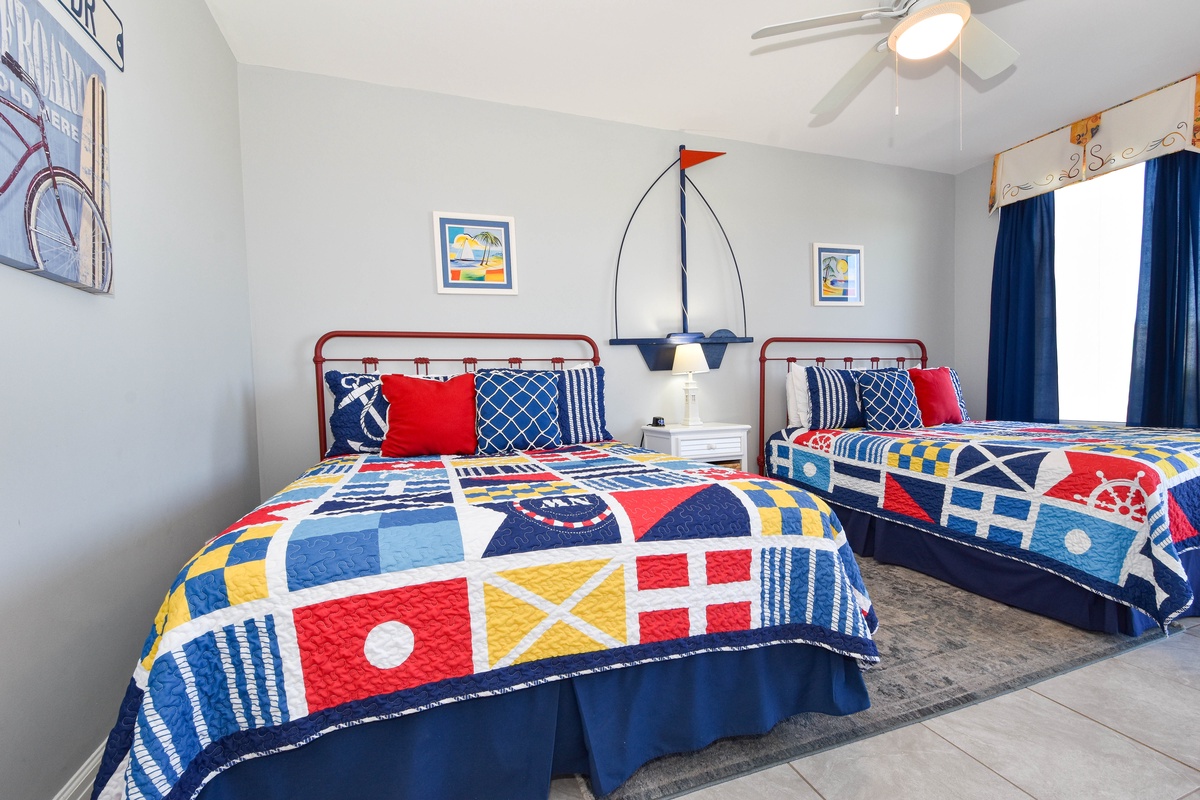 The Master bedroom boasts a large king-sized bed, private access to the beach-facing balcony, and a flat-screen TV. The private ensuite bathroom features a large soaker tub, tiled walk-in shower, and a separate vanity that's perfect for doing your makeup. The first guest bedroom has a king-sized bed, a large TV, and access to the north-facing balcony. The ensuite bathroom features a tiled walk-in shower and plenty of storage space. The second guest bedroom is fitted with two full-sized beds, a TV, and access to the north-facing private balcony. The adjoining bathroom features a shower-tub combo and large vanity.