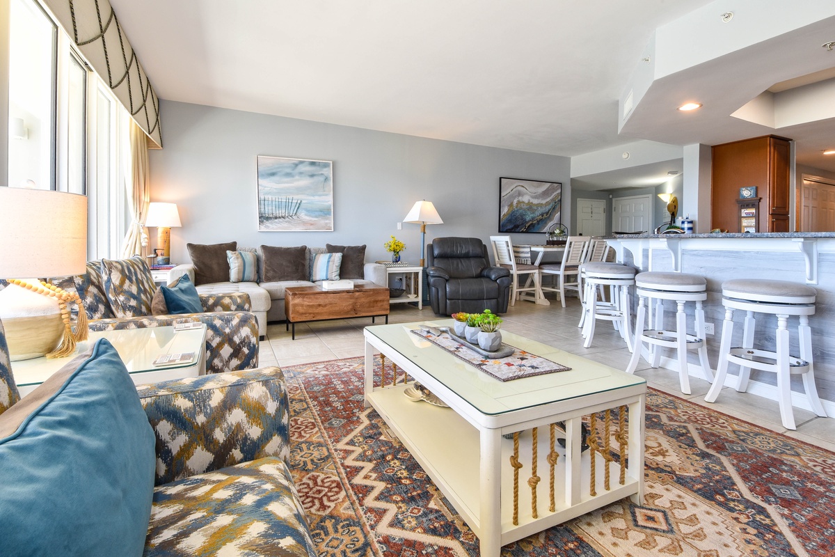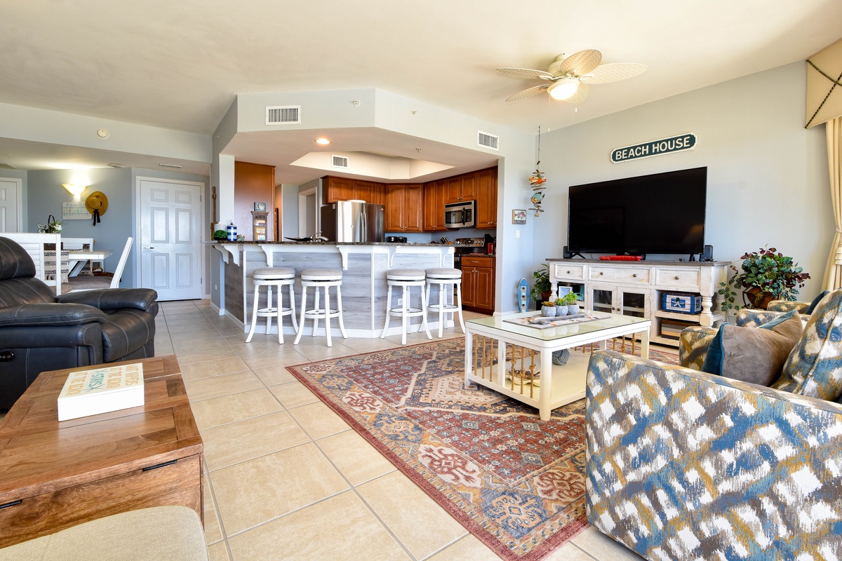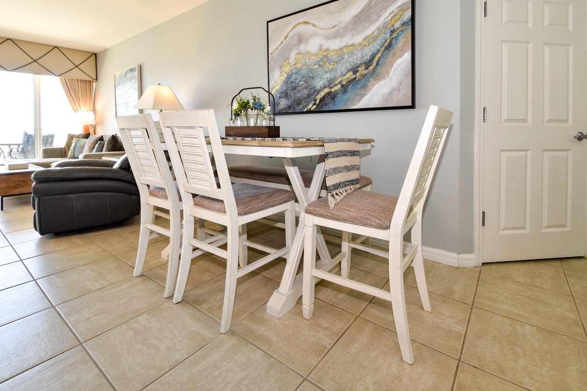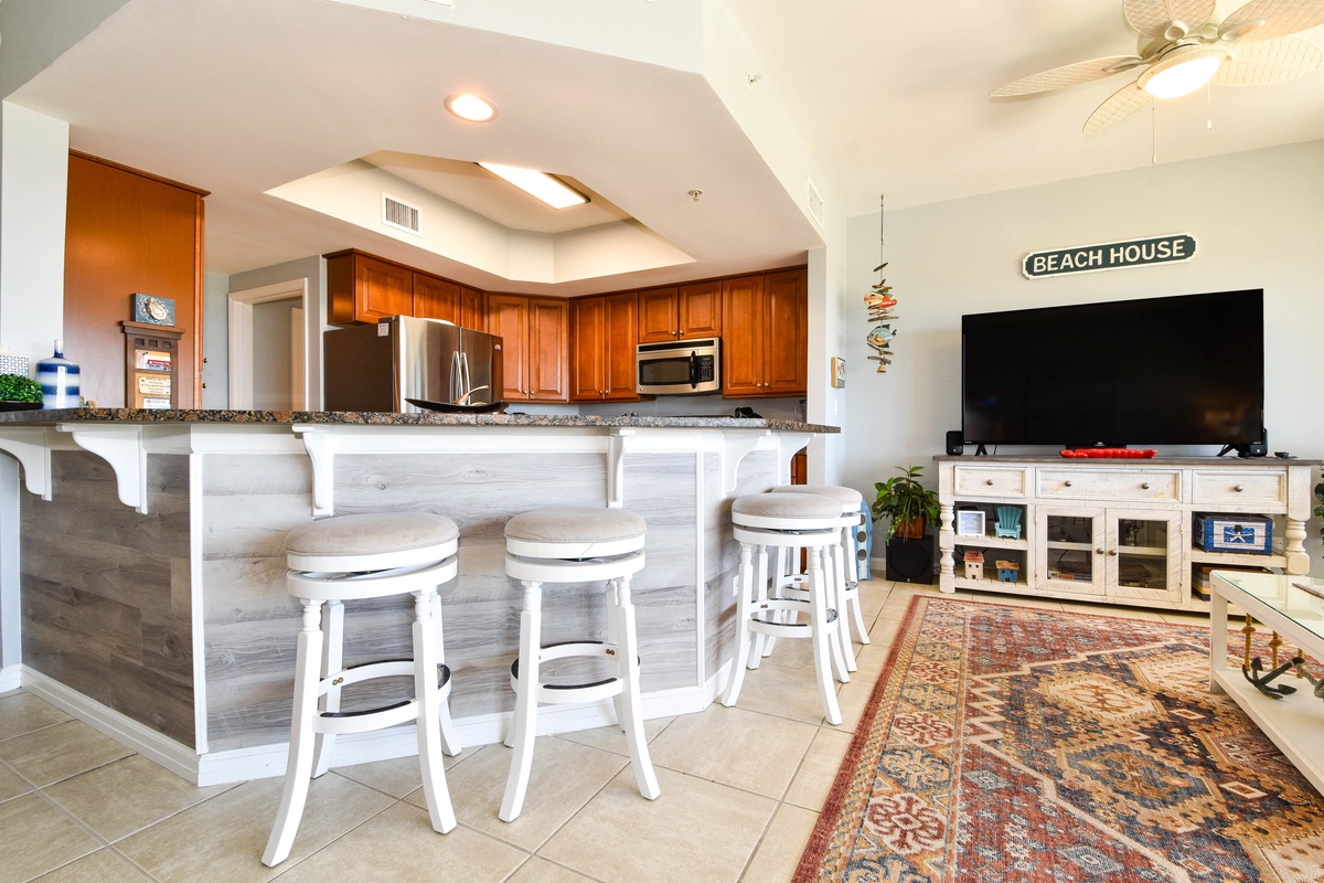 The living area of Silver Shells St. Croix 401 has been tastefully decorated with coastal furniture and décor making the living space comfortable for your entire party to enjoy after a long day enjoying the beach and plethora of amenities offered at Silver Shells. The floor-to-ceiling windows offer beautiful Gulf views as well as entry onto your private, beach-facing balcony. The large flat-screen TV makes for an easy quiet night in. The dining space offers enough seating for six guests, with additional seating at the adjacent breakfast bar. The fully equipped kitchen is fitted with stainless steel appliances, granite countertops, and all the cookware you need for family meals.