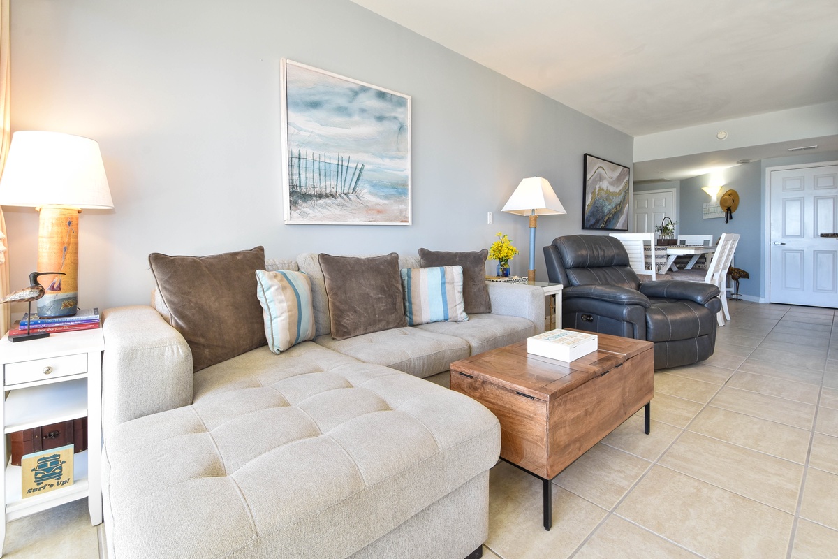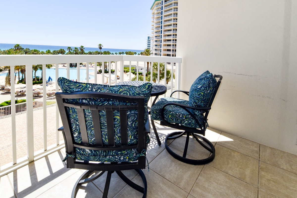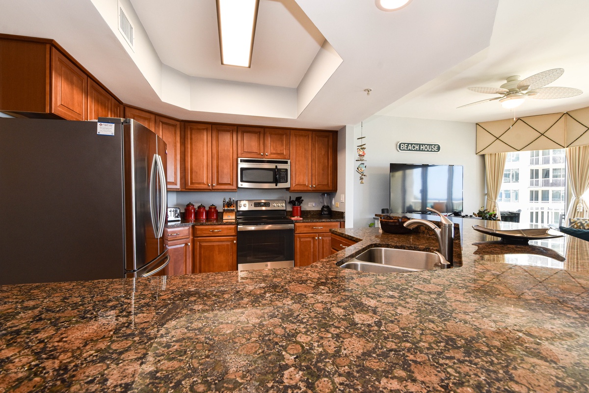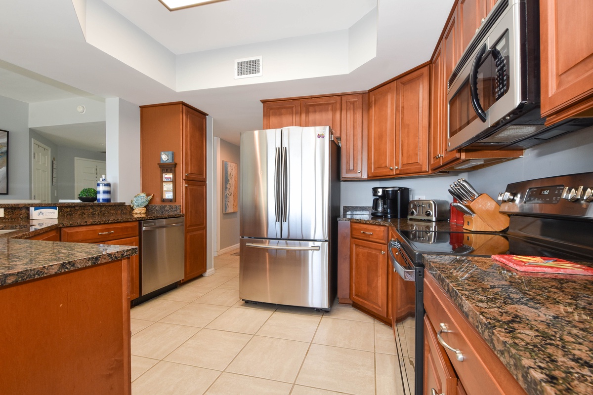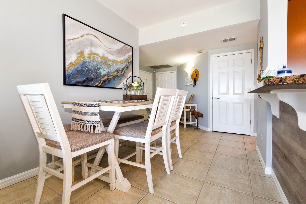 The living area of Silver Shells St. Croix 401 has been tastefully decorated with coastal furniture and décor making the living space comfortable for your entire party to enjoy after a long day enjoying the beach and plethora of amenities offered at Silver Shells. The floor-to-ceiling windows offer beautiful Gulf views as well as entry onto your private, beach-facing balcony. The large flat-screen TV makes for an easy quiet night in. The dining space offers enough seating for six guests, with additional seating at the adjacent breakfast bar. The fully equipped kitchen is fitted with stainless steel appliances, granite countertops, and all the cookware you need for family meals.