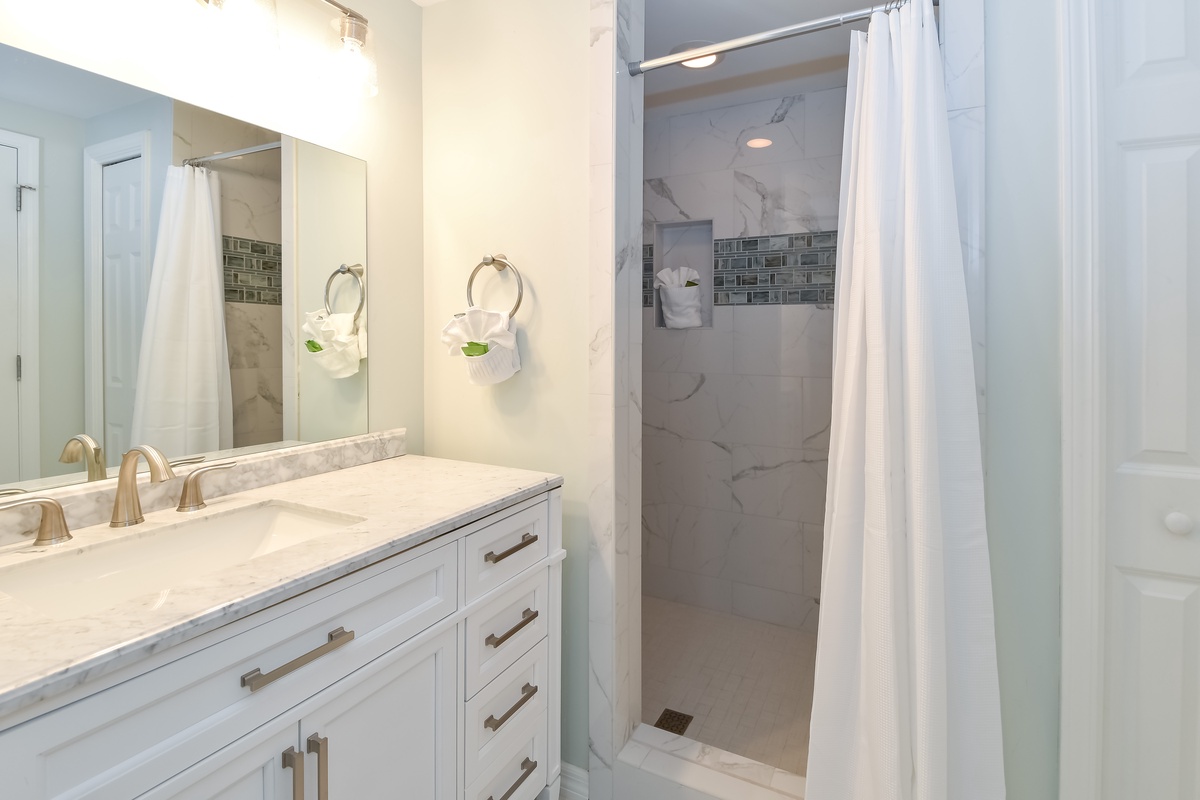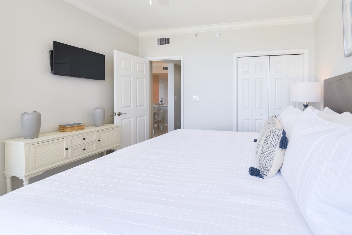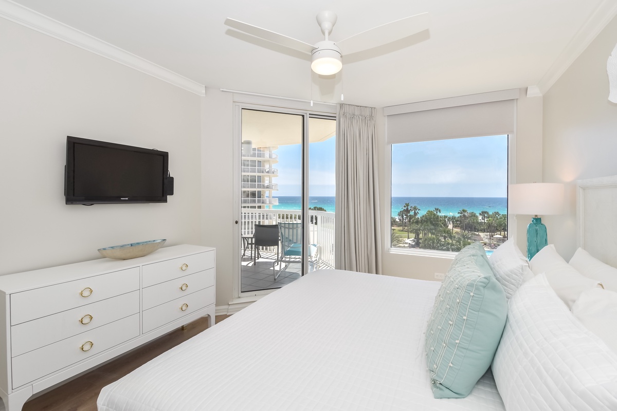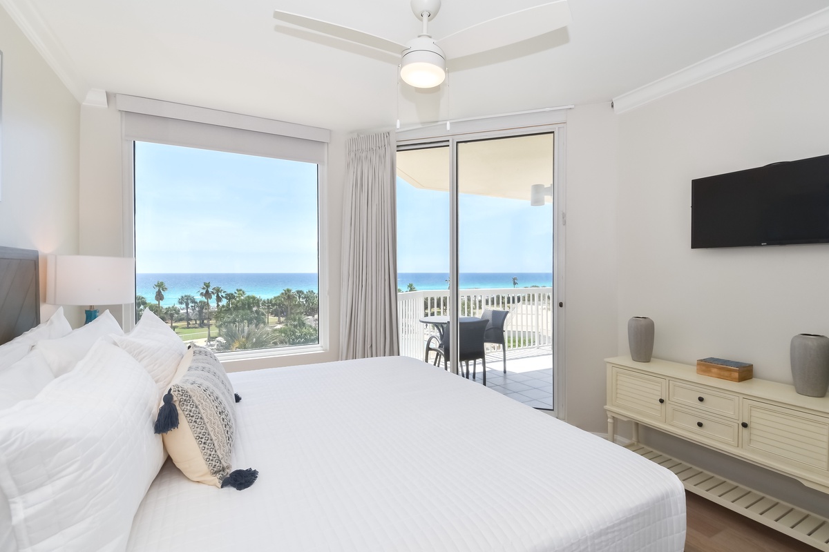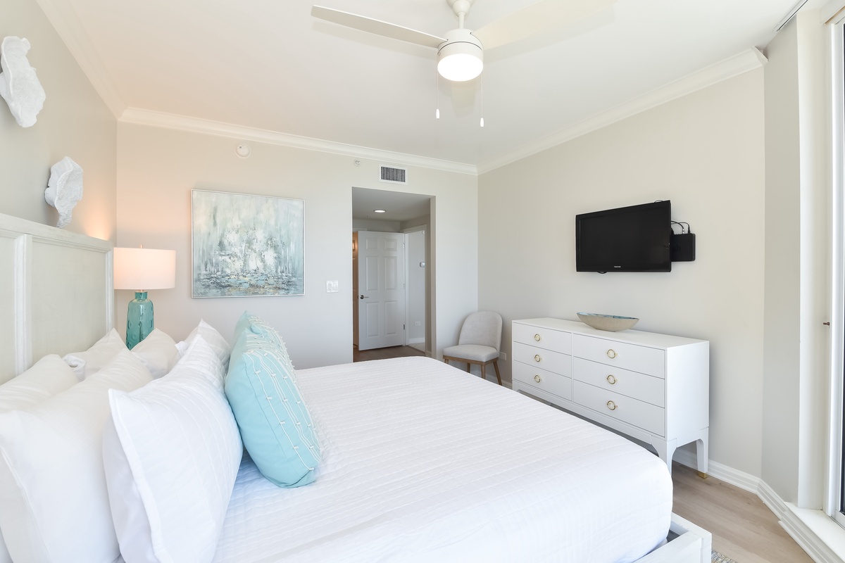 The master bedroom has incredible beach views and private access to the beachfront balcony. Complete with a king bed, flat-screen TV, and private ensuite bathroom, the master bedroom was designed with luxury relaxation in mind. The spa-like master bathroom features a tub, an elegant walk-in shower, and plenty of vanity space. The guest bedroom has a king bed, a flat-screen TV, and private access to the beachfront balcony. Just a few steps from both the guest bedroom and living area is a full bathroom with a walk-in shower.