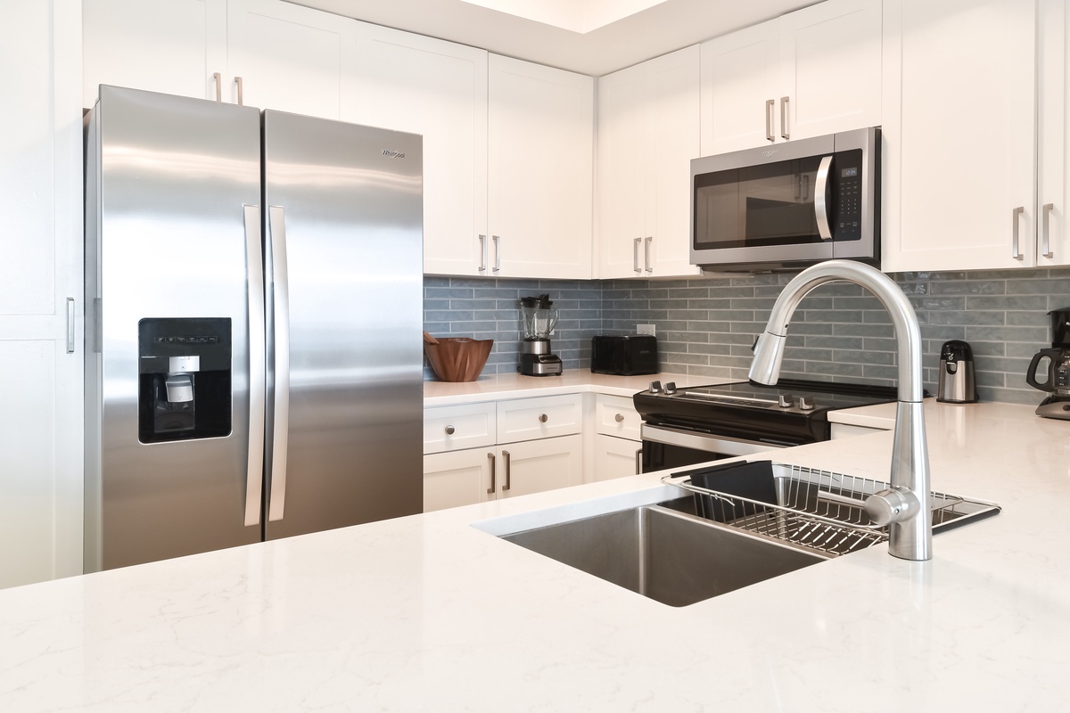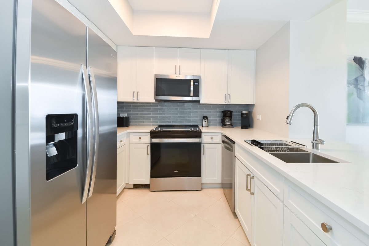 The interior spaces of Silver Shells St. Croix 502 have been designed with a relaxing coastal theme, perfect for unwinding after a fun-filled day on the beach! An open floor plan gives the whole family or group space to enjoy time together. The living area is beach-facing, features floor-to-ceiling windows and sliding glass doors, and offers comfortable seating for gathering around the flat-screen TV. The couch even converts to a queen sleeper sofa for larger parties. The spacious beachfront balcony is perfectly furnished to allow for entertaining or dining while taking in spectacular views of the white sand beach and emerald waters. The dining area has seating for four. The beautiful fully equipped kitchen includes full-size stainless steel appliances and all the cookware and dishware you could need for creating memorable meals together.