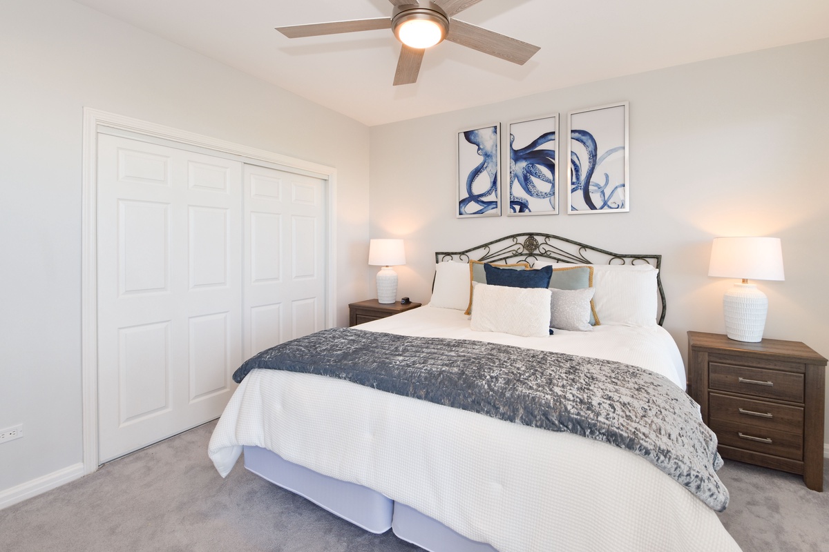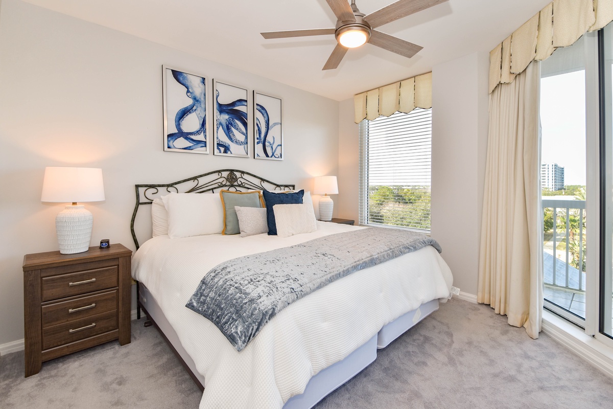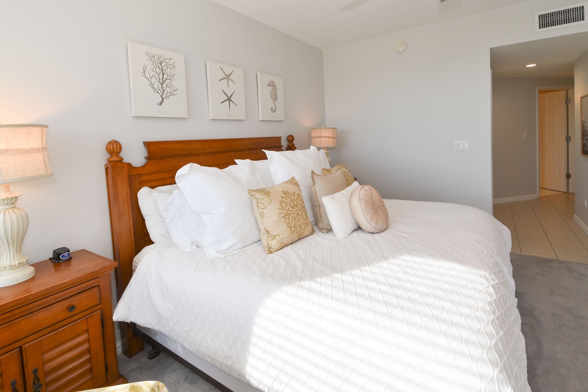 The master bedroom has incredible beach views and private access to the beachfront balcony. Complete with a king bed, walk-in closet, flat-screen TV, and private ensuite bathroom, the master bedroom was designed with relaxation in mind. The master bathroom features a jetted tub, tiled walk-in shower with a built-in bench, and plenty of vanity space. Both guest bedrooms face the north side of the resort and offer unbeatable views of the resort grounds. The first guest bedroom has a king bed, a TV, and private access to the north balcony. The second guest bedroom has two queen beds, a TV, and private access to the north balcony. Just a few steps from the first guest bedroom, the second guest bedroom, and the living area is a full bathroom with a walk-in shower.