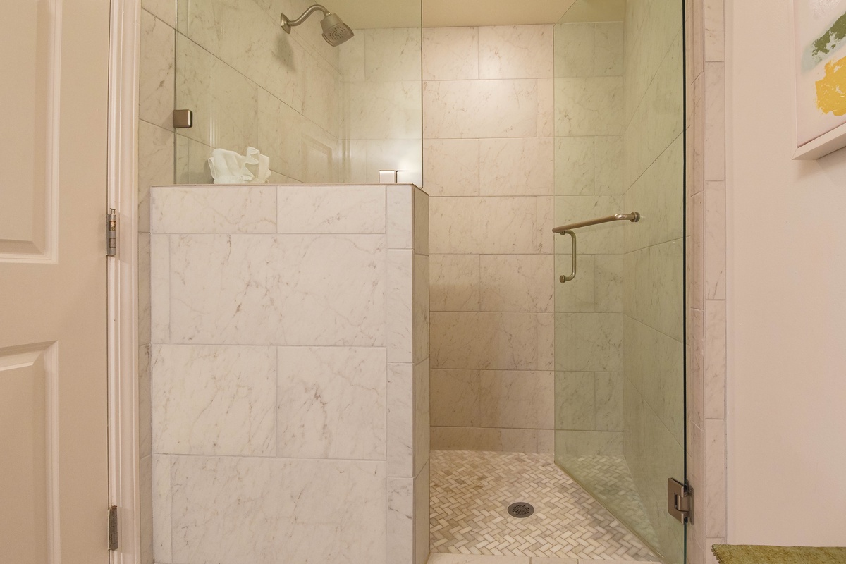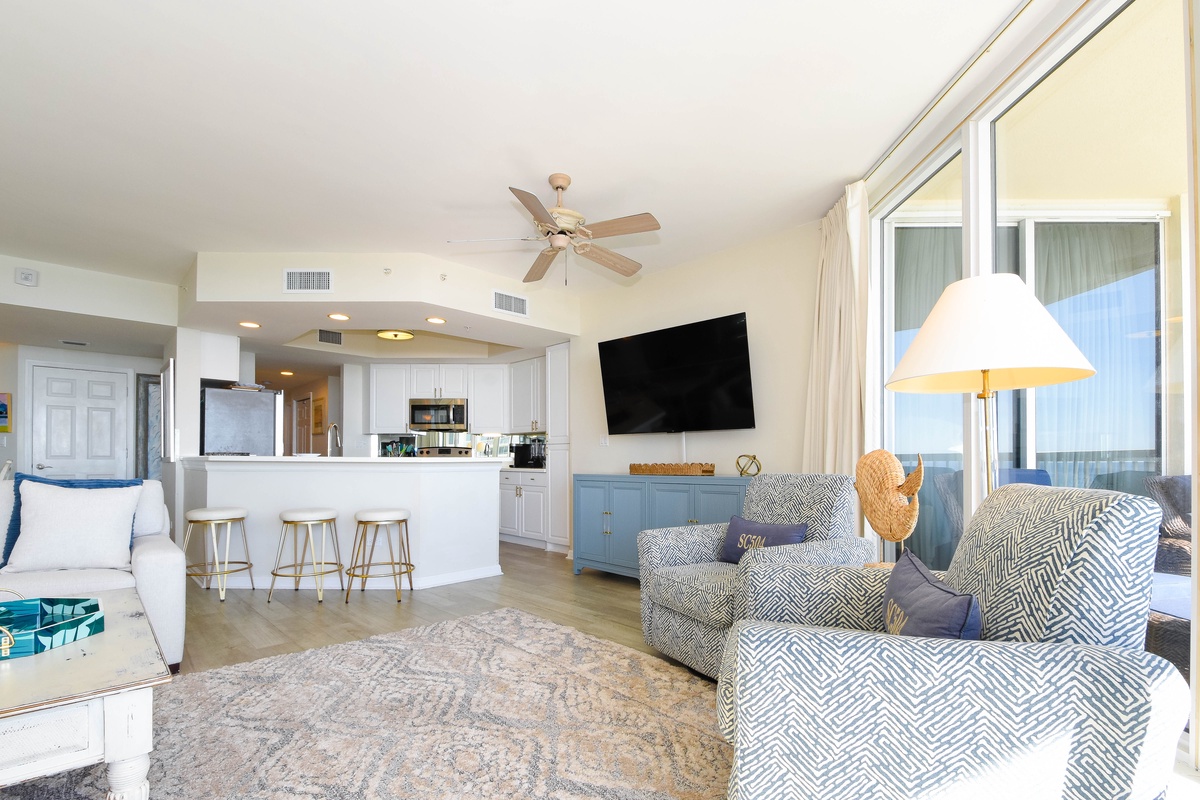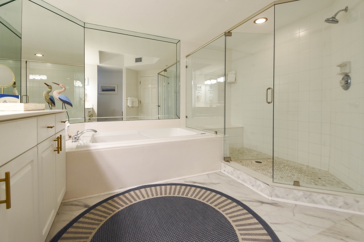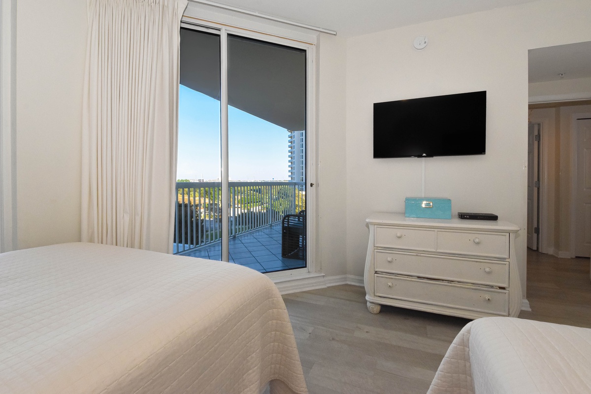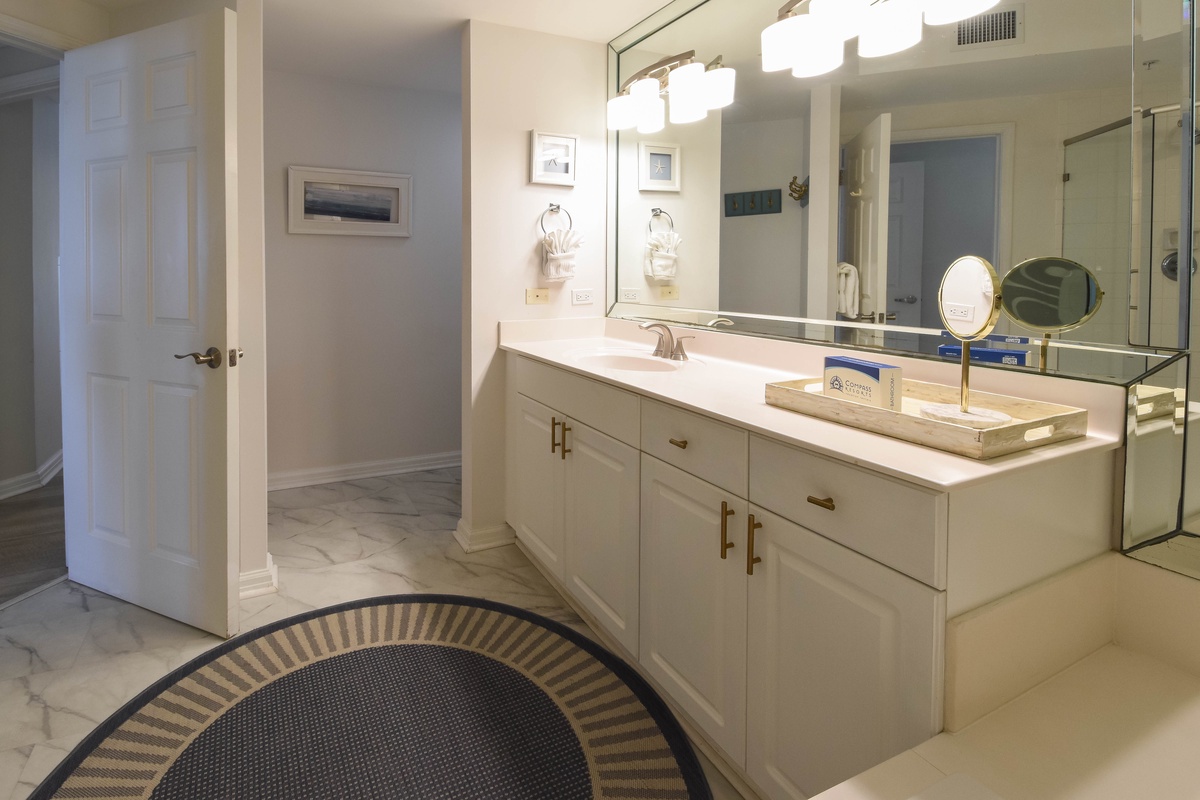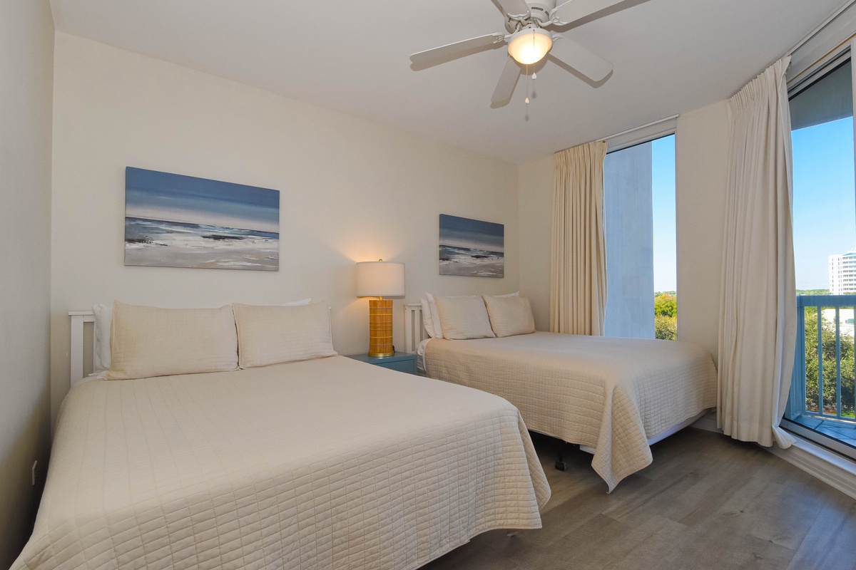 The master bedroom has incredible beach views and private access to the beachfront balcony. Complete with a king bed, flat-screen TV, and private ensuite bathroom, the master bedroom was designed with relaxation in mind. The master bathroom features a jetted tub, walk-in shower, and plenty of vanity space. Both guest bedrooms face the north side of the resort and offer unbeatable views of the resort grounds. The first guest bedroom has a queen bed, flat-screen TV, and private access to the north balcony. The second guest bedroom has two queen beds, a flat-screen TV, and private access to the north balcony. Just steps from the first guest bedroom, the second guest bedroom, and the living area is a full bathroom with a walk-in shower.