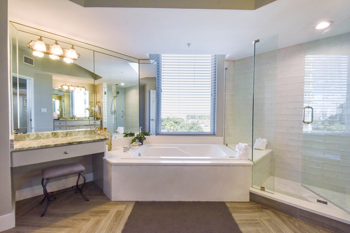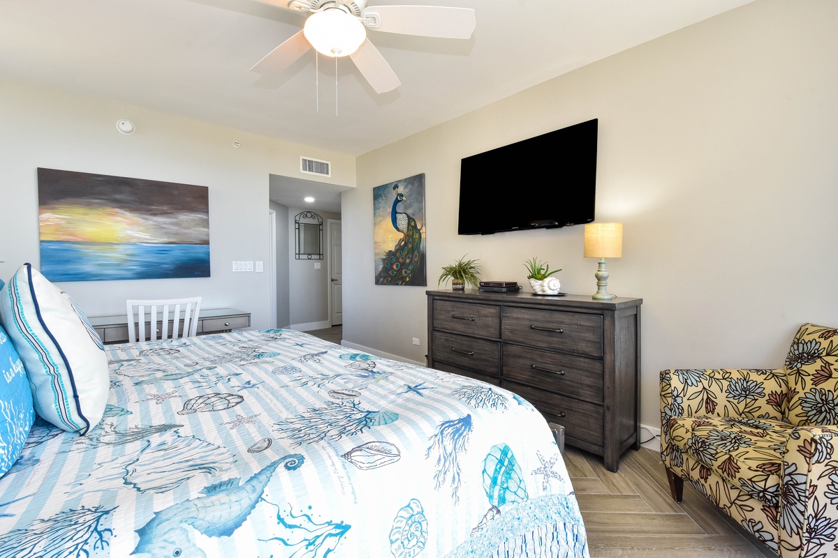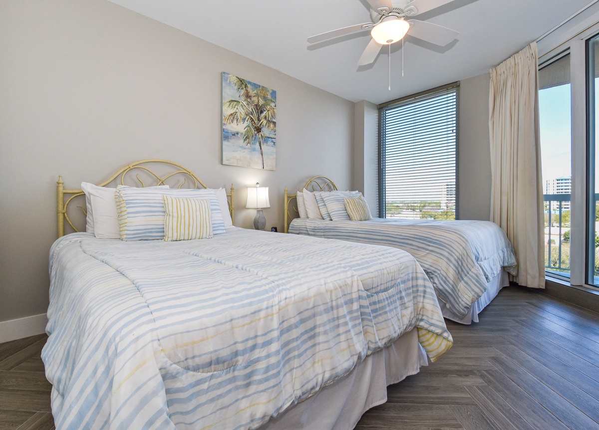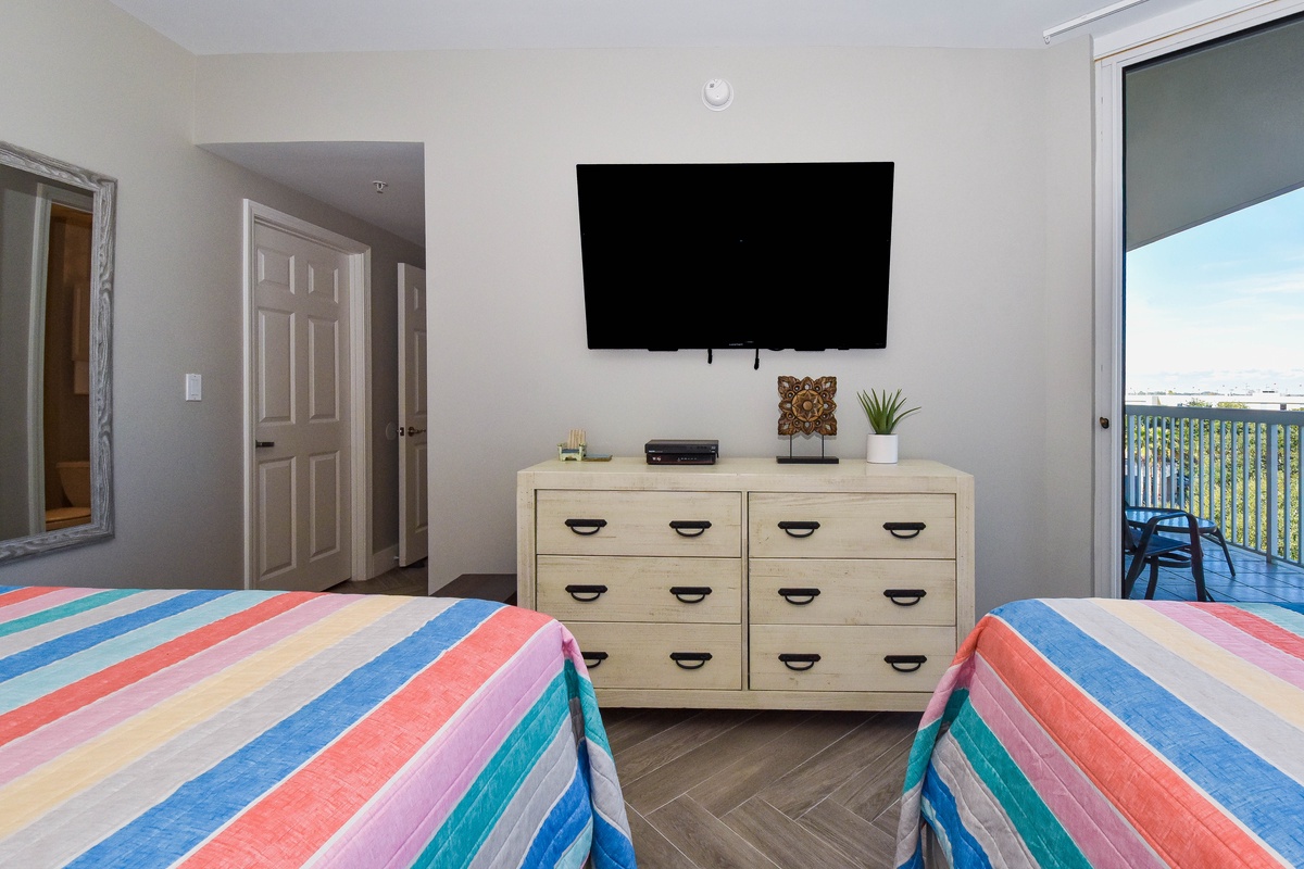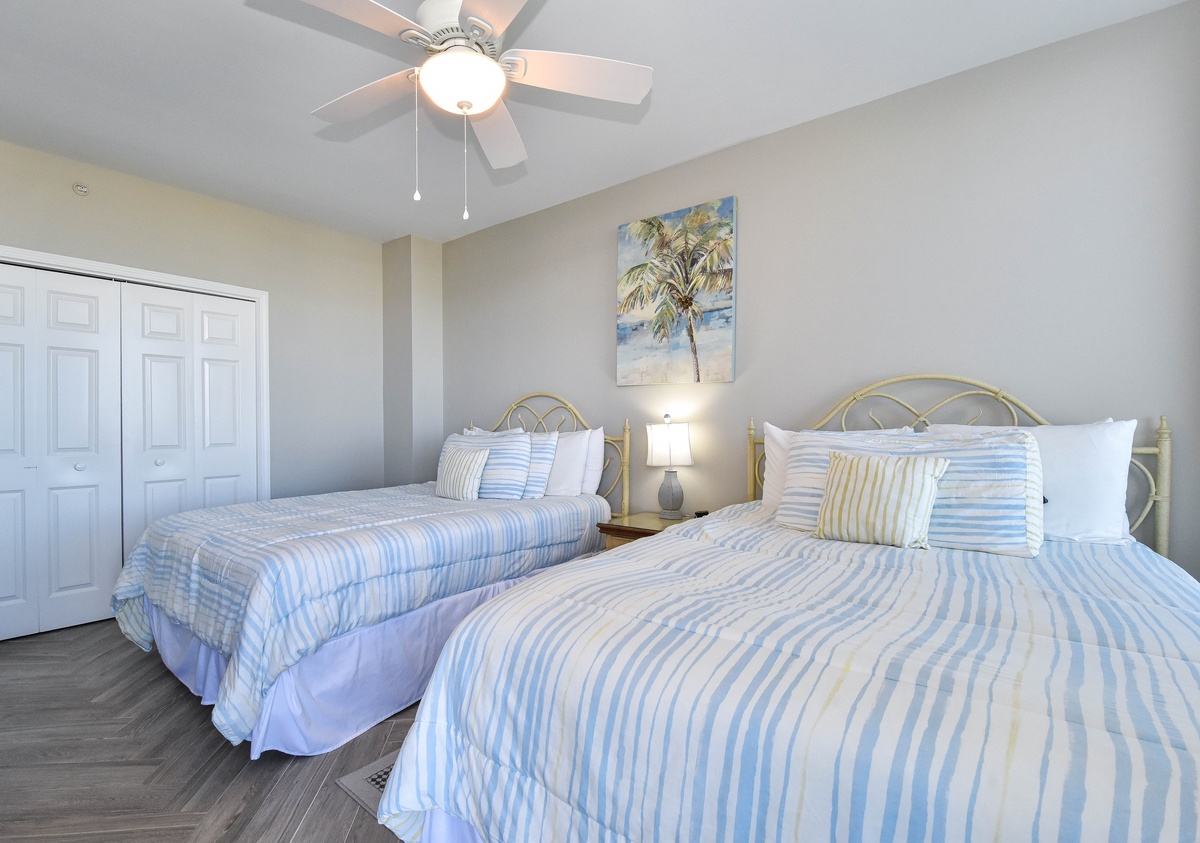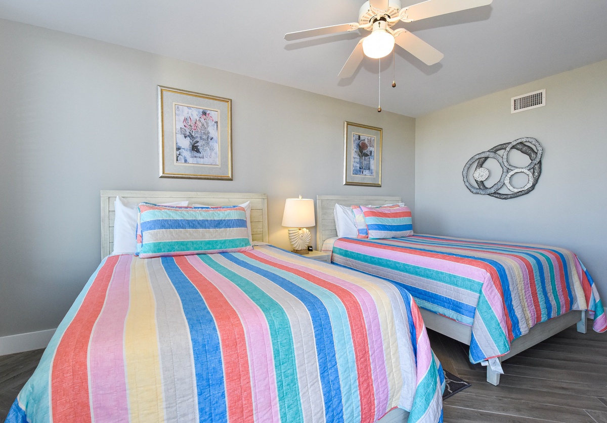 The primary bedroom has incredible beach views and private access to the beachfront balcony. Complete with a king bed, walk-in closet, flat-screen TV, and private ensuite bathroom, the primary bedroom was designed with relaxation in mind. The primary bathroom features a soaker tub, a walk-in shower with a built-in bench, and two separate vanities. Both guest bedrooms face the north side of the resort and offer unbeatable views of the resort grounds. The first guest bedroom has two queen beds, a flat-screen TV, and private access to the north balcony. The first guest bedroom has a private en-suite bathroom with a tub/shower combination. The second guest bedroom has two queen beds, a flat-screen TV, and private access to the north balcony. Just steps from both the second guest bedroom and the living area is a full bathroom with a walk-in shower.