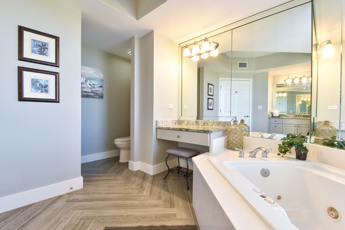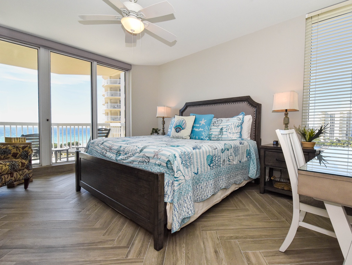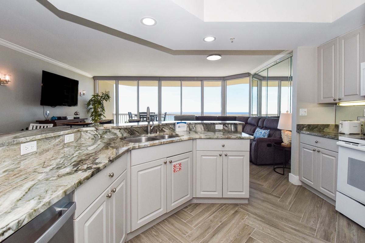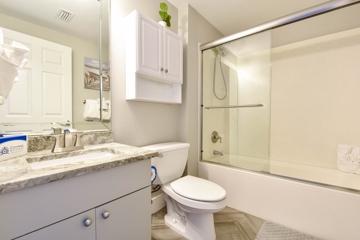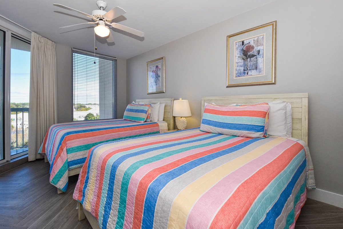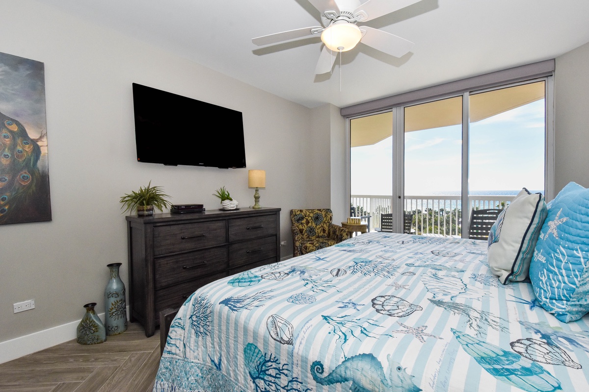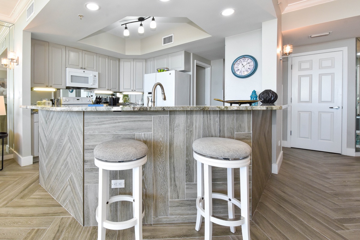 The primary bedroom has incredible beach views and private access to the beachfront balcony. Complete with a king bed, walk-in closet, flat-screen TV, and private ensuite bathroom, the primary bedroom was designed with relaxation in mind. The primary bathroom features a soaker tub, a walk-in shower with a built-in bench, and two separate vanities. Both guest bedrooms face the north side of the resort and offer unbeatable views of the resort grounds. The first guest bedroom has two queen beds, a flat-screen TV, and private access to the north balcony. The first guest bedroom has a private en-suite bathroom with a tub/shower combination. The second guest bedroom has two queen beds, a flat-screen TV, and private access to the north balcony. Just steps from both the second guest bedroom and the living area is a full bathroom with a walk-in shower.