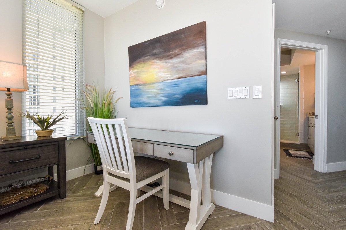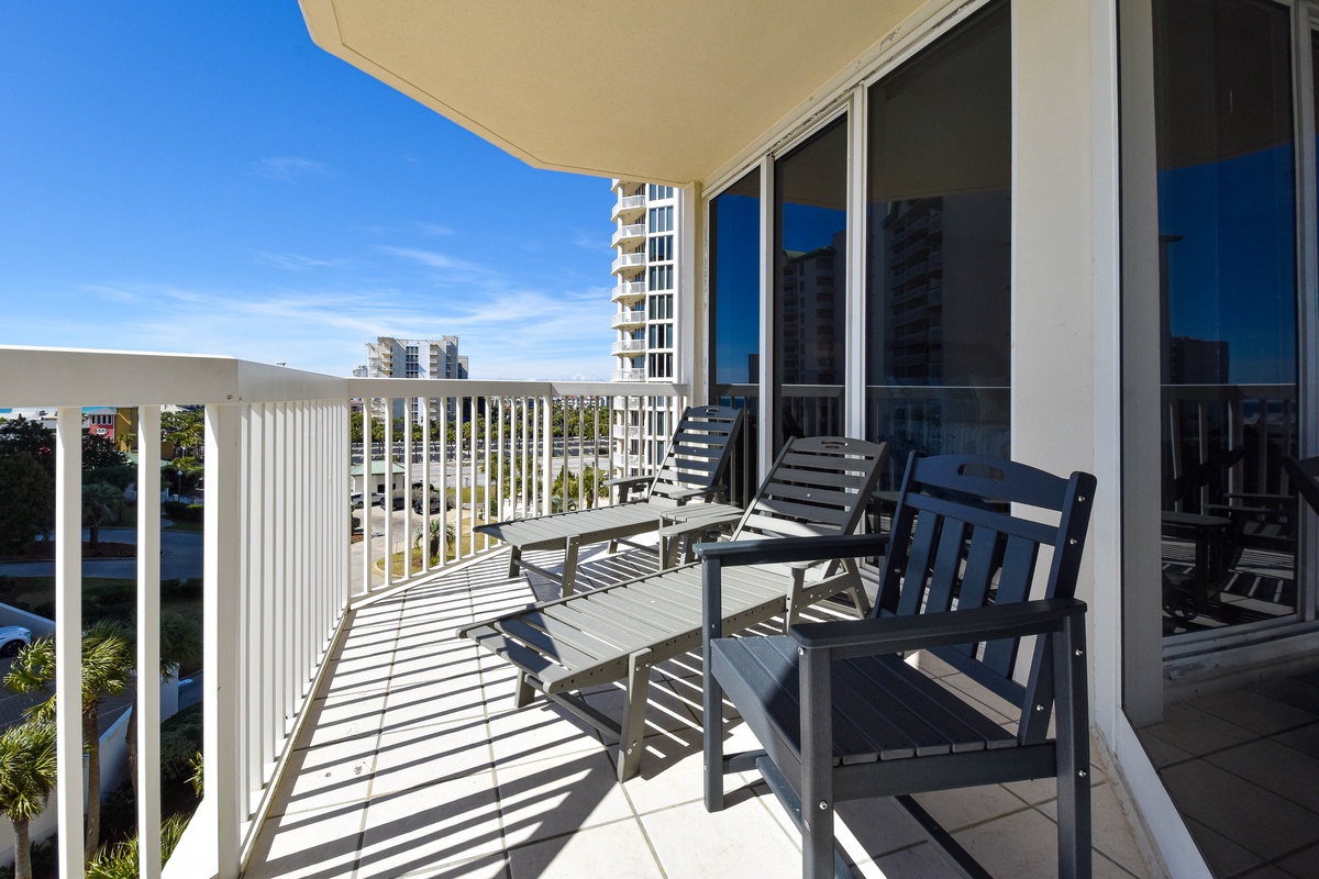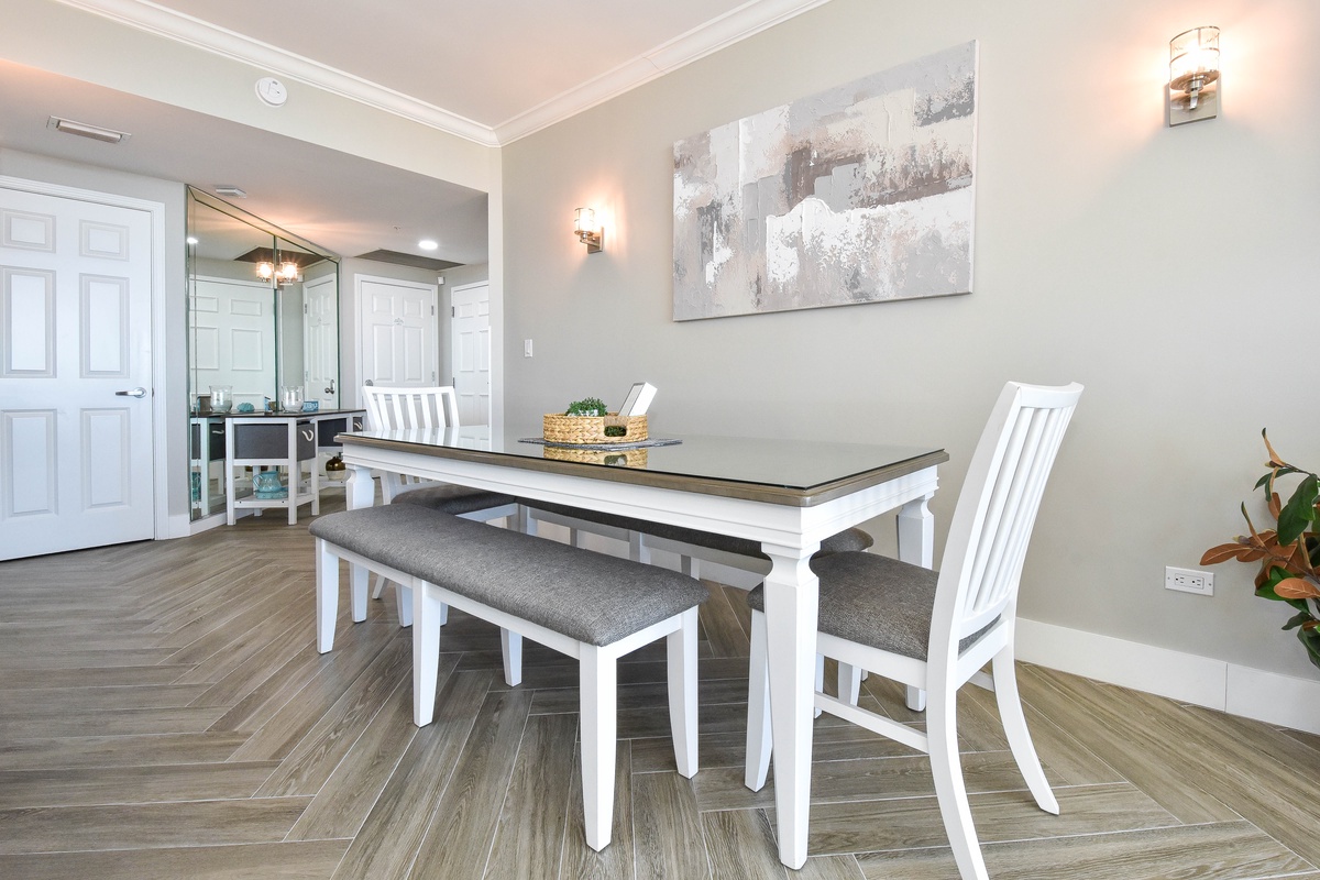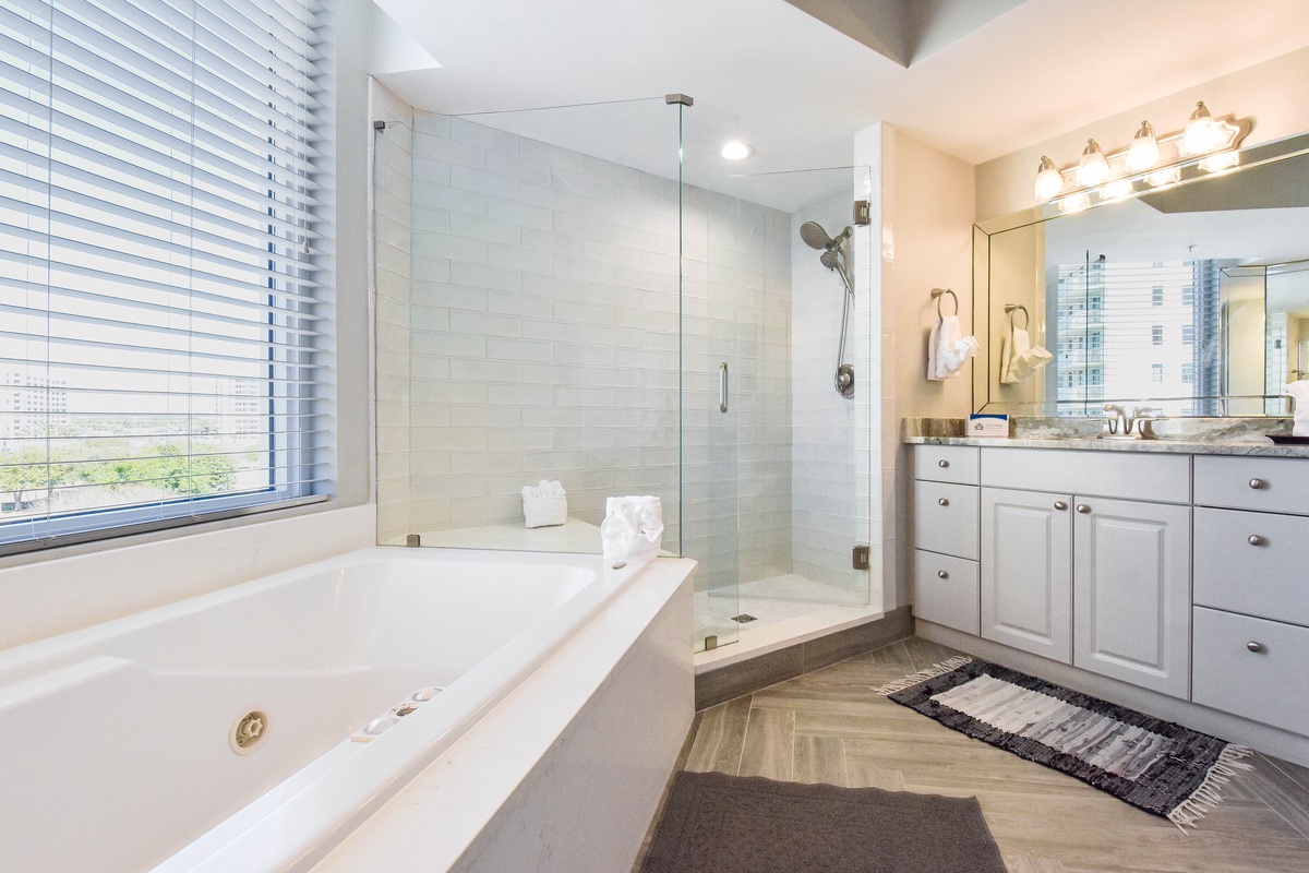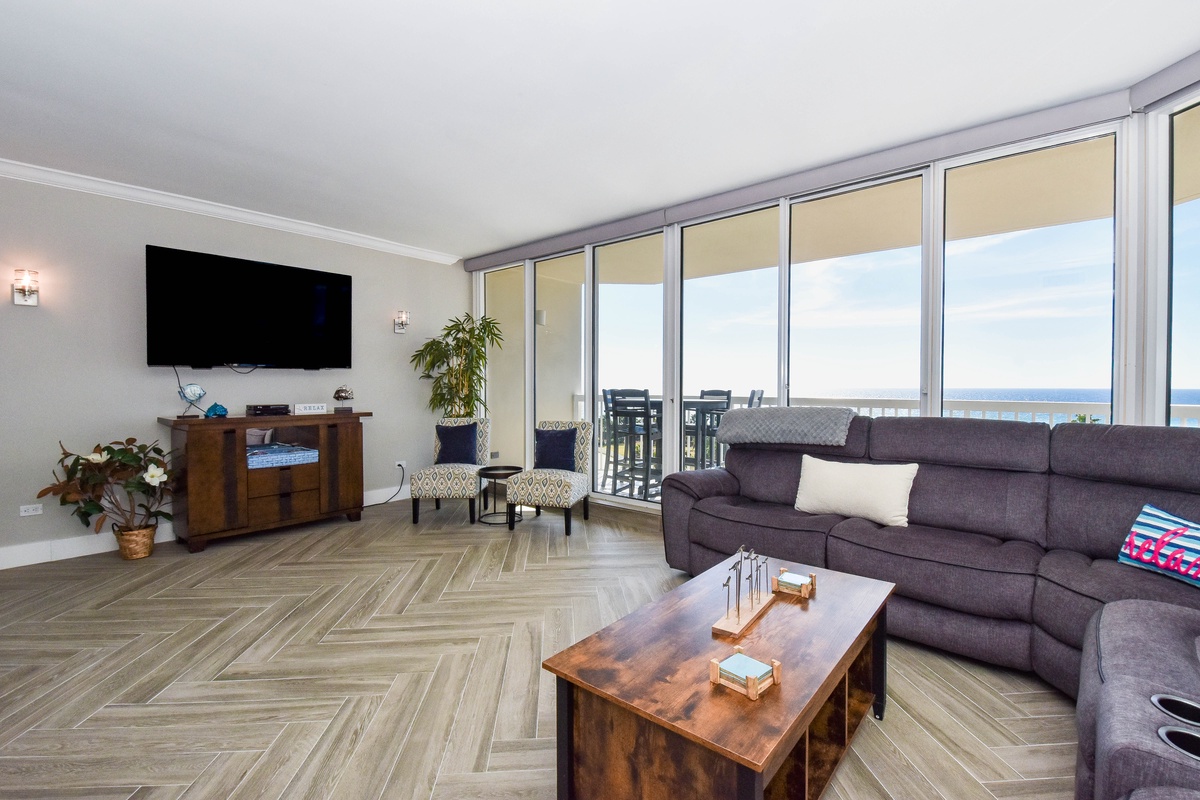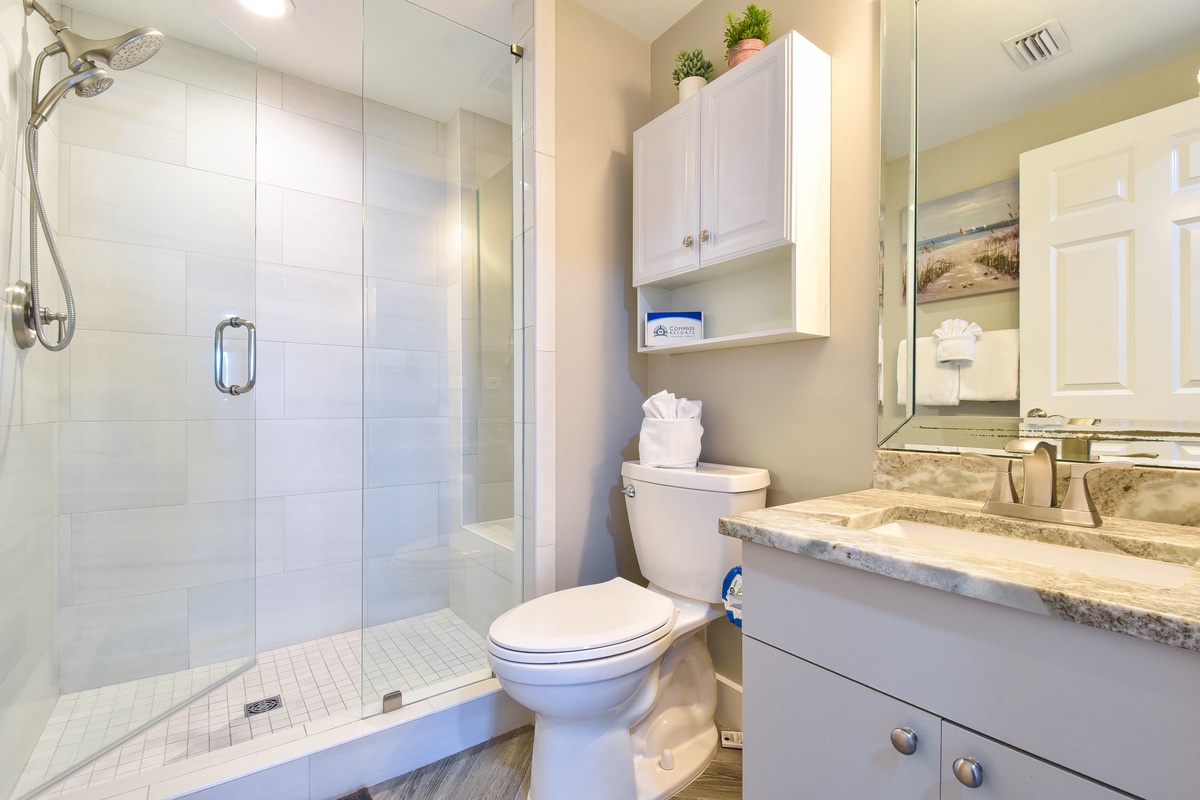 The primary bedroom has incredible beach views and private access to the beachfront balcony. Complete with a king bed, walk-in closet, flat-screen TV, and private ensuite bathroom, the primary bedroom was designed with relaxation in mind. The primary bathroom features a soaker tub, a walk-in shower with a built-in bench, and two separate vanities. Both guest bedrooms face the north side of the resort and offer unbeatable views of the resort grounds. The first guest bedroom has two queen beds, a flat-screen TV, and private access to the north balcony. The first guest bedroom has a private en-suite bathroom with a tub/shower combination. The second guest bedroom has two queen beds, a flat-screen TV, and private access to the north balcony. Just steps from both the second guest bedroom and the living area is a full bathroom with a walk-in shower.