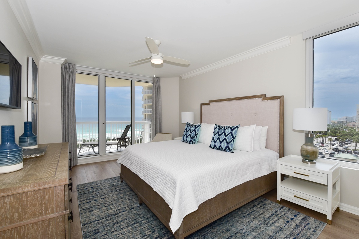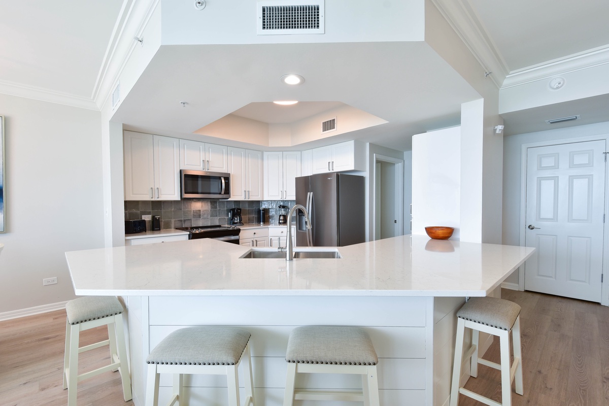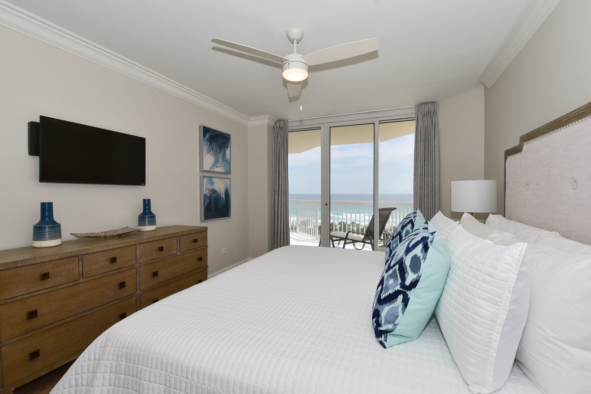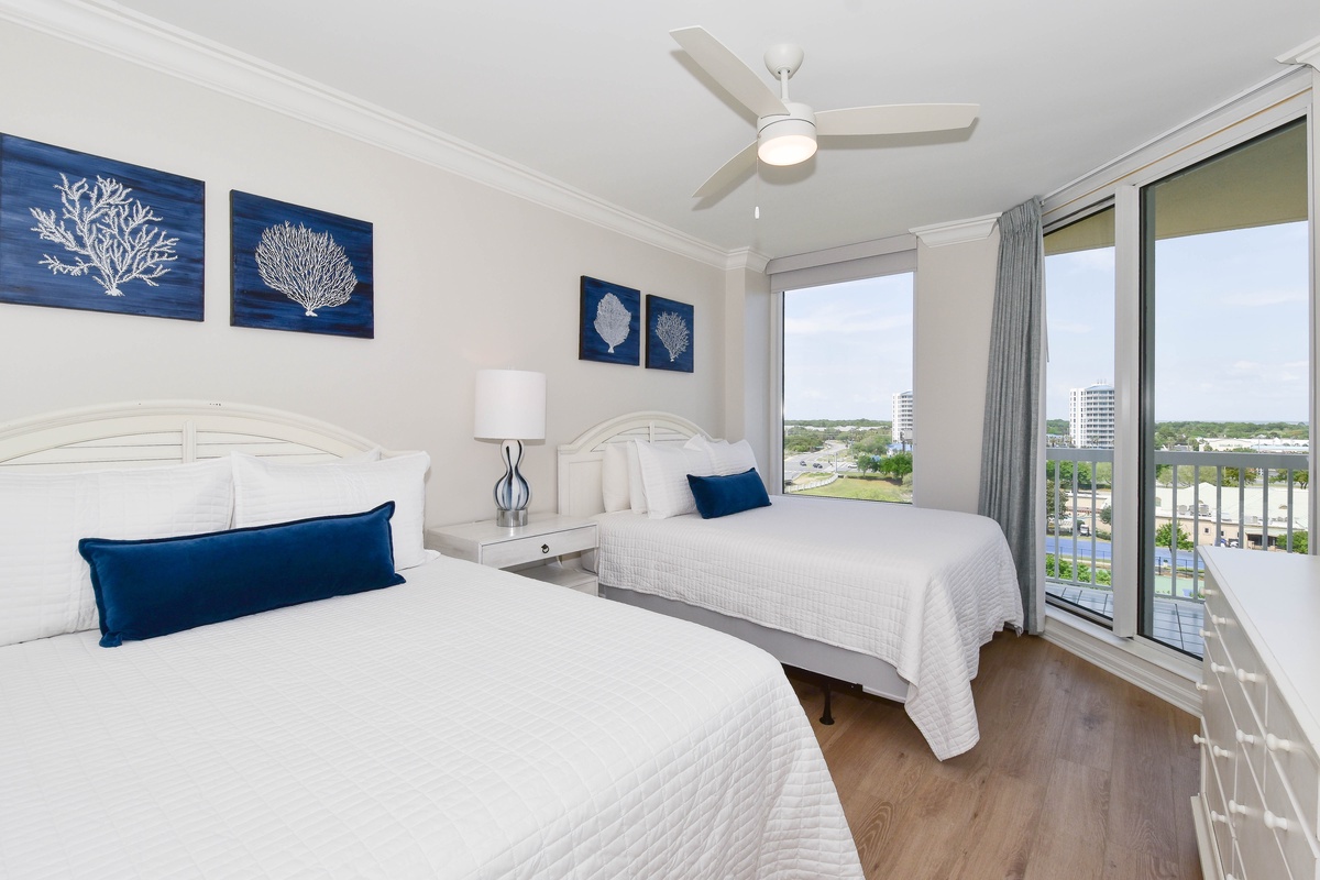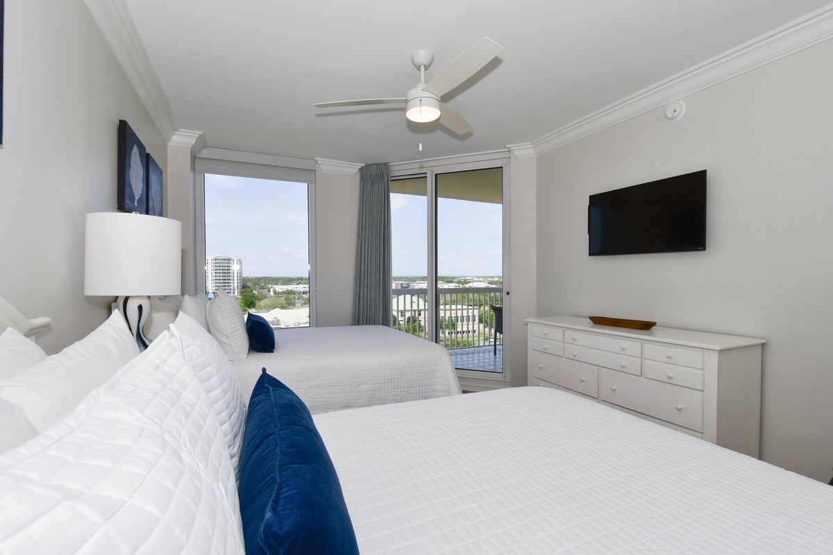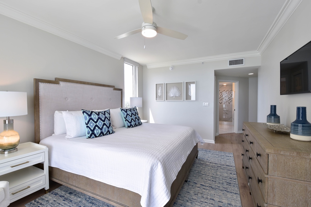 The serene master bedroom has incredible beach views and private access to the beachfront balcony. Complete with a king bed, flat-screen TV, and private ensuite bathroom, the master bedroom was designed with relaxation in mind. The master bathroom features a soaking tub, a walk-in shower, and two vanity spaces. Both guest bedrooms face the north side of the resort and offer unbeatable views of the resort grounds. The first guest bedroom has a king bed, a flat-screen TV, and private access to the north balcony. An en-suite bathroom is attached to the first guest bedroom with a shower-tub combination. The second guest bedroom has two queen beds, a flat-screen TV, and private access to the north balcony. Just steps from both the second guest bedroom and the living area is a full bathroom with a walk-in shower.