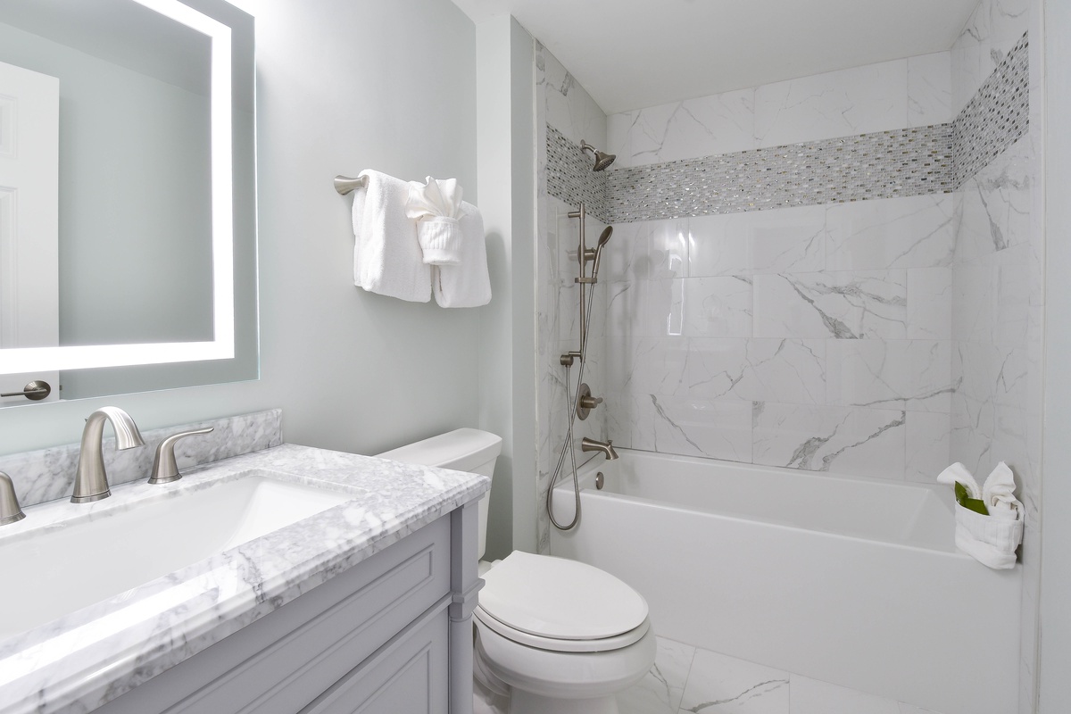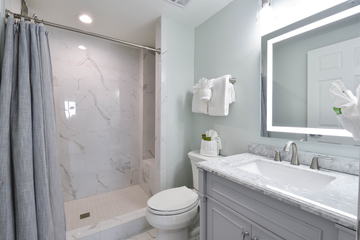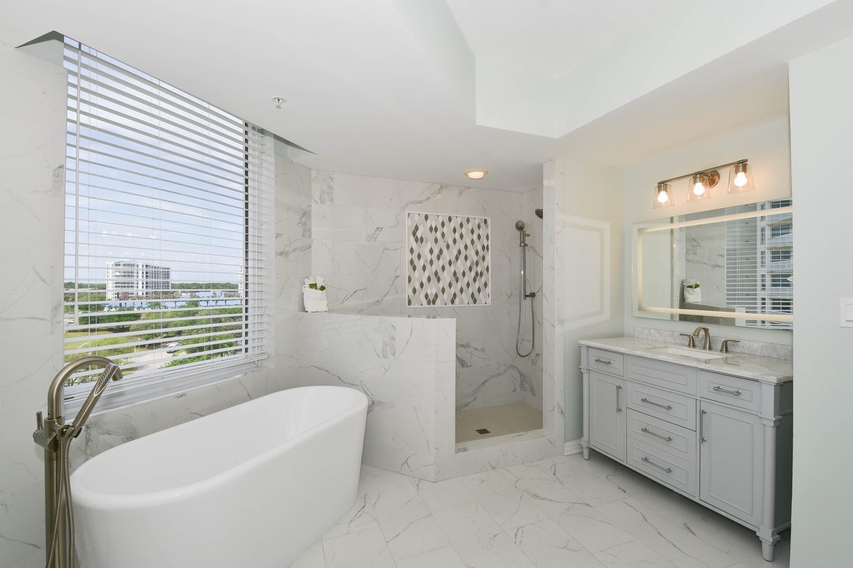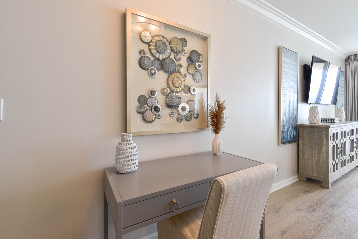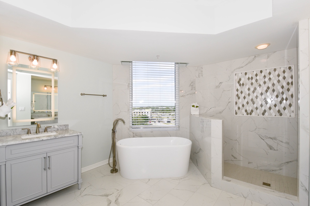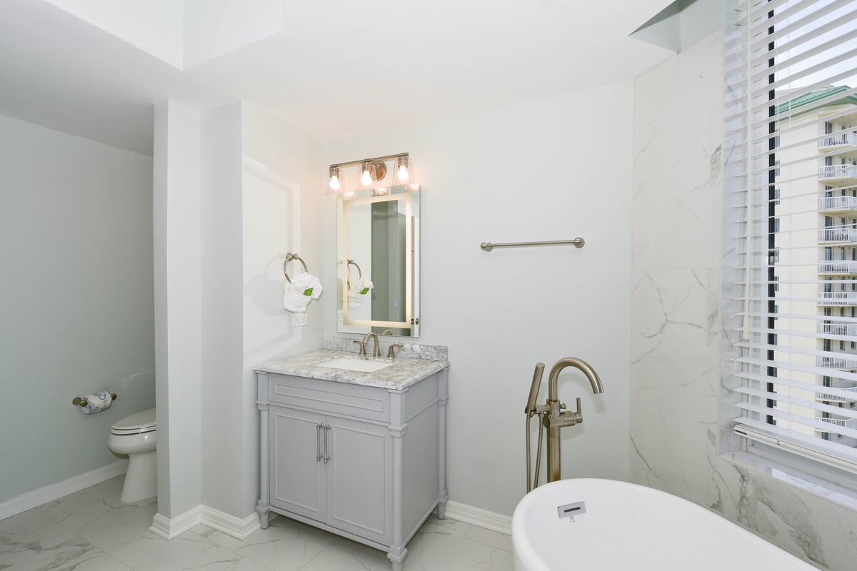 The serene master bedroom has incredible beach views and private access to the beachfront balcony. Complete with a king bed, flat-screen TV, and private ensuite bathroom, the master bedroom was designed with relaxation in mind. The master bathroom features a soaking tub, a walk-in shower, and two vanity spaces. Both guest bedrooms face the north side of the resort and offer unbeatable views of the resort grounds. The first guest bedroom has a king bed, a flat-screen TV, and private access to the north balcony. An en-suite bathroom is attached to the first guest bedroom with a shower-tub combination. The second guest bedroom has two queen beds, a flat-screen TV, and private access to the north balcony. Just steps from both the second guest bedroom and the living area is a full bathroom with a walk-in shower.