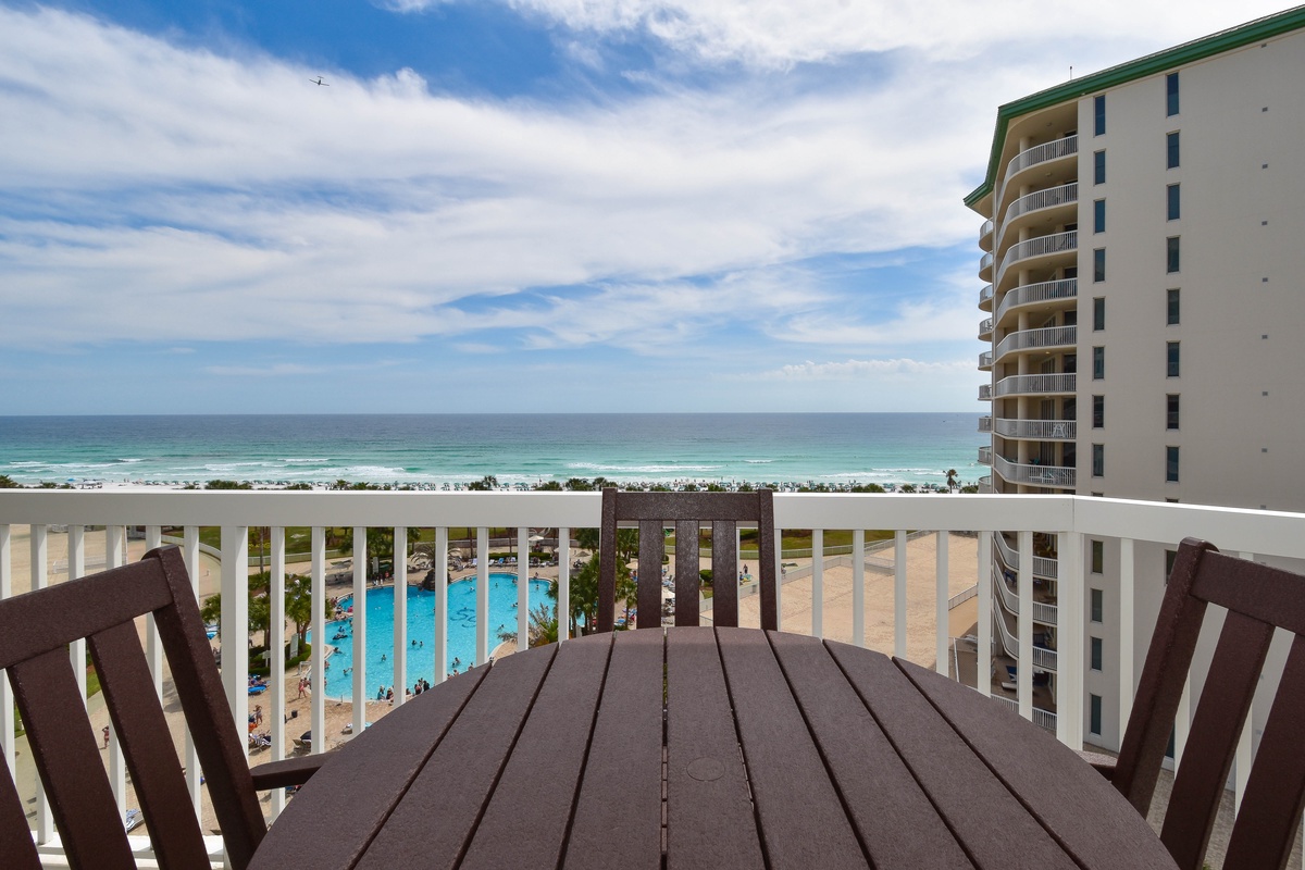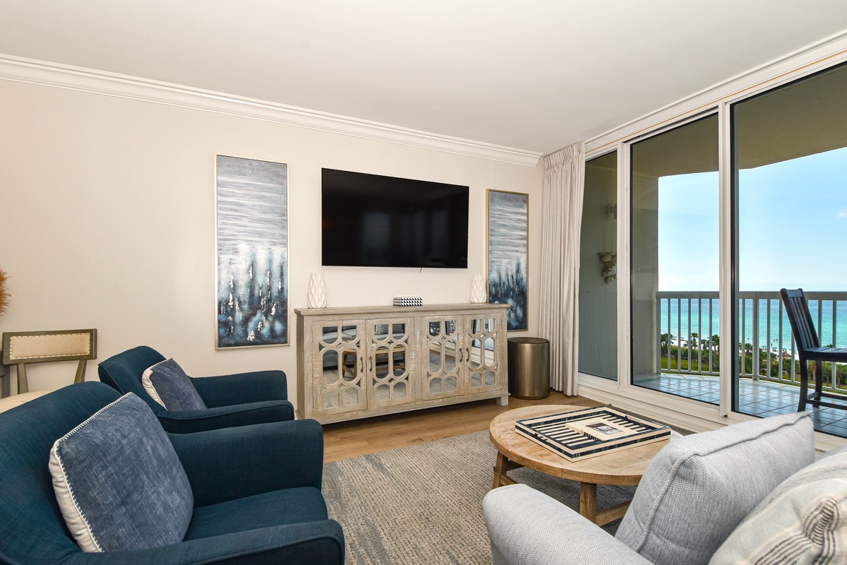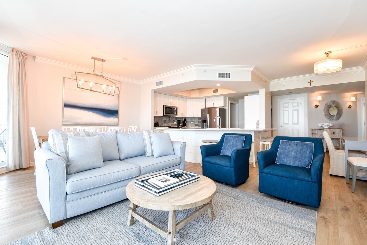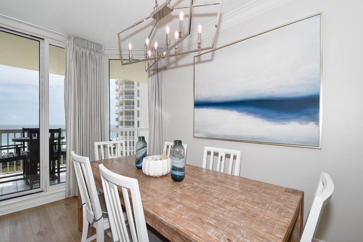 Recently upgraded, the interior spaces of Silver Shells St. Croix 806 have been designed with a cool and calming feel. An open floor plan gives the whole family space to relax together. The living area is beach-facing, features floor-to-ceiling windows and sliding glass doors, and offers plenty of seating for everyone to gather around the flat-screen TV. There is even a workspace area in the Living Area. The spacious beachfront balcony is perfectly furnished to allow for relaxing or dining while taking in spectacular views of the white sand beach and emerald waters. The dining area has seating for six with three additional seats at the nearby breakfast bar. The fully equipped kitchen includes full-size appliances and all the cookware and dishware you could need for creating memorable meals.