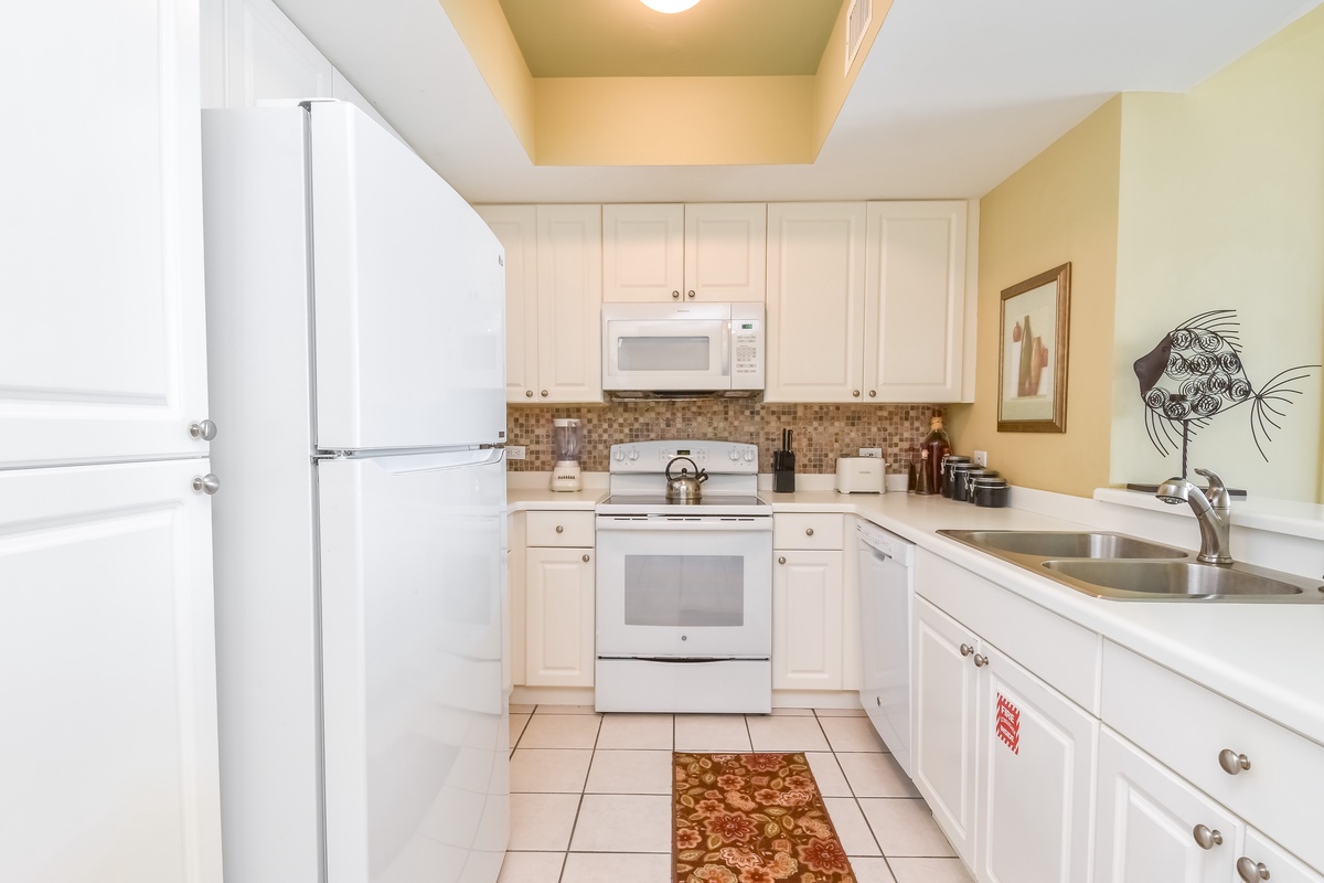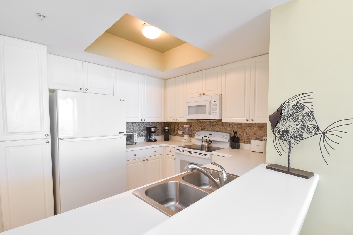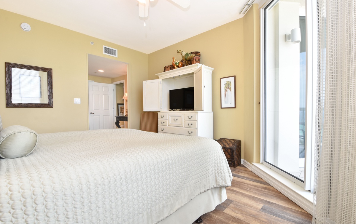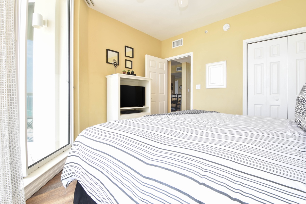 The master bedroom has incredible beach views and private access to the beachfront balcony. Complete with a king bed, walk-in closet, flat-screen TV, and private ensuite bathroom, the master bedroom was designed with relaxation in mind. The master bathroom features a jetted tub, walk-in shower, and plenty of vanity space. The guest bedroom has a king bed, a flat-screen TV, and private access to the beachfront balcony. Just steps from both the guest bedroom and the living area is a full bathroom with a walk-in shower. Inside the guest bathroom is a laundry closet complete with a full-size washer and dryer.