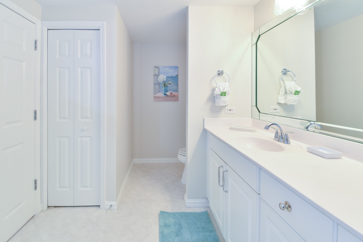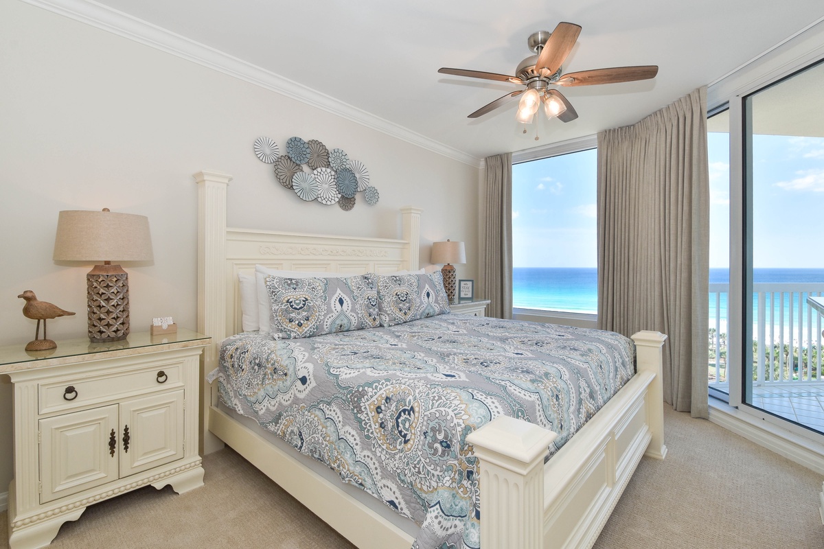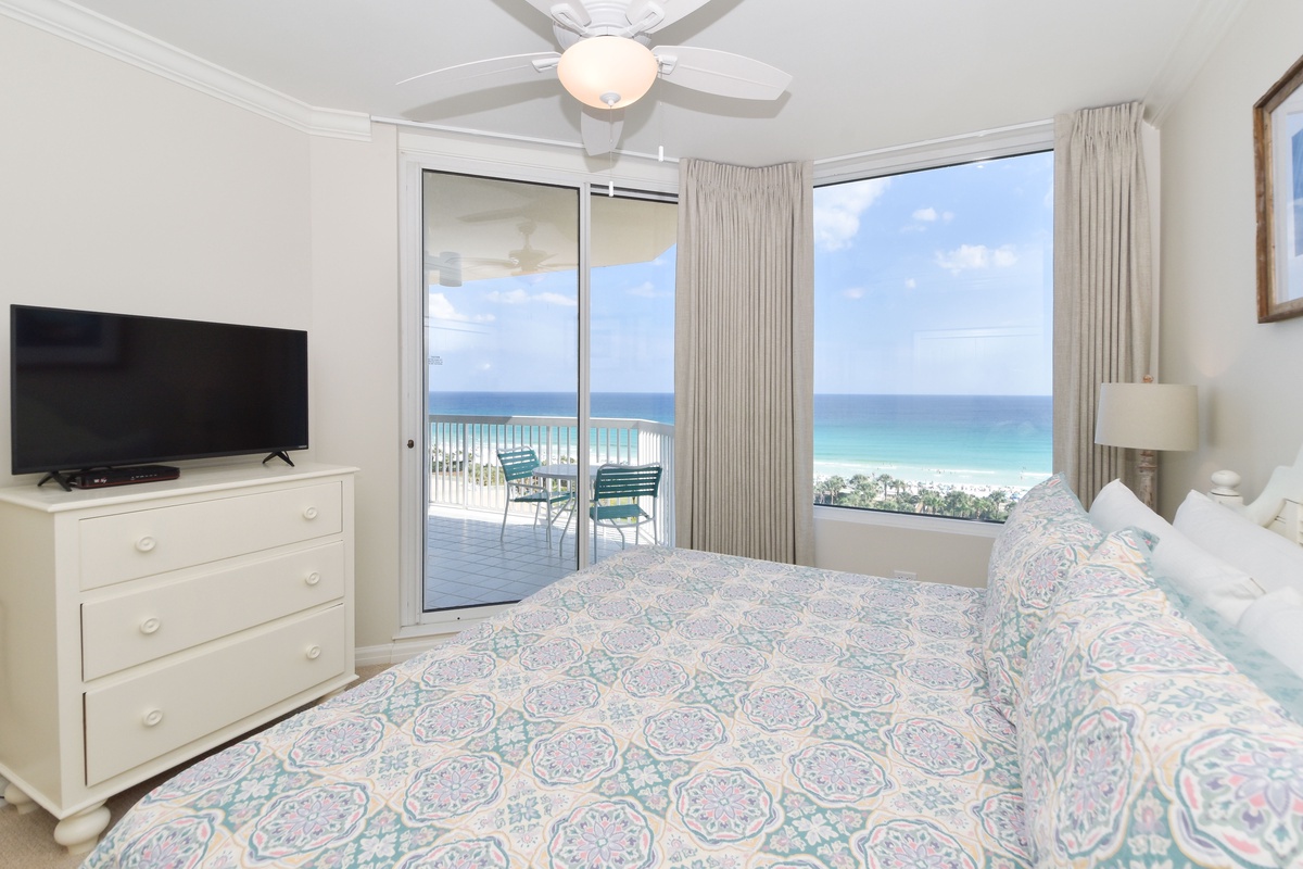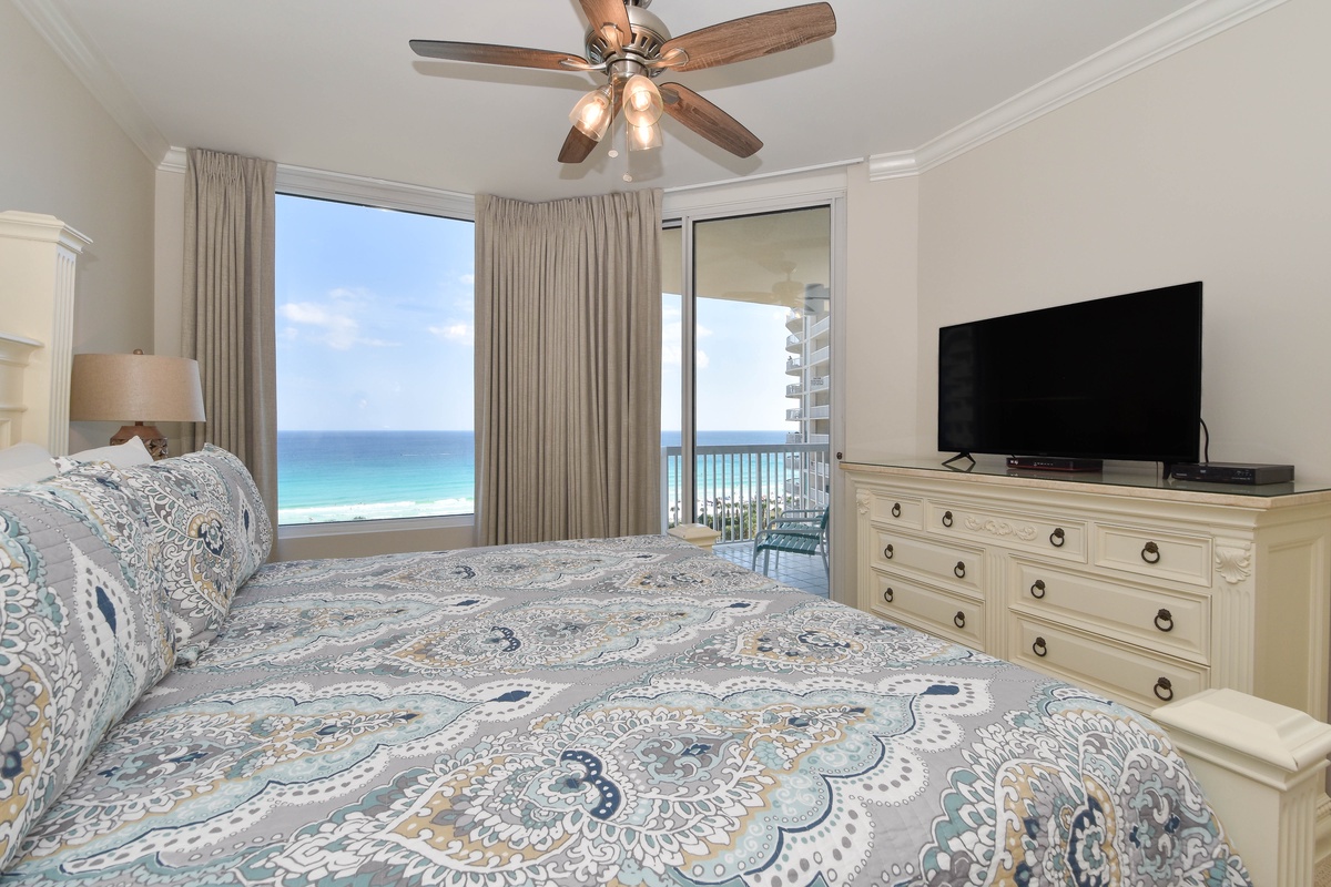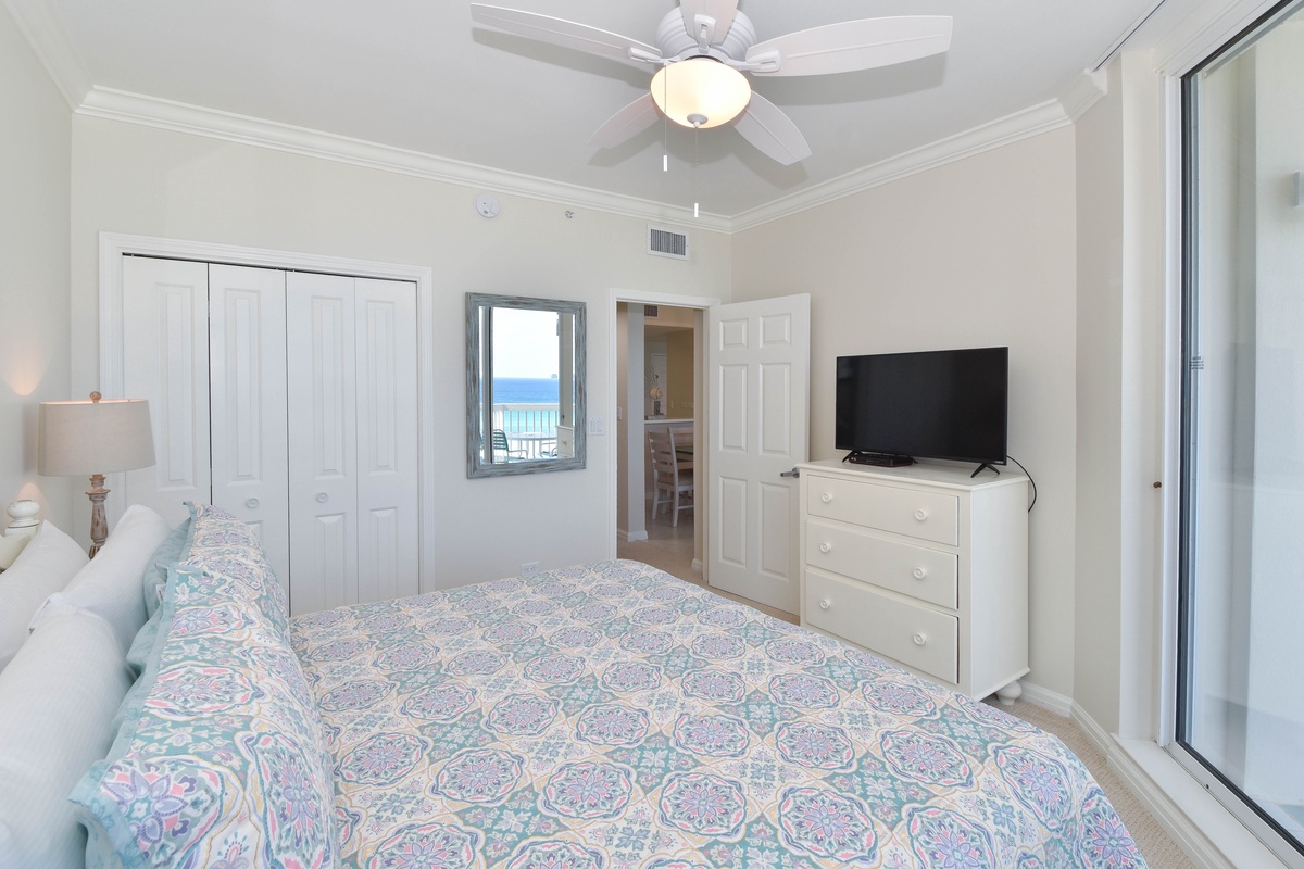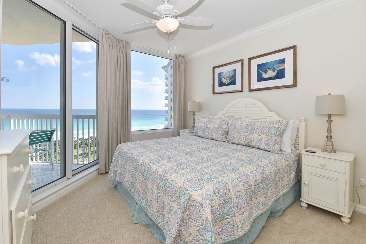 The master bedroom has incredible beach views and private access to the beachfront balcony. Complete with a king bed, flat-screen TV, walk-in closet, and private ensuite bathroom, the master bedroom was designed with relaxation in mind. The attached master bathroom features a jacuzzi tub and walk-in shower. The guest bedroom also features a king bed, a flat-screen TV, and private access to the beachfront balcony. Just a few steps from both the guest bedroom and the living area is a full bathroom with a walk-in shower. There is also a laundry closet with a full-size washer and dryer.