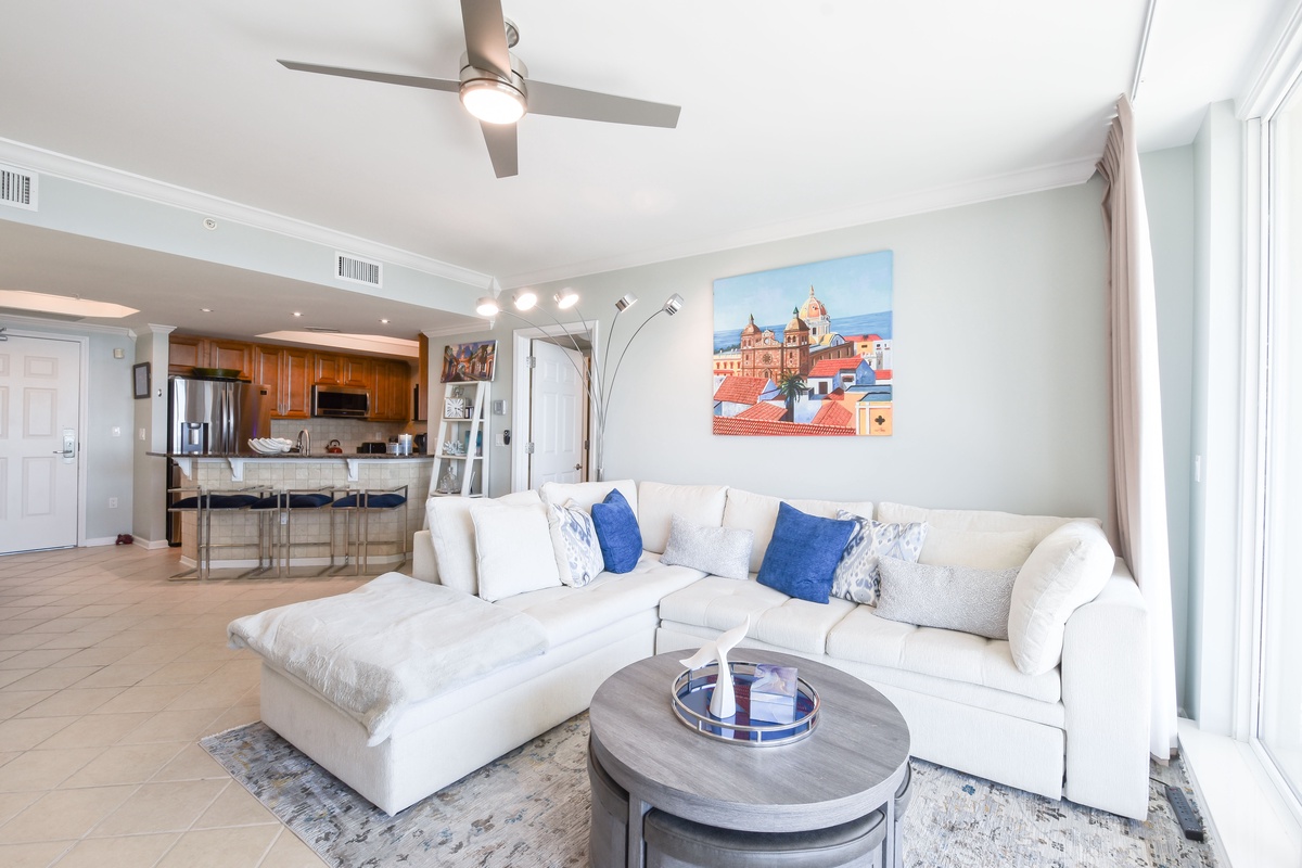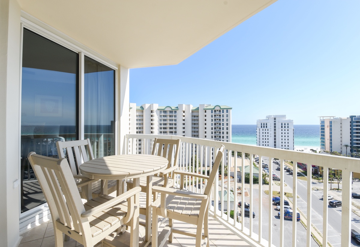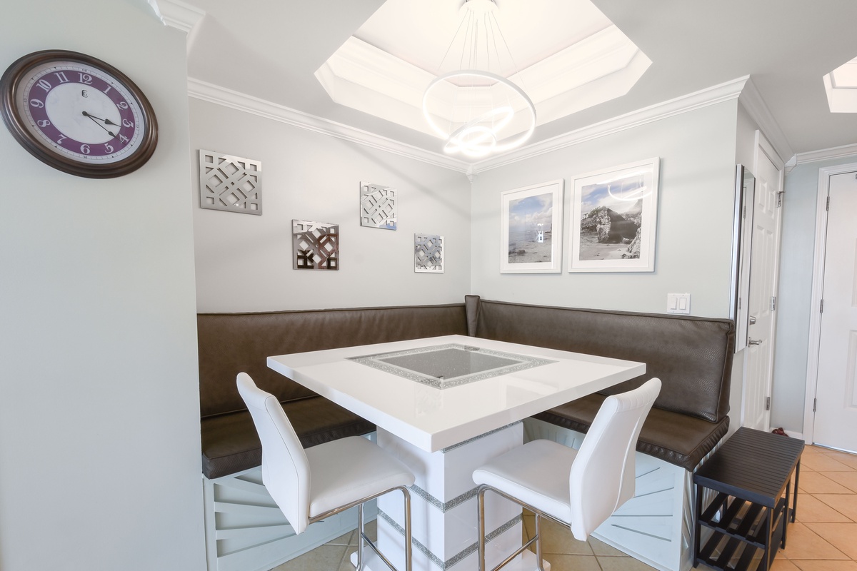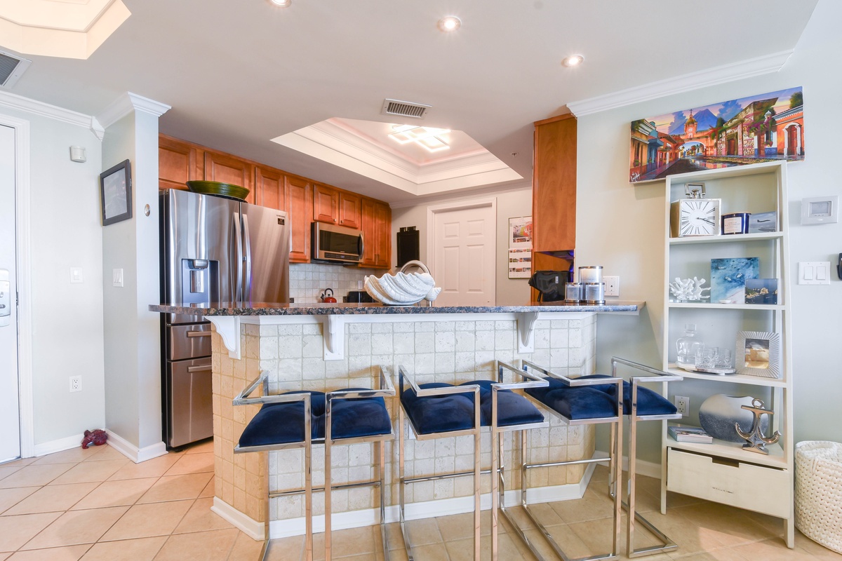 The interior spaces of Silver Shells St. Lucia 1105 have been tastefully decorated with a trendy seaside theme. An open floor plan gives the whole family or group space to relax together. The living area is beach-facing, features floor-to-ceiling windows and sliding glass doors, and offers seating for everyone to gather around the flat-screen TV. The couch even converts to a queen sleeper sofa for larger parties. The spacious beach-facing balcony is perfectly furnished to allow for entertaining or dining while taking in spectacular views of the white sand beach and emerald waters. The dining area has bench-style seating for four and three additional seats at the breakfast bar. The fully equipped kitchen includes full-size appliances, granite countertops, and all the cookware and dishware you could need for creating memorable meals.