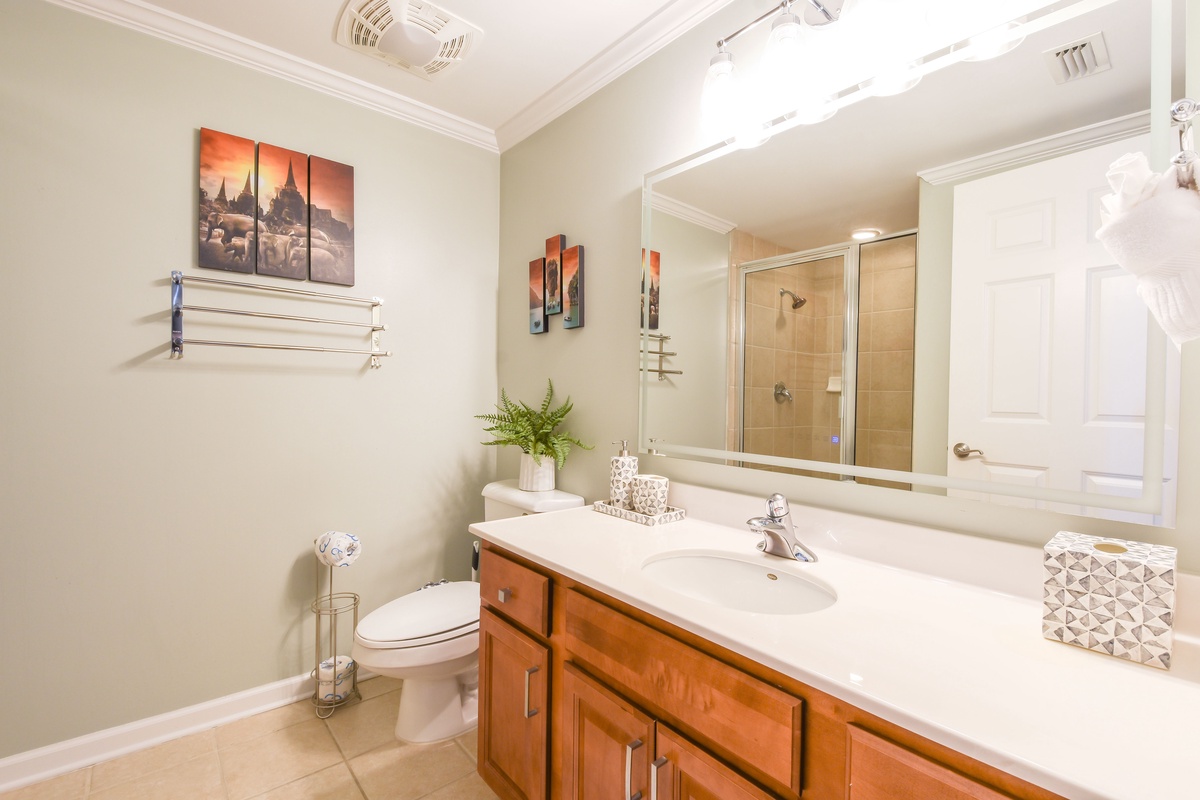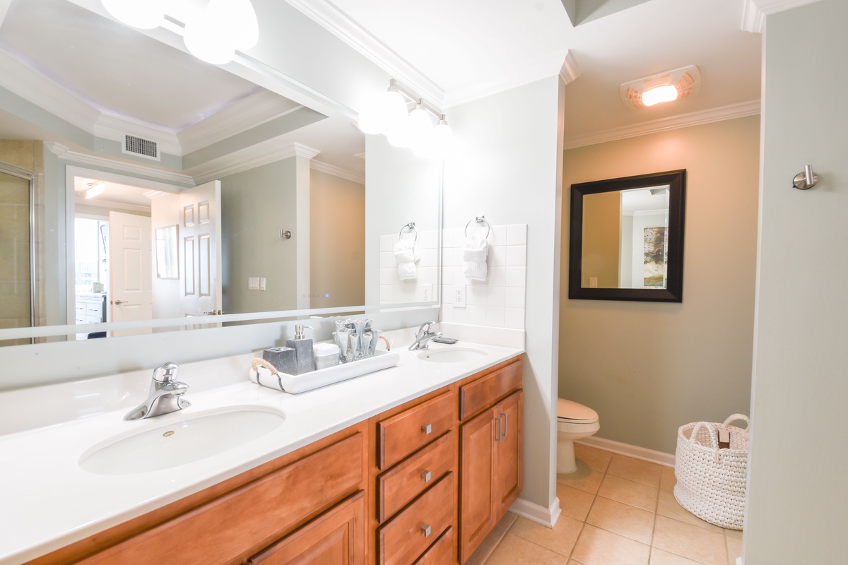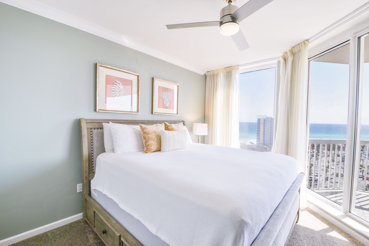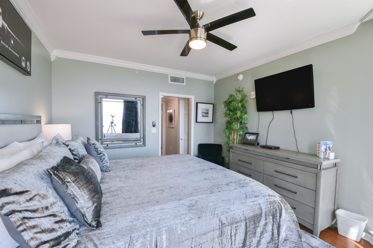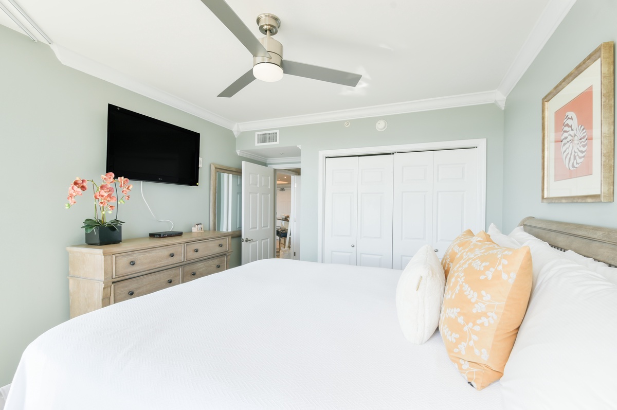The master bedroom has incredible beach views and private access to the beach-facing balcony. Complete with a king bed, flat-screen TV, and private ensuite bathroom, the master bedroom was designed with relaxation in mind. The master bathroom features a jetted tub, walk-in shower with a built-in bench, and double vanity. The guest bedroom has a king bed, flat-screen TV, and private access to the beach-facing balcony. Just steps from both the guest bedroom and the living area is a full bathroom with a walk-in shower.