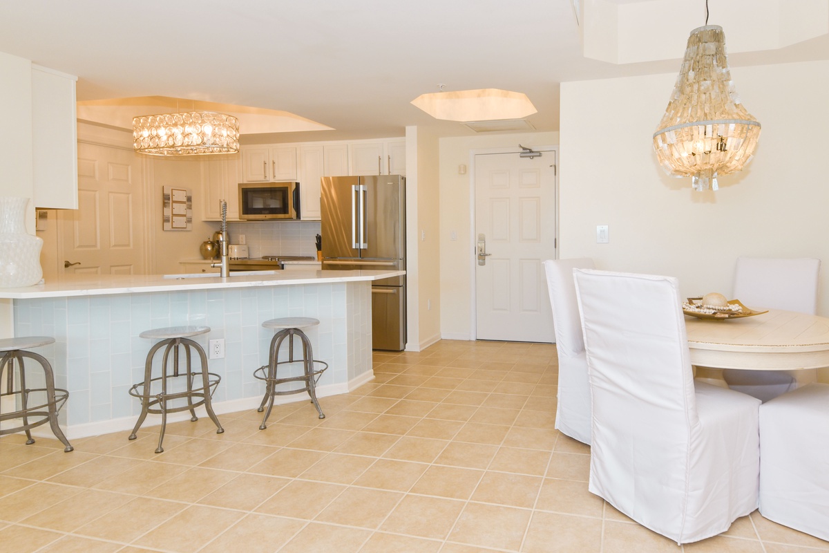The interior spaces of Silver Shells St. Lucia 402 have been tastefully decorated. An open floor plan gives the whole family or group space to relax together. The living area is beach-facing, features floor-to-ceiling windows and sliding glass doors, and offers plenty of seating for everyone to gather around the flat-screen TV. The spacious beach-facing balcony is perfectly furnished to allow for entertaining or dining while taking in spectacular views of the white sand beach and emerald waters. The dining area has seating for four with three additional seats at the breakfast bar. The fully equipped kitchen includes full-size stainless steel appliances and all the cookware and dishware you could need for creating memorable meals.