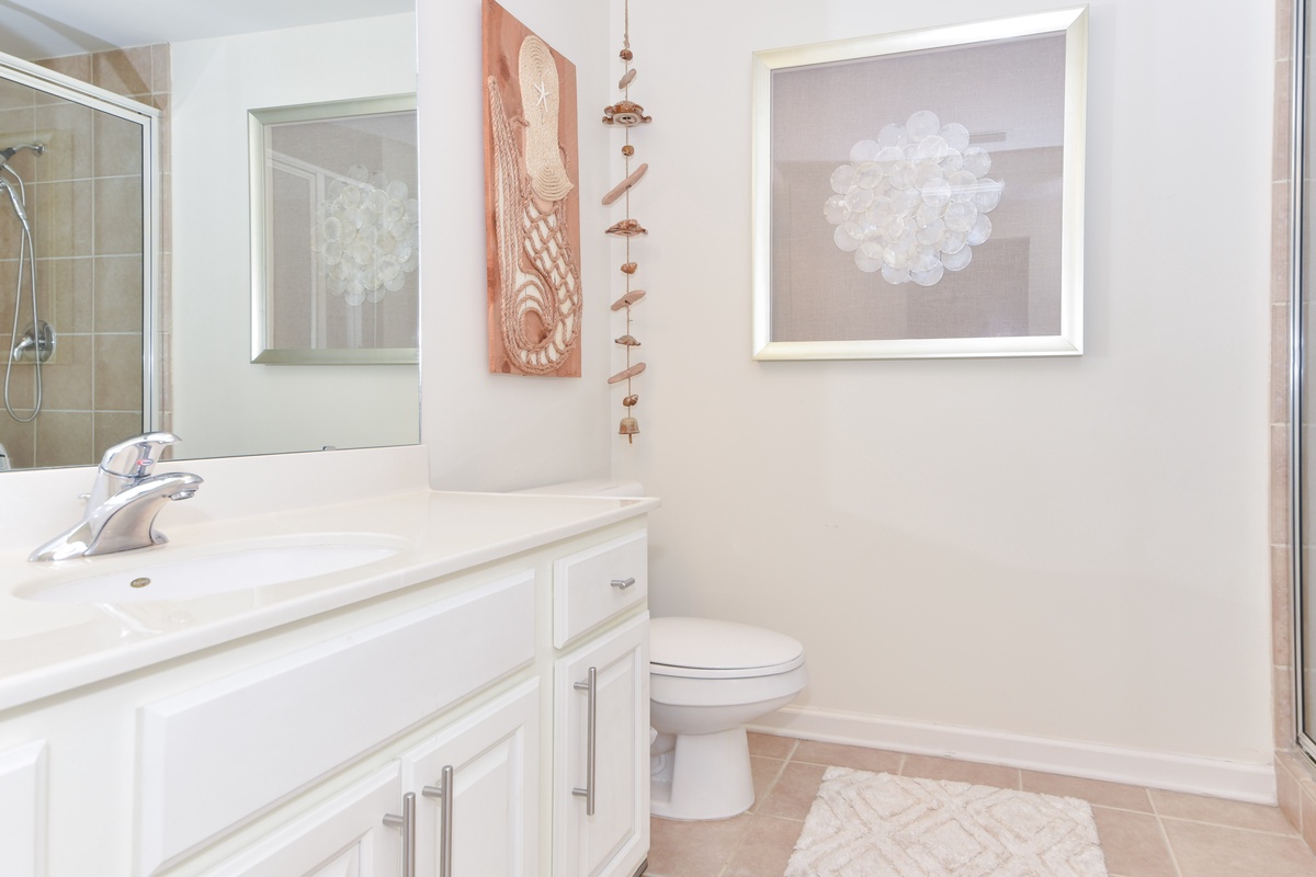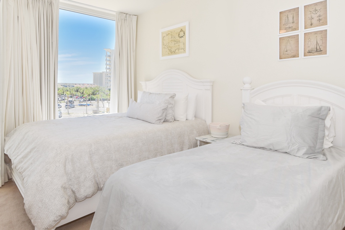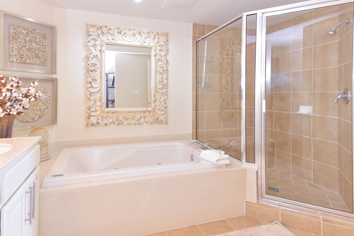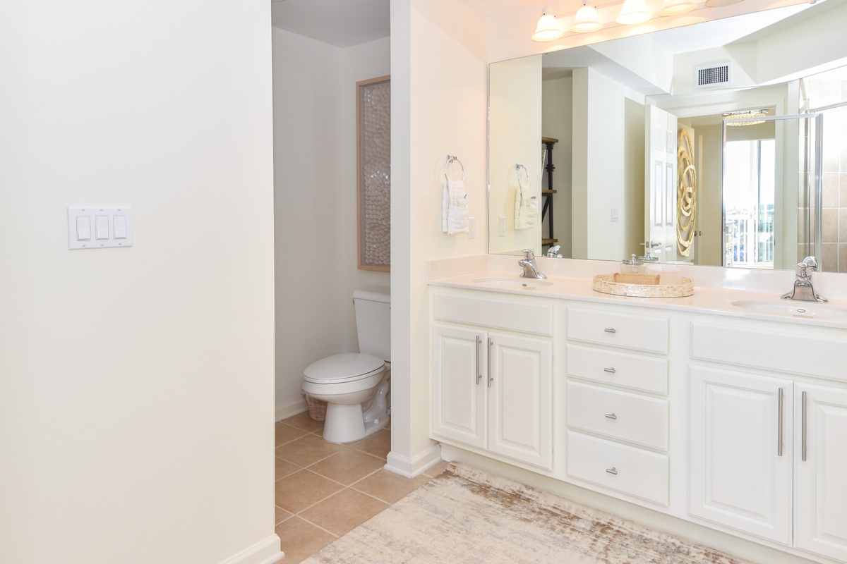 The master bedroom has beach views and private access to the beach-facing balcony. Complete with a king bed, flat-screen TV, and private ensuite bathroom, the master bedroom was designed with relaxation in mind. The master bathroom features a jetted tub, walk-in shower, and double vanity. The guest bedroom has a full and twin bed, flat-screen TV, and private access to the beach-facing balcony. Just steps from both the guest bedroom and the living area is a full bathroom with a walk-in shower.