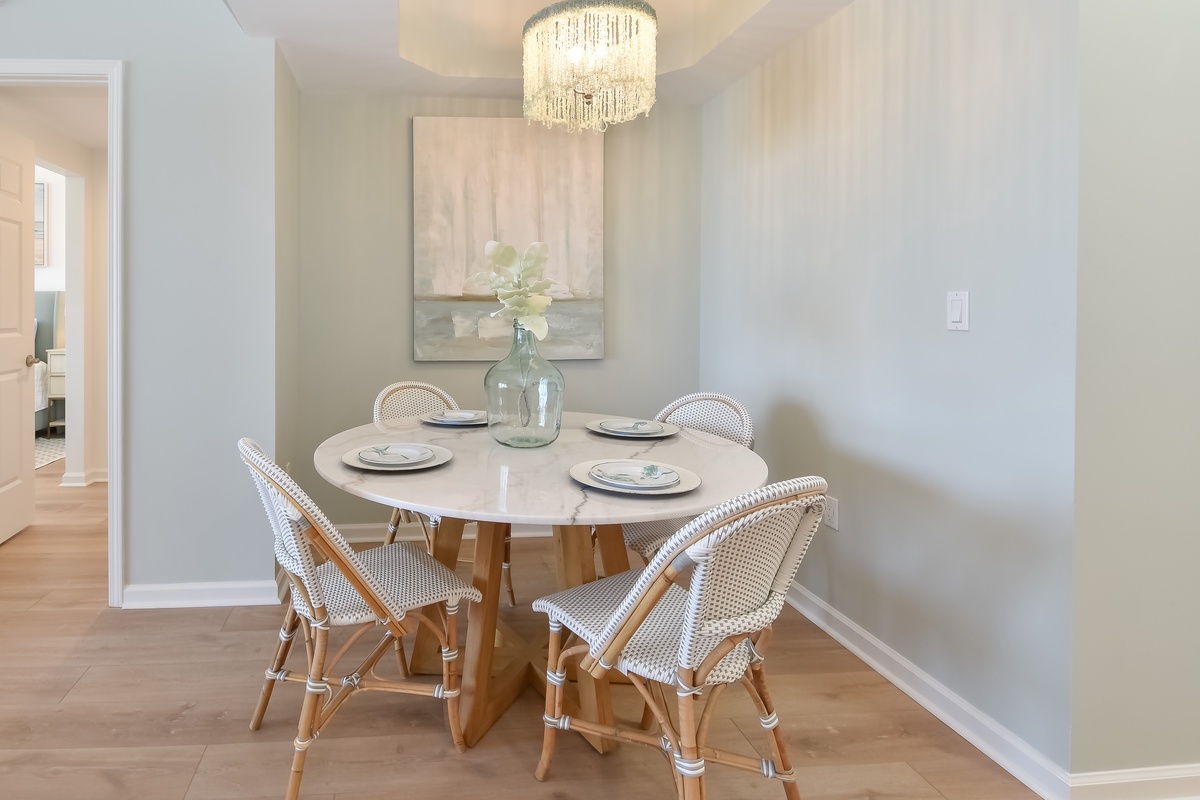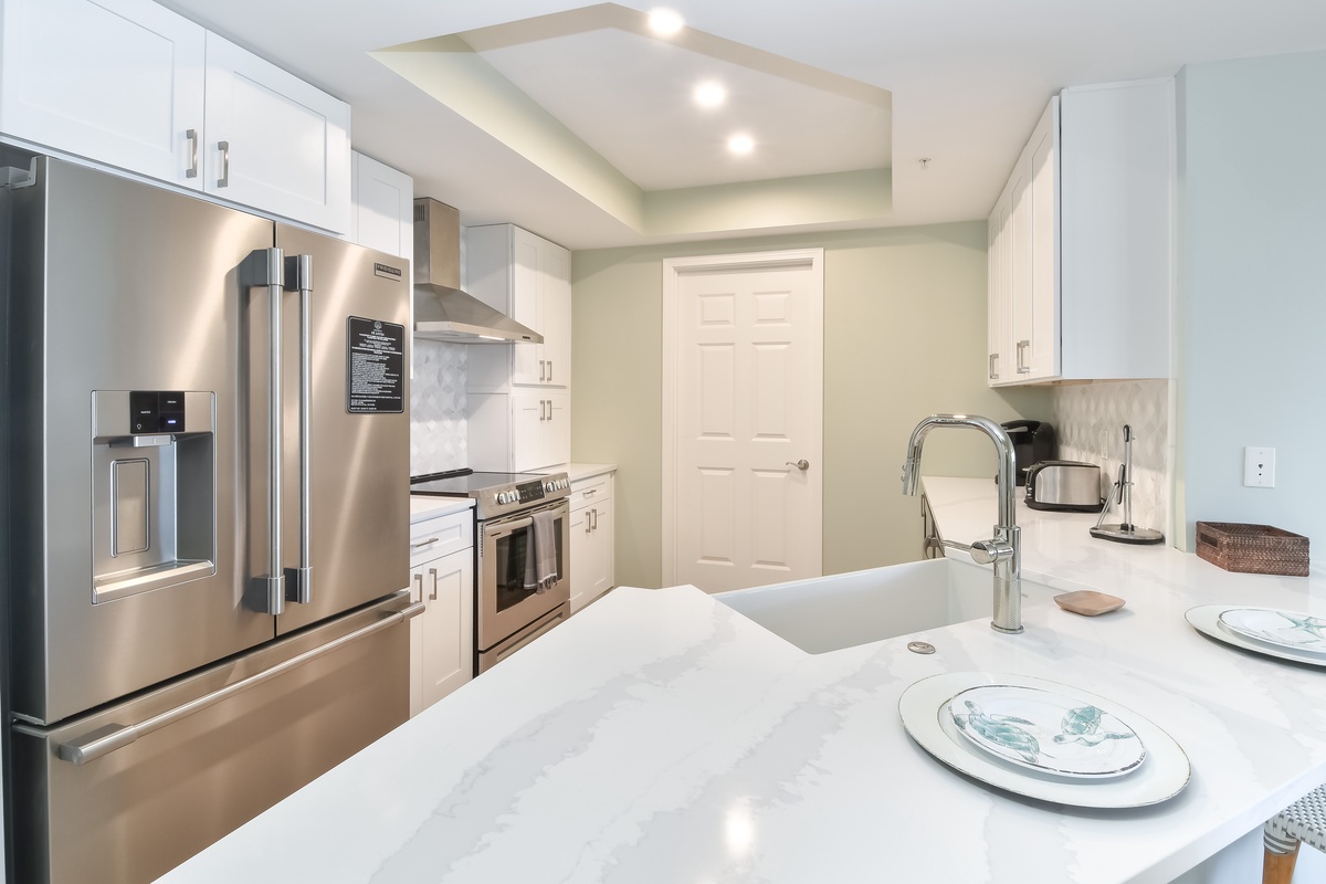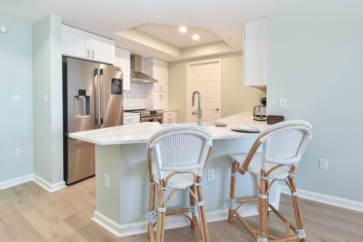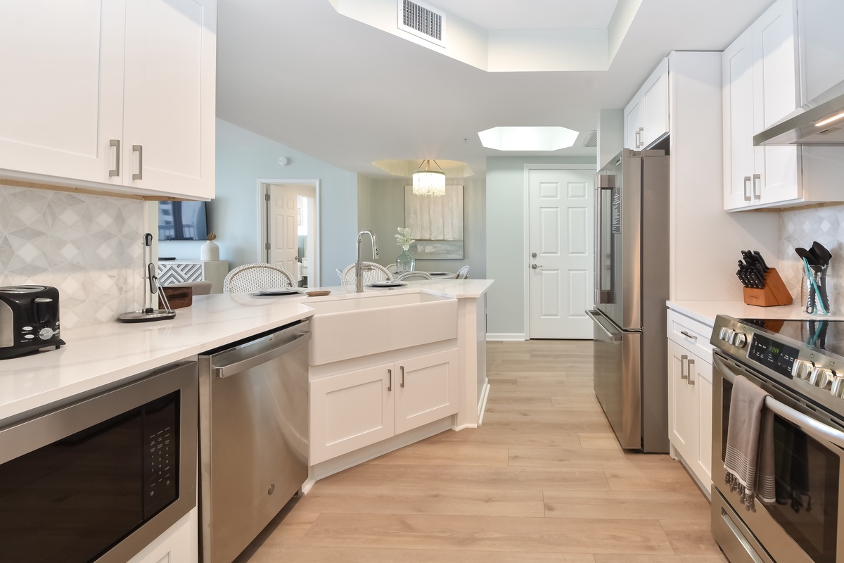 The interior spaces of Silver Shells St. Lucia 903 have been impeccably decorated with a spa-like serene feel. An open floor plan gives the whole family or group space to relax together. The living area is beach-facing, features floor-to-ceiling windows and sliding glass doors, and provides plenty of seating for everyone to gather around the flat-screen TV. The spacious beach-facing balcony is perfectly furnished for entertaining or dining while taking in the Gulf breezes and spectacular views of the white sand beach and emerald waters. The dining area has seating for four with two additional seats at the breakfast bar. The fully equipped kitchen includes full-size stainless steel appliances, a beautiful farmhouse sink, and all the cookware and dishware you could need for creating memorable meals. Right off the kitchen is a laundry closet with a full-size washer and dryer.
