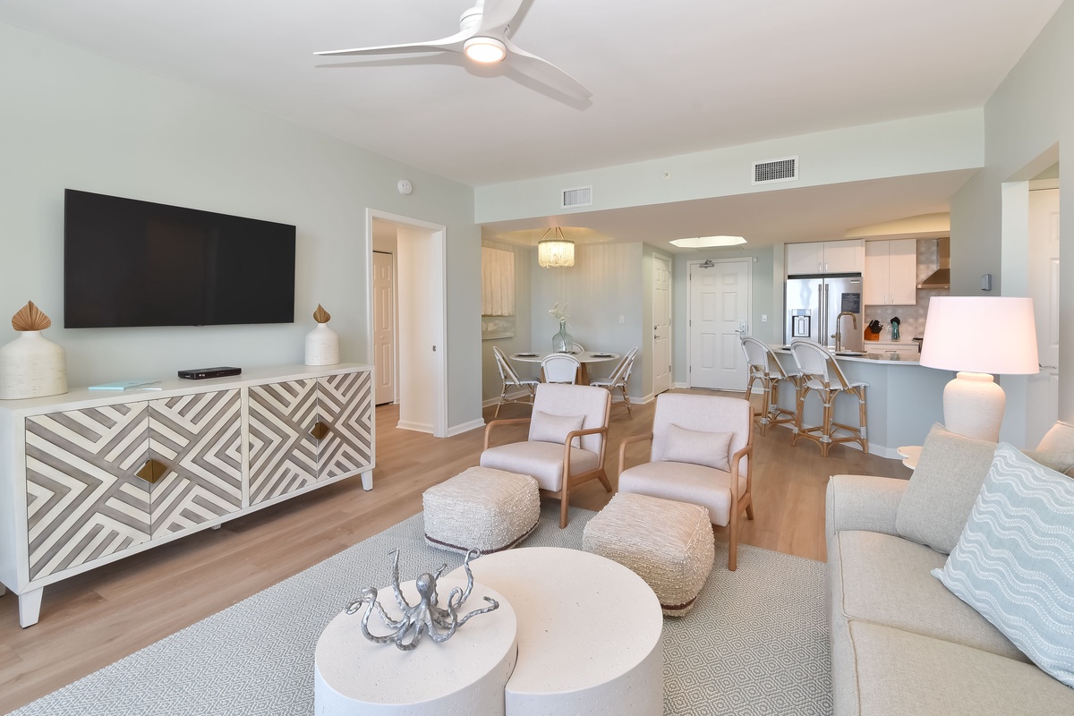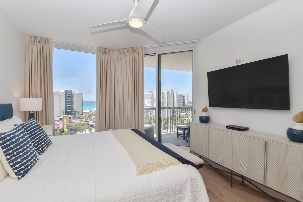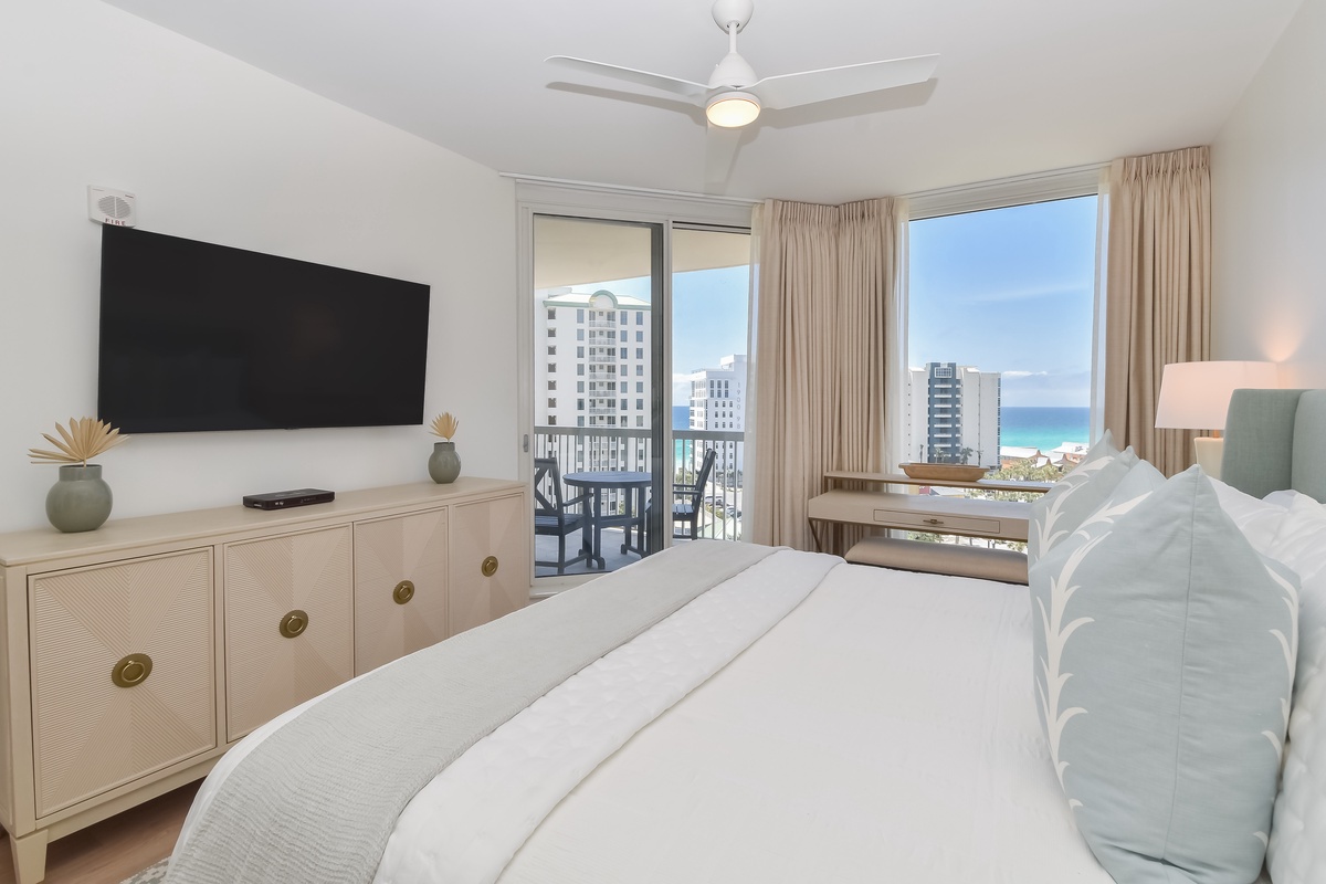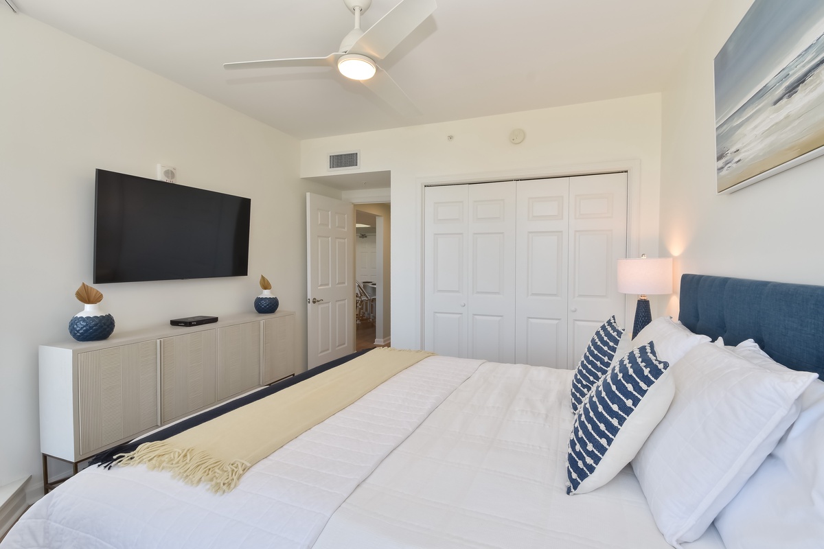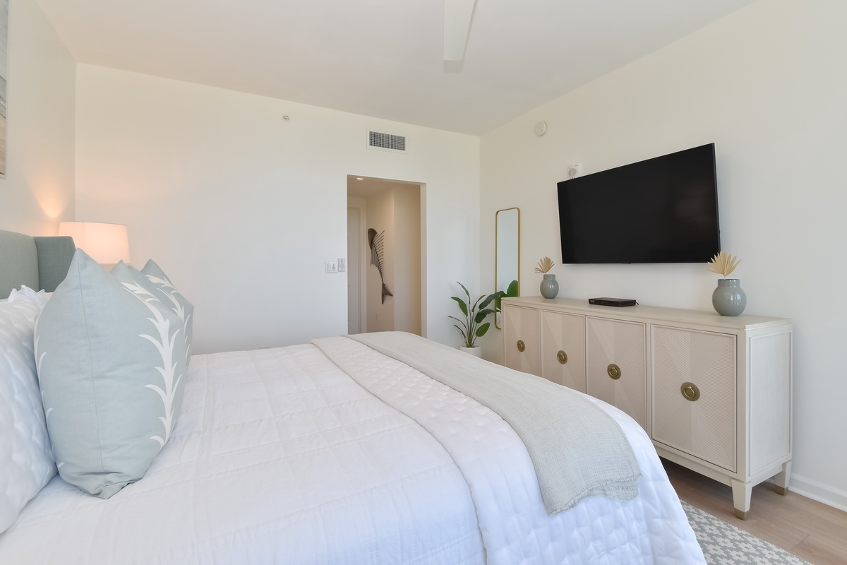 The master bedroom has incredible beach views and private access to the beach-facing balcony. There is even a beach-facing desk and bench to make remote working an absolute delight. Complete with a king bed, flat-screen TV, and private ensuite bathroom, the master bedroom was designed for relaxation after a day full of beach memories. The master bathroom features a beautiful soaking tub, a walk-in tiled shower with two shower heads, and double vanity. The guest bedroom also has a king bed, flat-screen TV, and private access to the beach-facing balcony. Just steps from both the guest bedroom and the living area is a full bathroom with a walk-in shower.