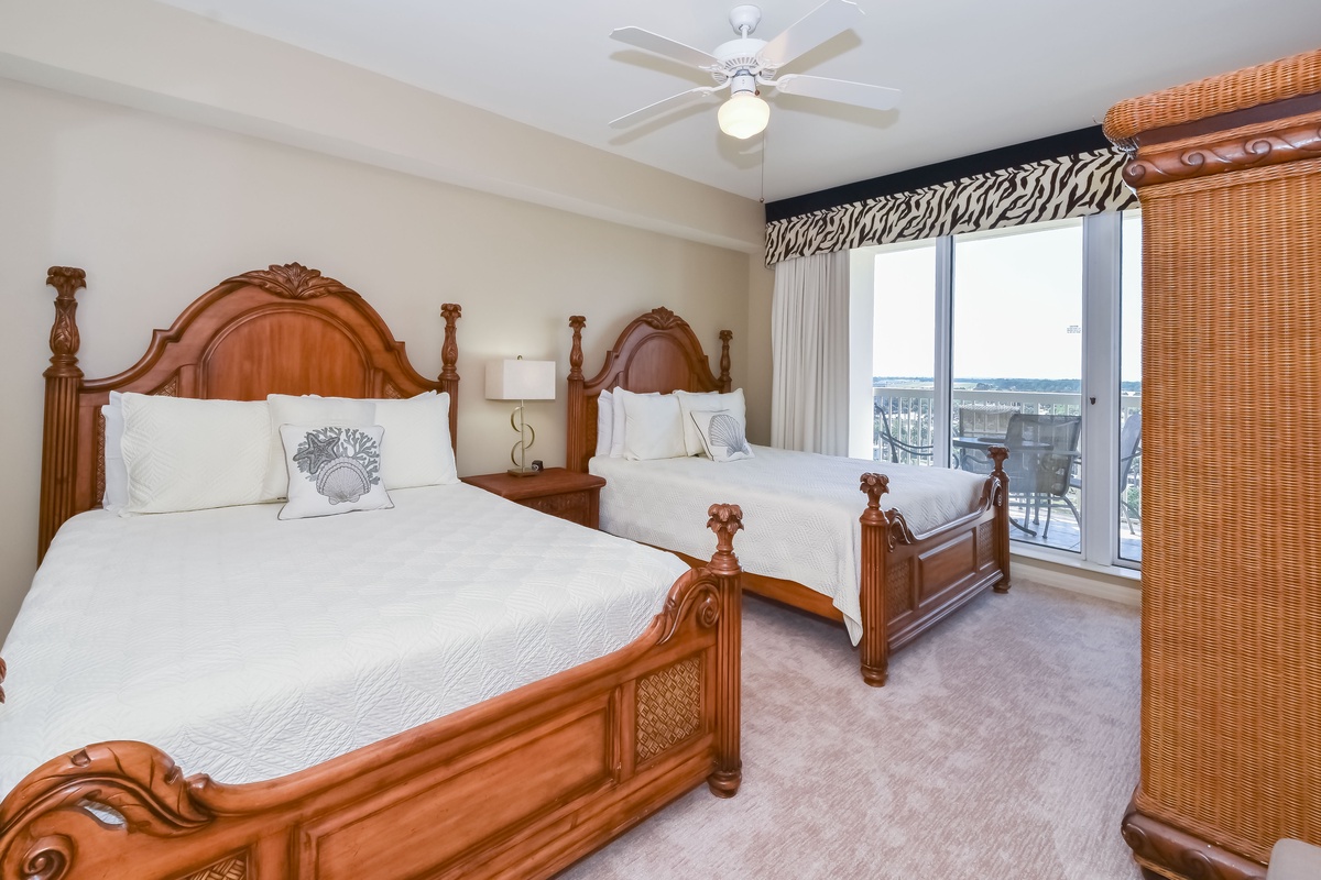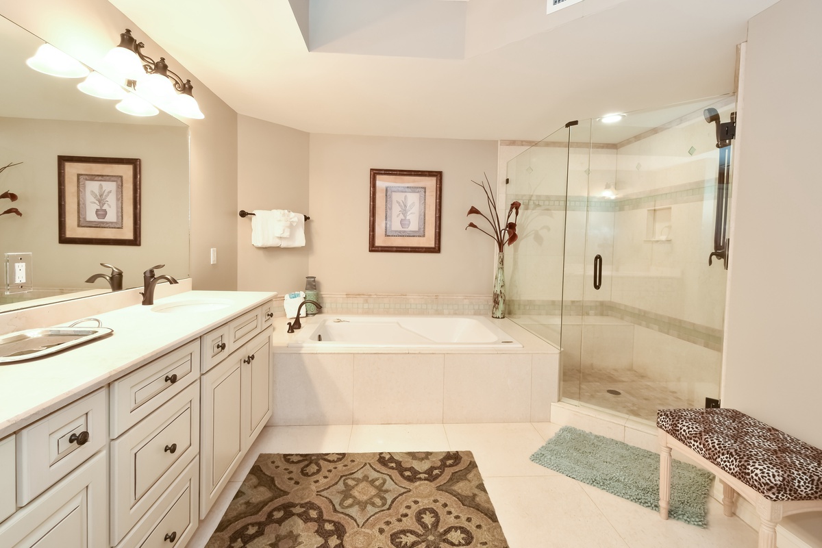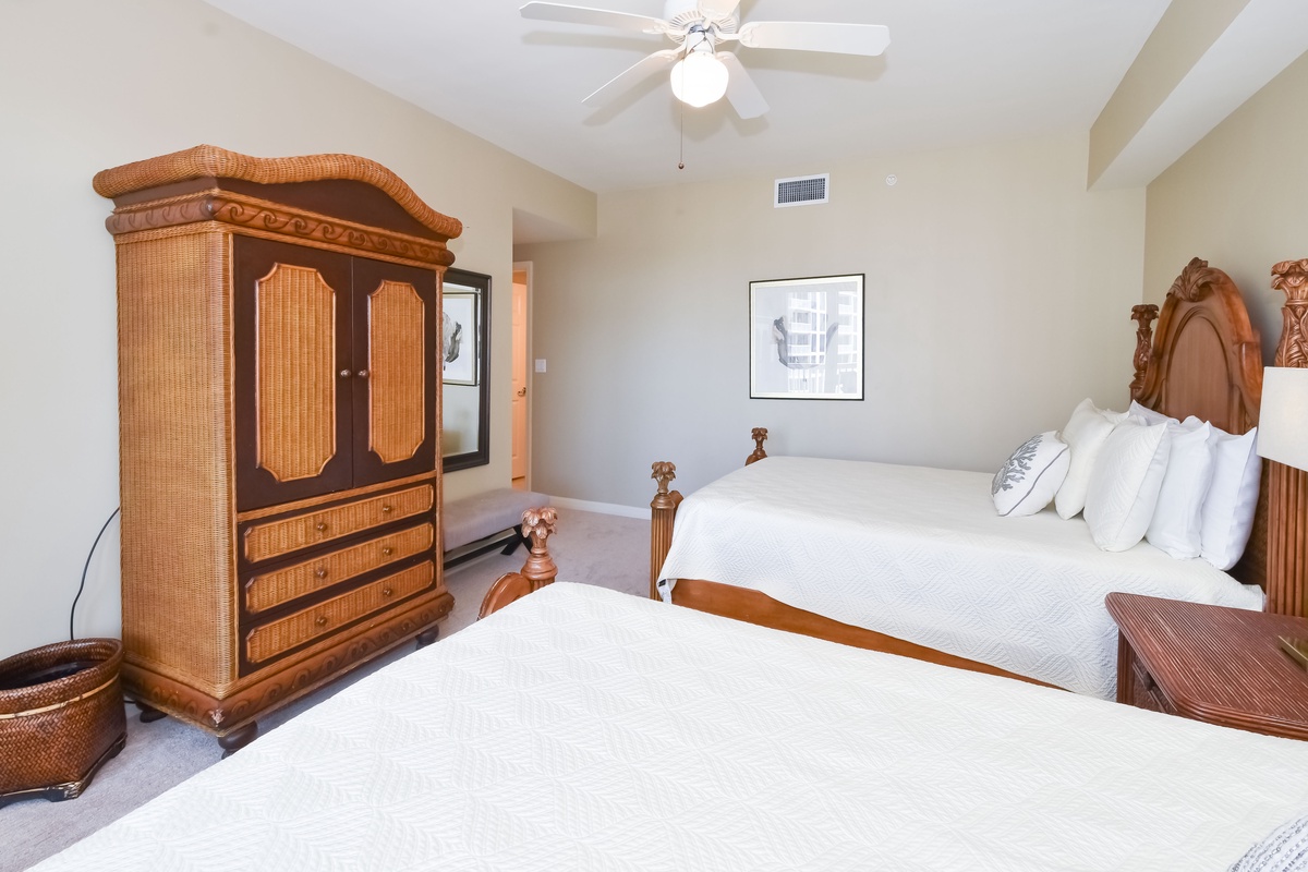 The master bedroom has incredible beach views and private access to the beach-facing balcony, complete with a king bed and flat-screen TV, designed with relaxation in mind. The master bathroom features a soaking tub, a walk-in shower, and double vanity. Both guest bedrooms face the north side of the resort and offer unbeatable views of the resort grounds. The first guest bedroom has a queen bed, flat-screen TV, and private access to the north balcony. The second guest bedroom has two queen beds, a flat-screen TV, and private access to the north balcony. The second guest bedroom has a private bathroom with a tub/shower combination. Just steps from the first guest bedroom and the living area is a full bathroom with a walk-in shower.