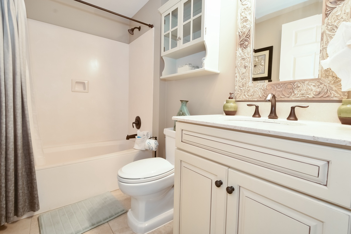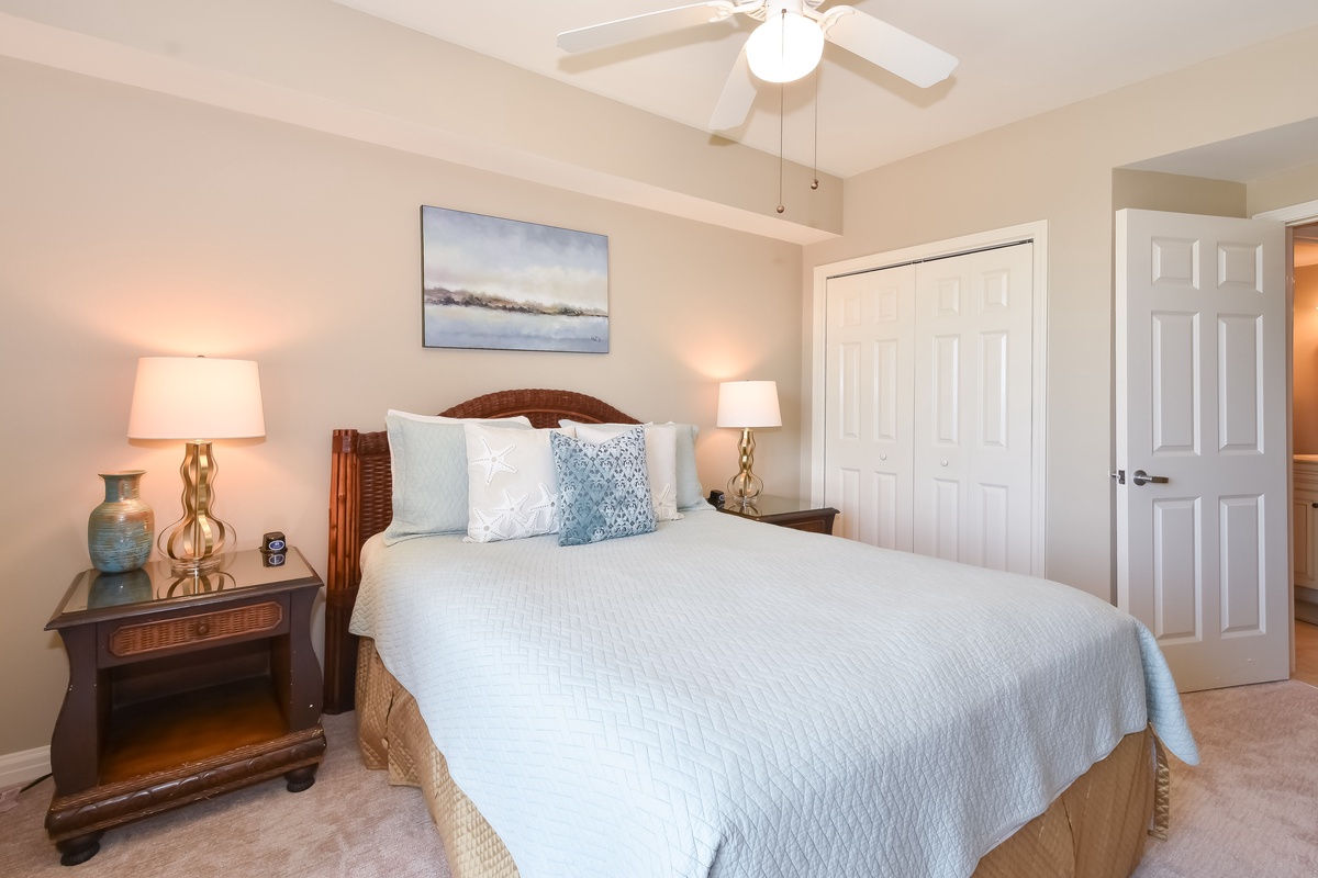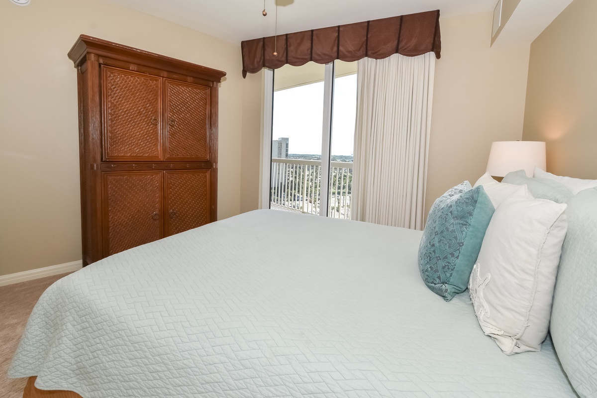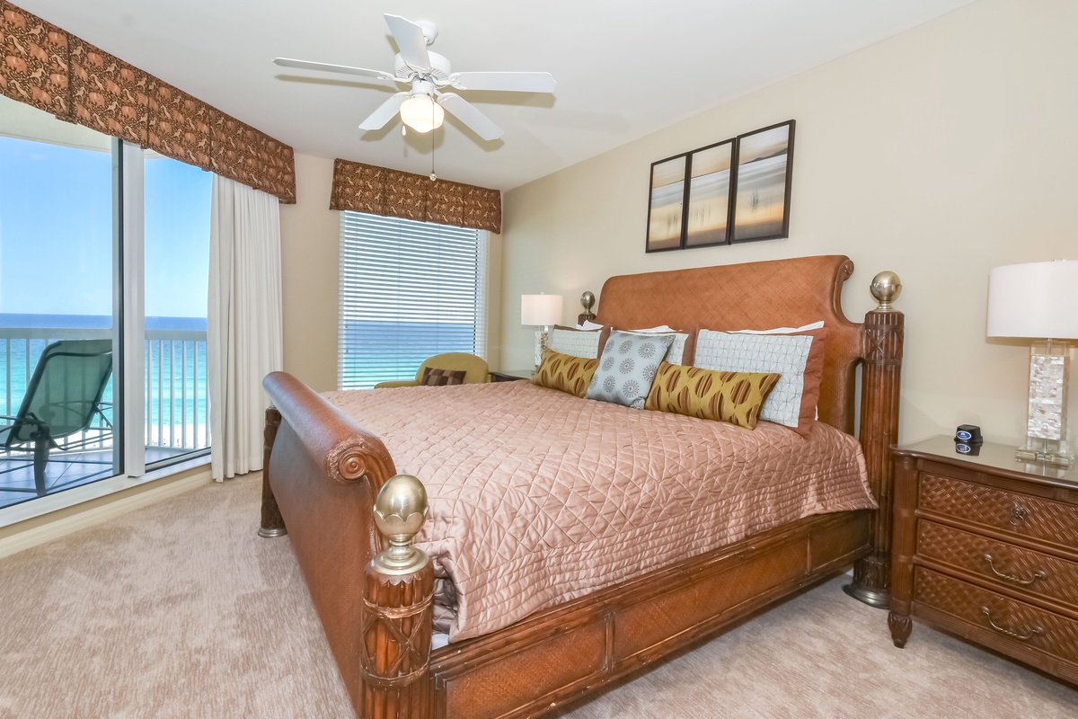The master bedroom has incredible beach views and private access to the beach-facing balcony, complete with a king bed and flat-screen TV, designed with relaxation in mind. The master bathroom features a soaking tub, a walk-in shower, and double vanity. Both guest bedrooms face the north side of the resort and offer unbeatable views of the resort grounds. The first guest bedroom has a queen bed, flat-screen TV, and private access to the north balcony. The second guest bedroom has two queen beds, a flat-screen TV, and private access to the north balcony. The second guest bedroom has a private bathroom with a tub/shower combination. Just steps from the first guest bedroom and the living area is a full bathroom with a walk-in shower.