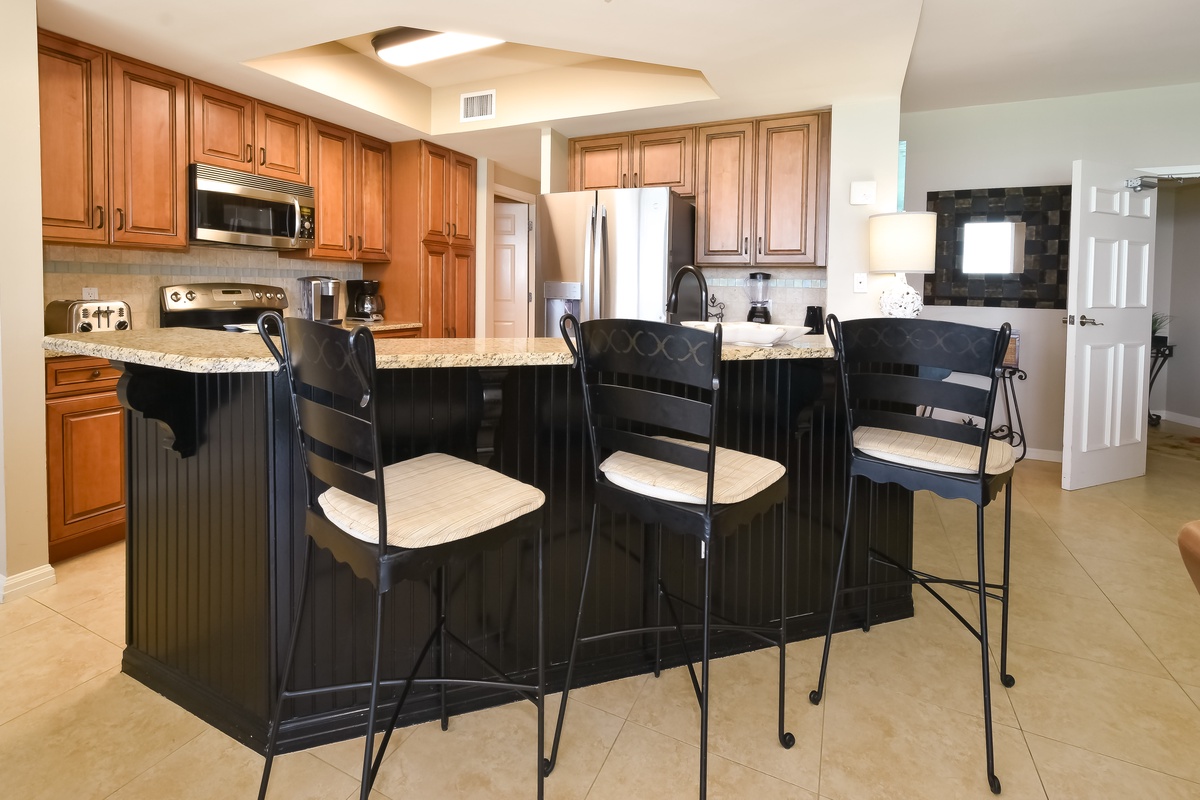 The interior spaces of Silver Shells St. Maarten 1004 have been tastefully decorated with a trendy beach theme. An open floor plan gives the whole family or group space to relax together. The living area is beach-facing, features floor-to-ceiling windows and sliding glass doors, and provides plenty of seating for everyone to gather around the flat-screen TV. The spacious beach-facing balcony is perfectly furnished to allow for entertaining or dining while taking in spectacular views of the white sand beach and emerald waters. The dining area has seating for four with additional three seats at the breakfast bar. The fully equipped kitchen includes full-size stainless steel appliances and all the cookware and dishware you could need for creating memorable meals.
