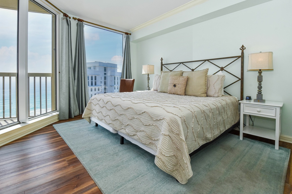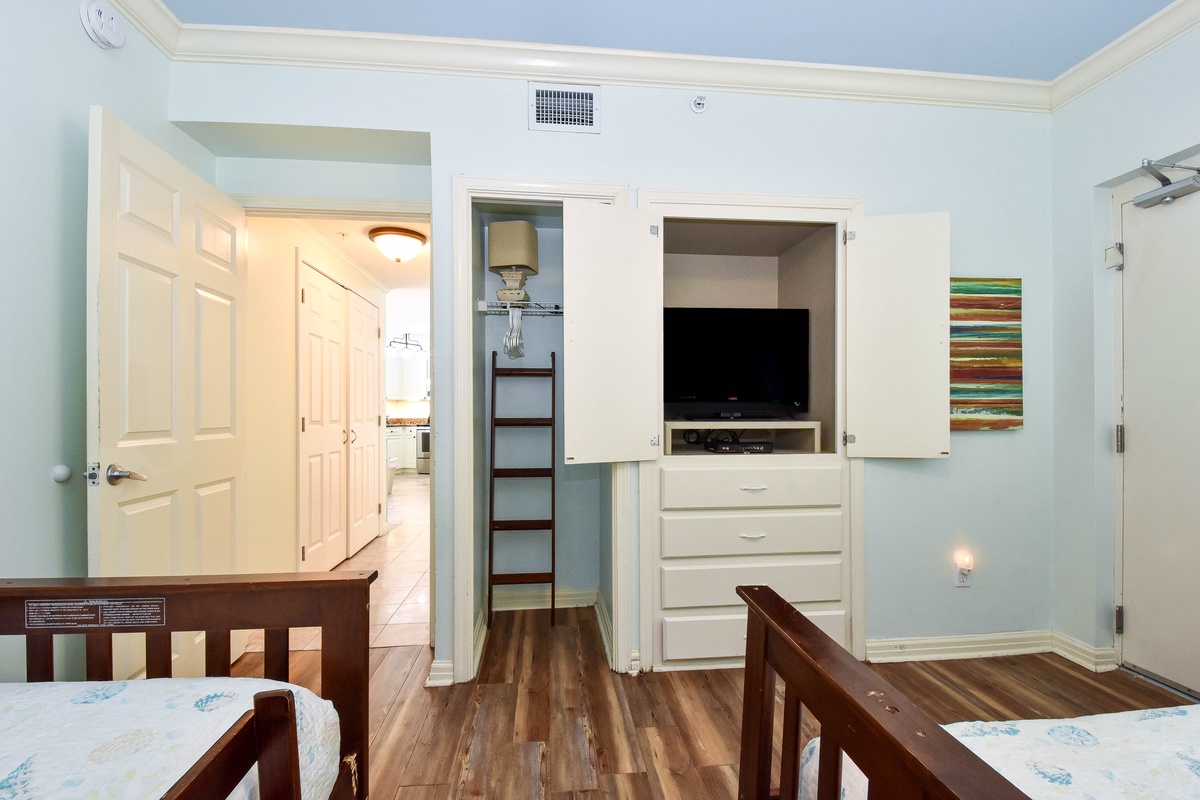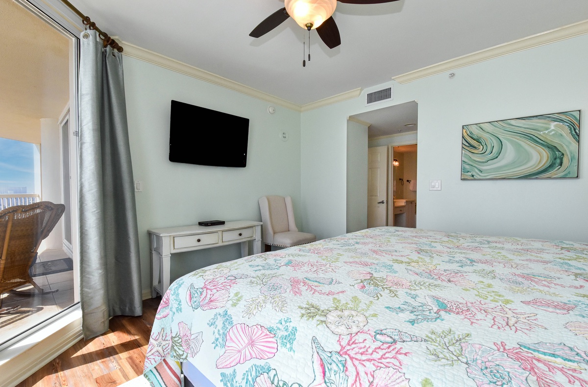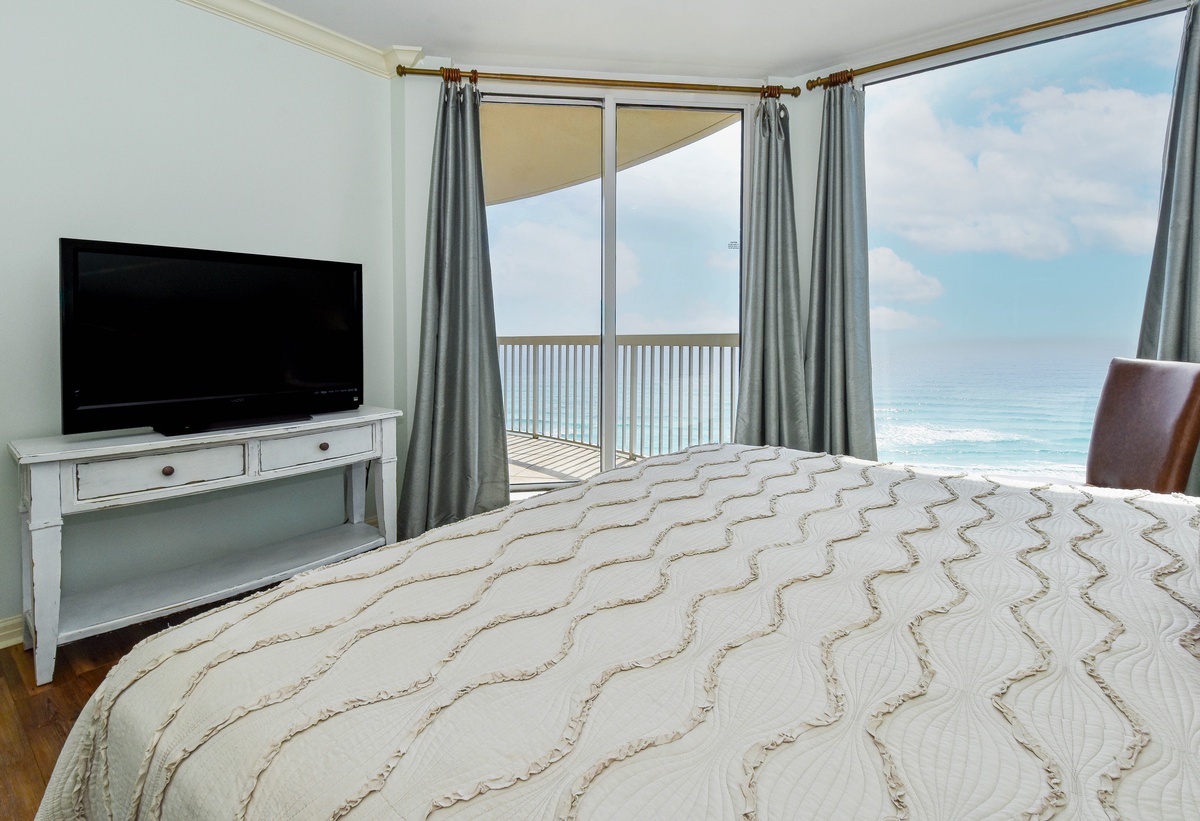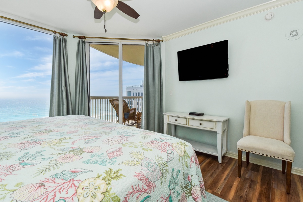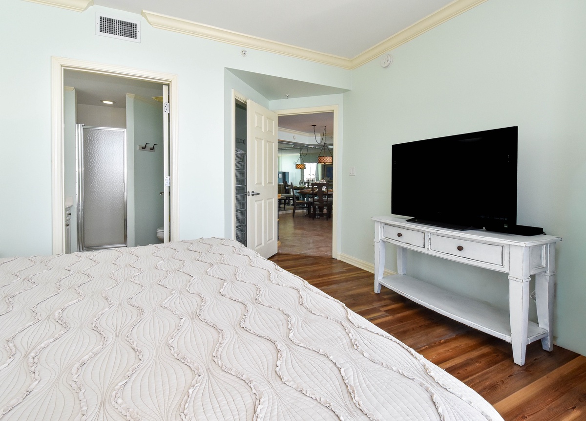 The primary bedroom has incredible beach views and private access to the beach-facing balcony. Complete with a king bed, flat-screen TV, walk-in closet, and private ensuite bathroom, the primary bedroom was designed with relaxation in mind. The primary bathroom features a jetted tub, walk-in shower, and double vanity. The first guest bedroom has a king bed, a flat-screen TV, and private access to the beach-facing balcony. The first guest bedroom has a private bathroom with a walk-in shower. The second guest bedroom has a twin bed and a full bed and a flat-screen TV. Just a few steps from both the second guest bedroom and the living area is a full bathroom with a walk-in shower.