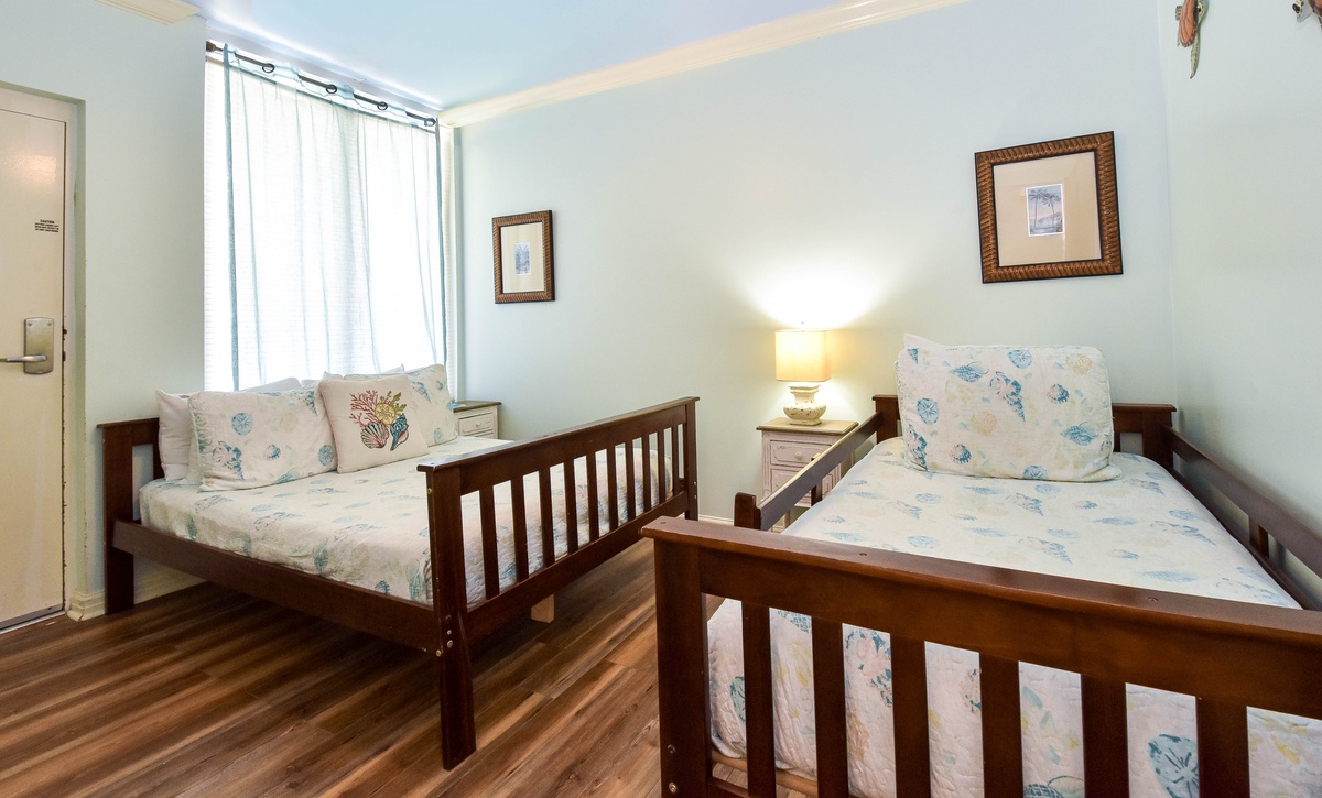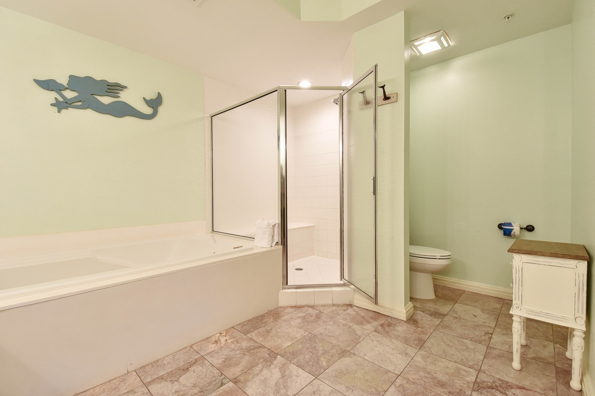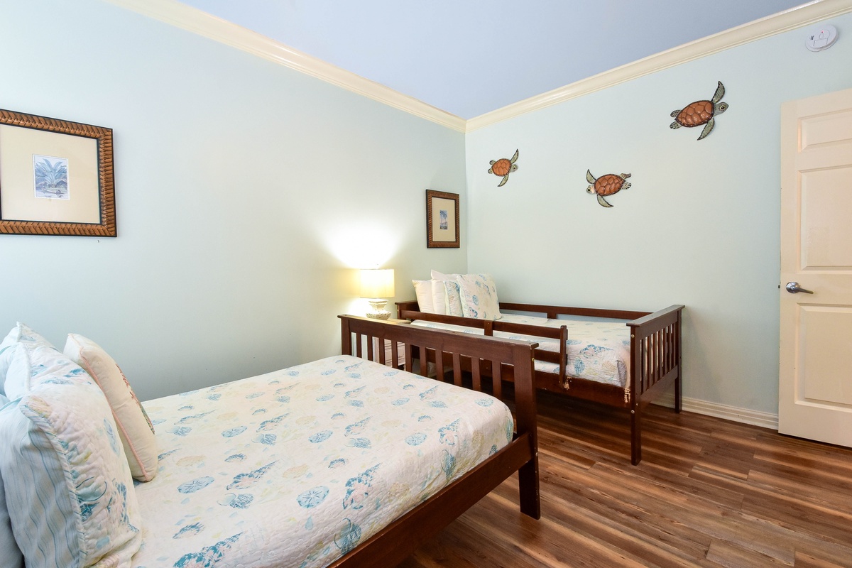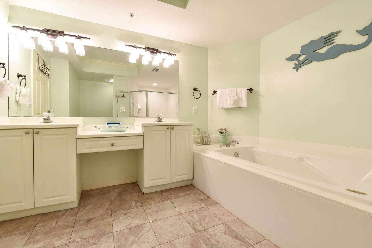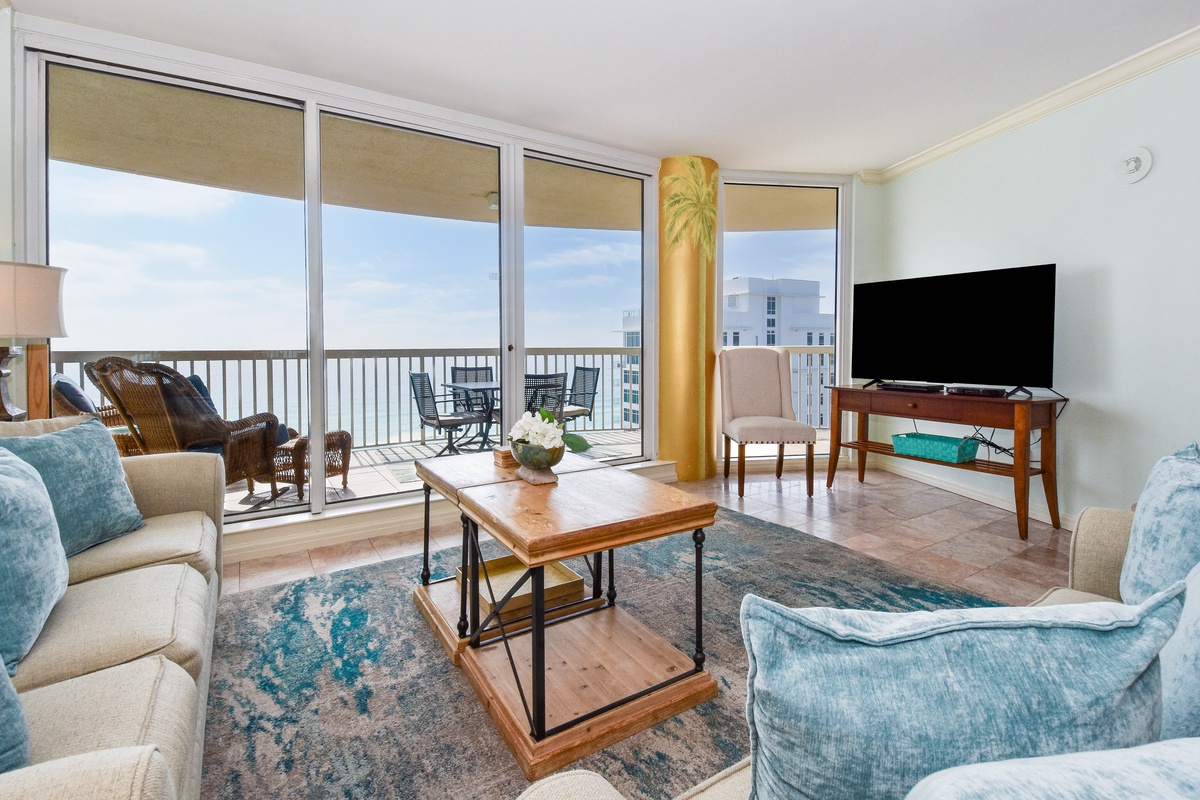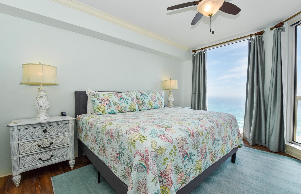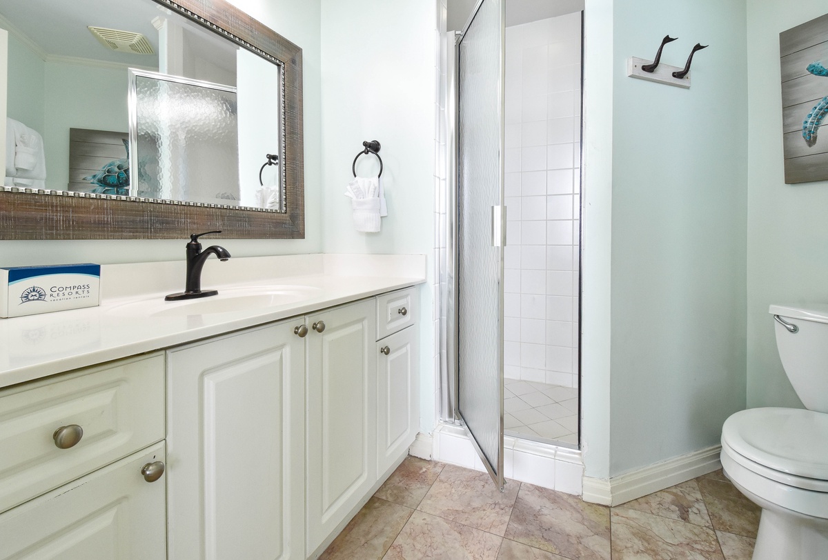 The primary bedroom has incredible beach views and private access to the beach-facing balcony. Complete with a king bed, flat-screen TV, walk-in closet, and private ensuite bathroom, the primary bedroom was designed with relaxation in mind. The primary bathroom features a jetted tub, walk-in shower, and double vanity. The first guest bedroom has a king bed, a flat-screen TV, and private access to the beach-facing balcony. The first guest bedroom has a private bathroom with a walk-in shower. The second guest bedroom has a twin bed and a full bed and a flat-screen TV. Just a few steps from both the second guest bedroom and the living area is a full bathroom with a walk-in shower.