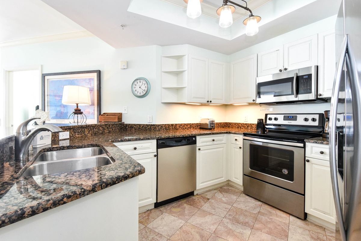 The interior spaces of Silver Shells St. Maarten 1107 have been tastefully decorated with a trendy coastal theme. An open floor plan gives the whole family or group space to relax together. The living area is beach-facing, features floor-to-ceiling windows and sliding glass doors, and offers plenty of seating for everyone to gather around the flat-screen TV. The couch even converts to a queen sleeper sofa for larger parties. The spacious beach-facing balcony is perfectly furnished to allow for entertaining or dining while taking in spectacular views of the white sand beach and emerald waters. The dining area has seating for four with additional seating for two at the breakfast bar. The fully equipped kitchen includes full-size stainless steel appliances and all the cookware and dishware you could need for creating memorable meals.