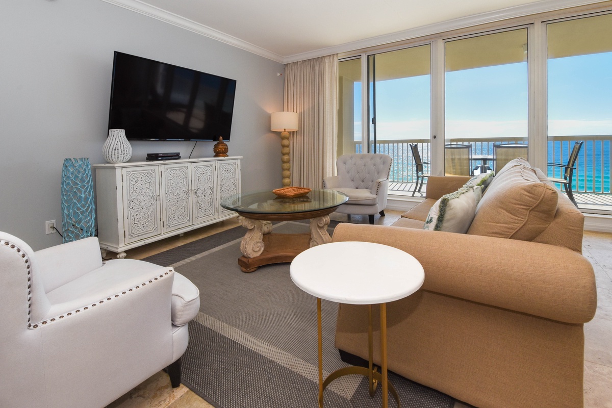 Welcome to Silver Shells St. Maarten 1204, a beautifully appointed three-bedroom, three-bathroom condo on the twelfth floor of one of Destin’s premier beachfront resorts. Enjoy stunning views of the Emerald Coast from your private balcony and easy access to the resort’s private beach, just steps away. The open-concept living and dining areas feature floor-to-ceiling windows, a flat-screen TV, and ample seating, including a sleeper sofa for extra guests. The fully equipped kitchen offers stainless steel appliances, granite countertops, and a breakfast bar with seating for four. The dining table seats six, perfect for family meals. All mattresses are medium to firm, providing supportive comfort after a day in the sun. The primary suite includes beautiful beach views, balcony access, a king bed, flat-screen TV, and a private bathroom with a garden tub, walk-in shower, and double vanity. The first guest bedroom has a full bed, a flat-screen TV, and access to the north-facing balcony. The second guest bedroom features two queen beds, a flat-screen TV, and a private bathroom with a walk-in shower. A third full bathroom with a walk-in shower is located off the living area, and a washer and dryer are also included for your convenience. Enjoy a relaxing beach getaway at St. Maarten 1204, where comfort meets style in the heart of Destin!