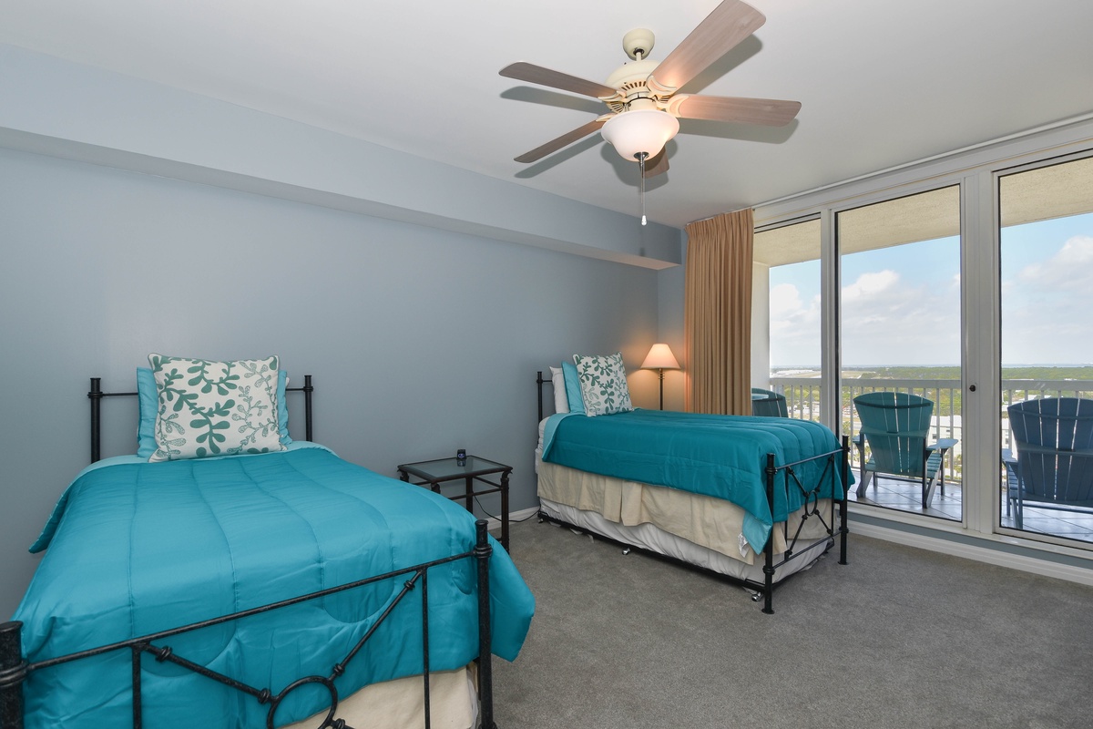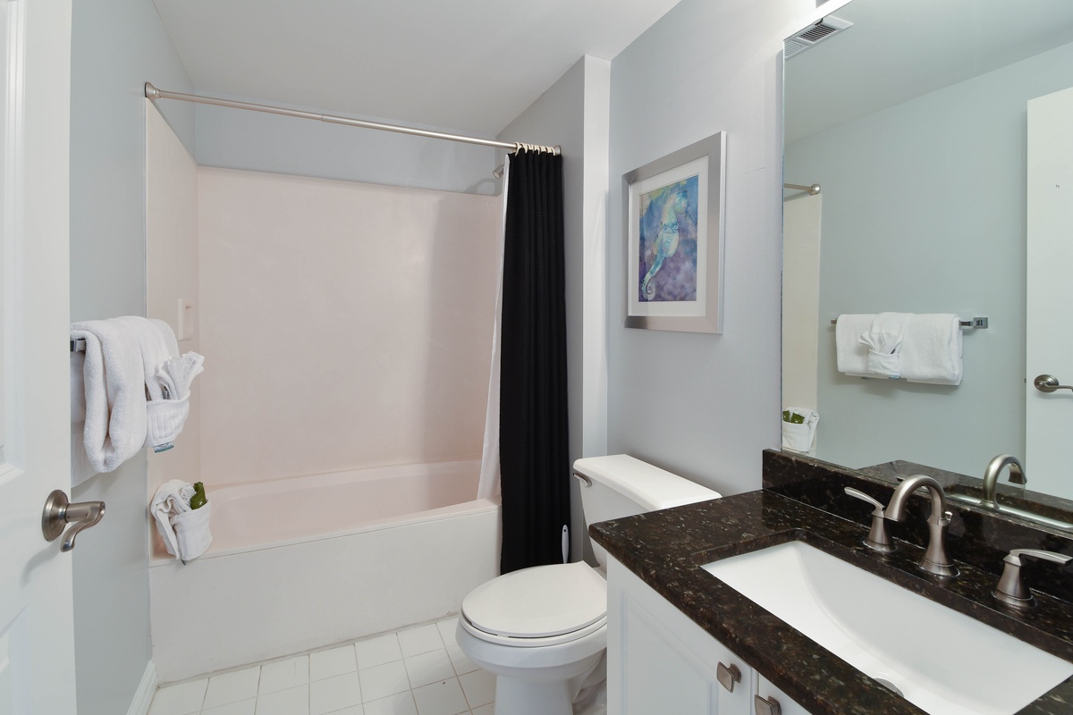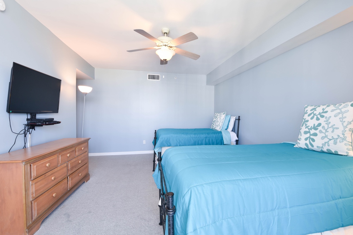 The master bedroom has incredible beach views and private access to the beach-facing balcony. Complete with a king bed, flat-screen TV, and private ensuite bathroom, the master bedroom was designed with relaxation in mind. The master bathroom features a luxurious jacuzzi tub, walk-in shower, and double vanity. Both guest bedrooms face the north side of the resort and offer unbeatable views of the resort grounds. The first guest bedroom has a king bed, a flat-screen TV, and private access to the north balcony. The second guest bedroom has two twin beds with twin trundle beds, a flat-screen TV, and private access to the north balcony. The second guest bedroom has a private bathroom with a tub/shower combination. Just steps from both the first guest bedroom and the living area is a full bathroom with a walk-in shower.